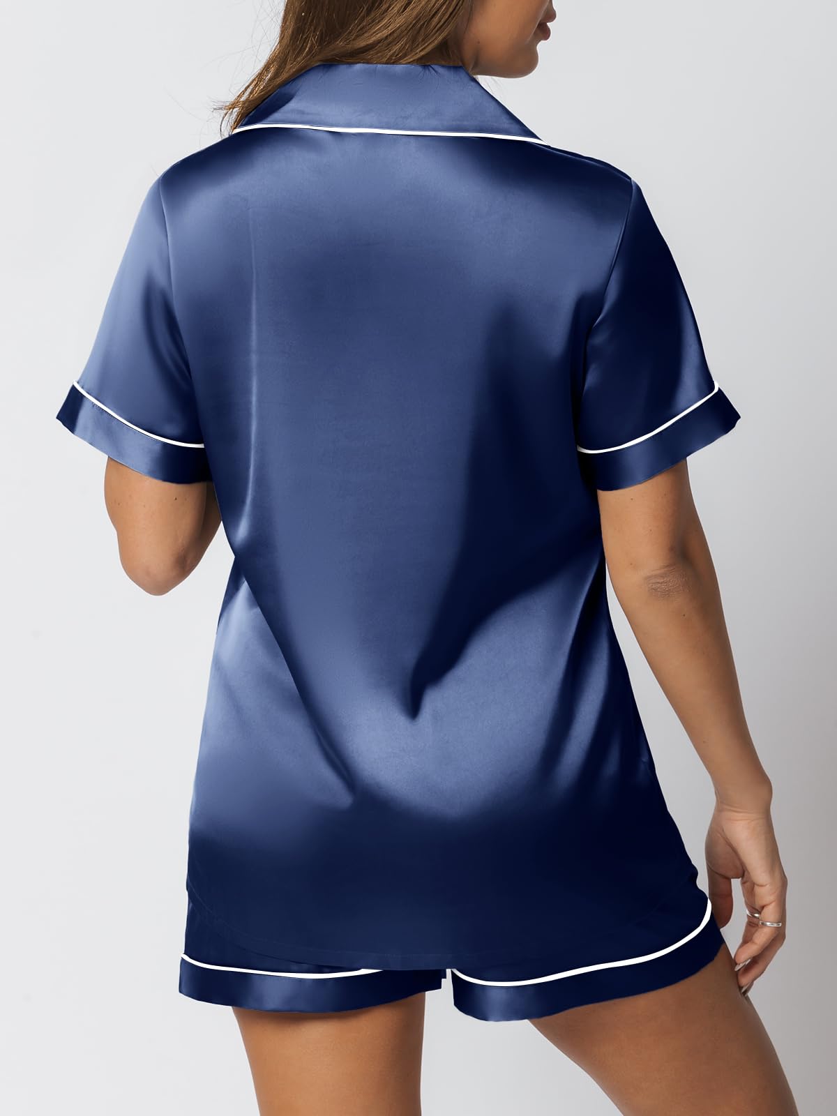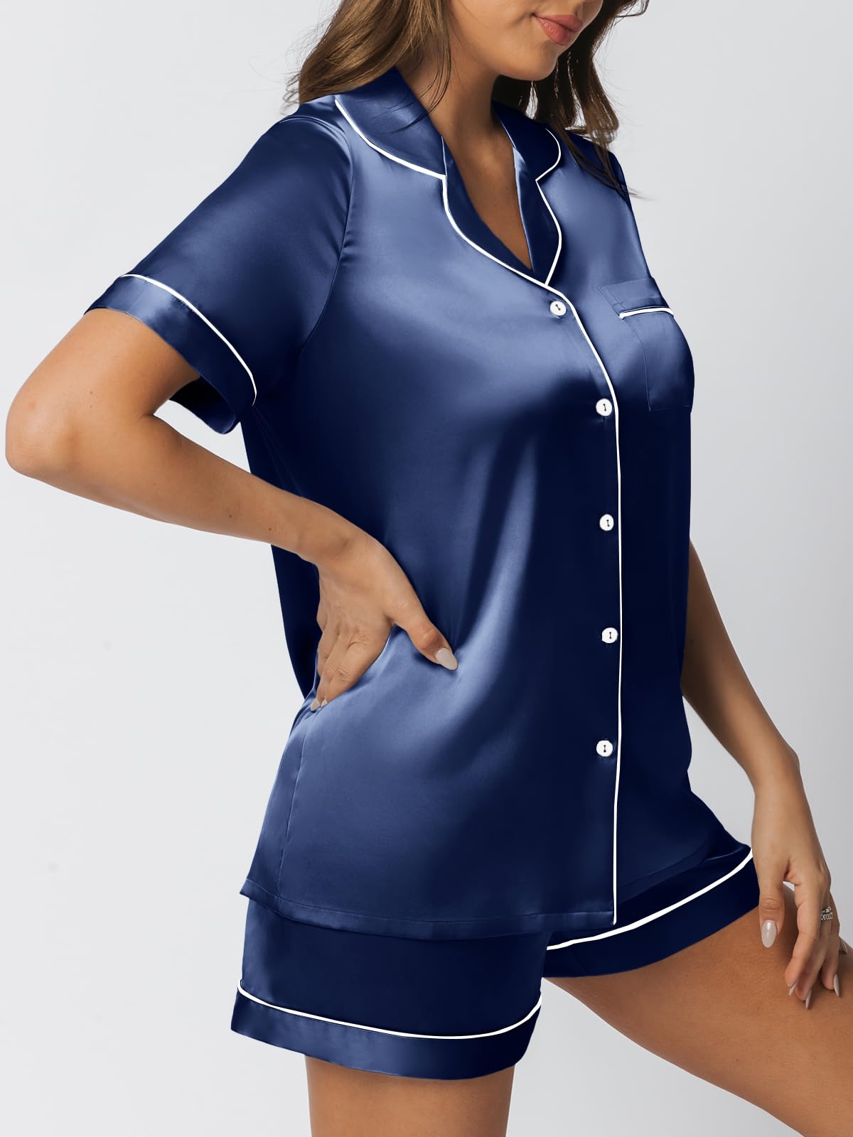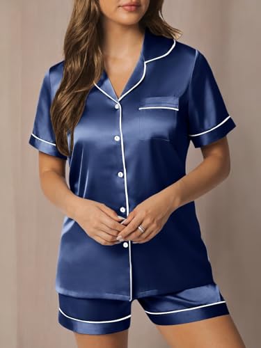 Pajama Top: Short sleeve sleepwear with notch collar,button front pajamas shirt and one chest pocket design.Lightweight and Skin-friendly silk pajamas for women.Great for sleeping,casual wear or lounging around the house or yard all day.