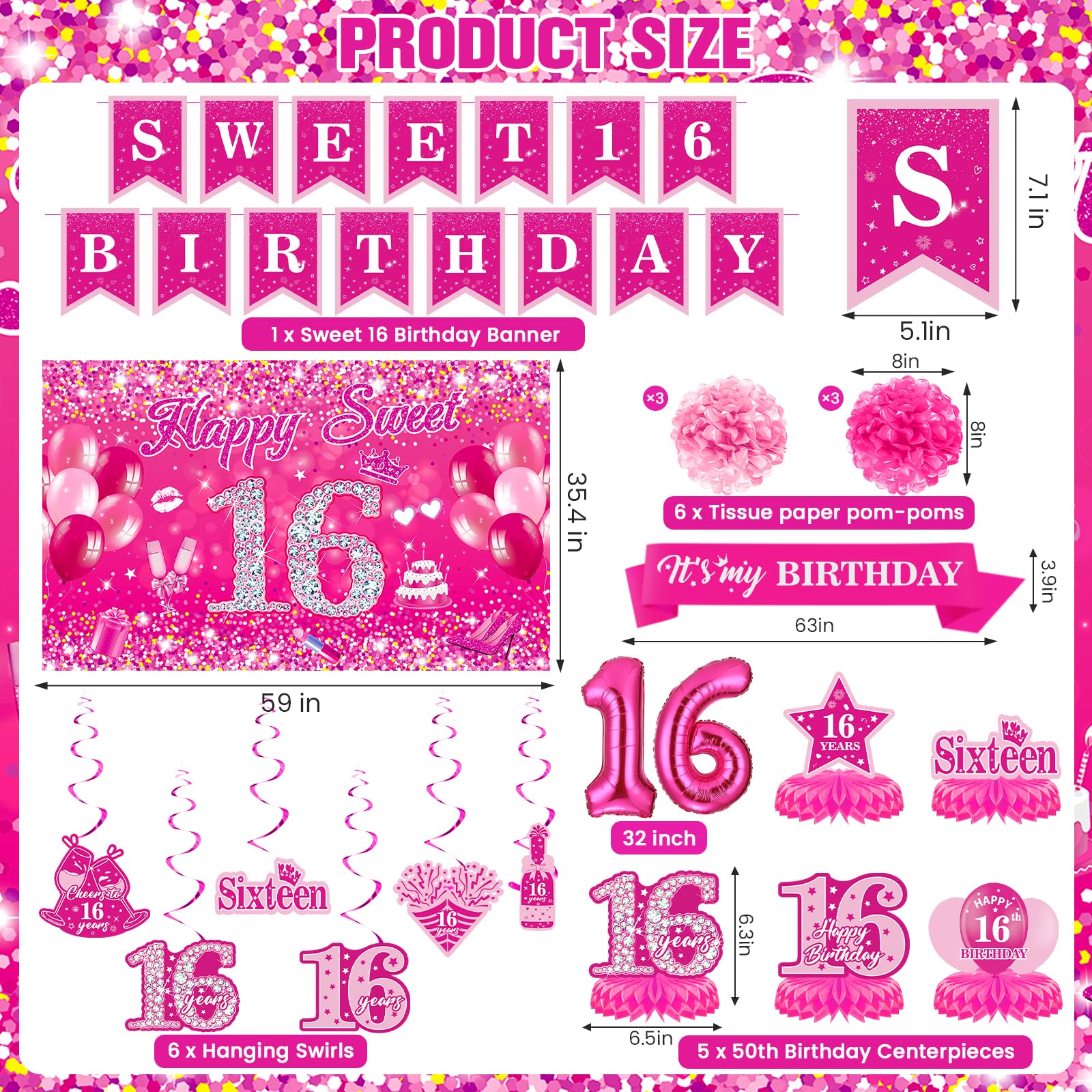 Specifications: Color: Pink, hot pink Size: As picture shows Material: Paper, latex and foil Package Includes: 1 x Pink "Happy Sweet 16" Birthday Banner 1 x Hot pink Sweet 16 Birthday Bunting Banner 5 x 16th birthday honeycomb centerpieces 6 x 16th birthday hanging swirls 6 x Pink and hot pink tissue paper pom poms 1 x Hot pink birthday sash