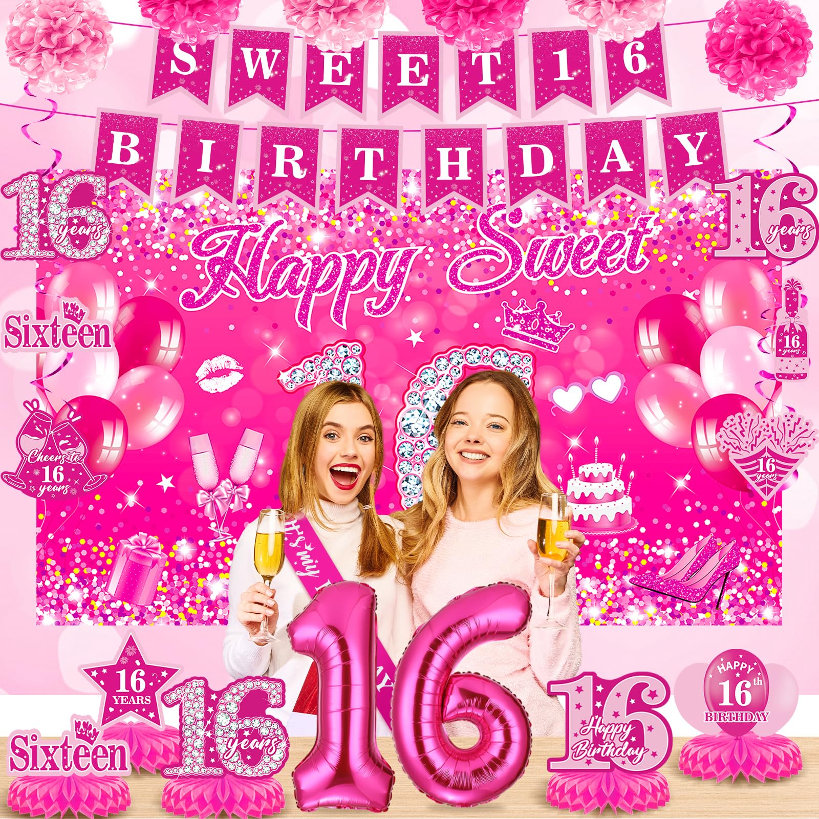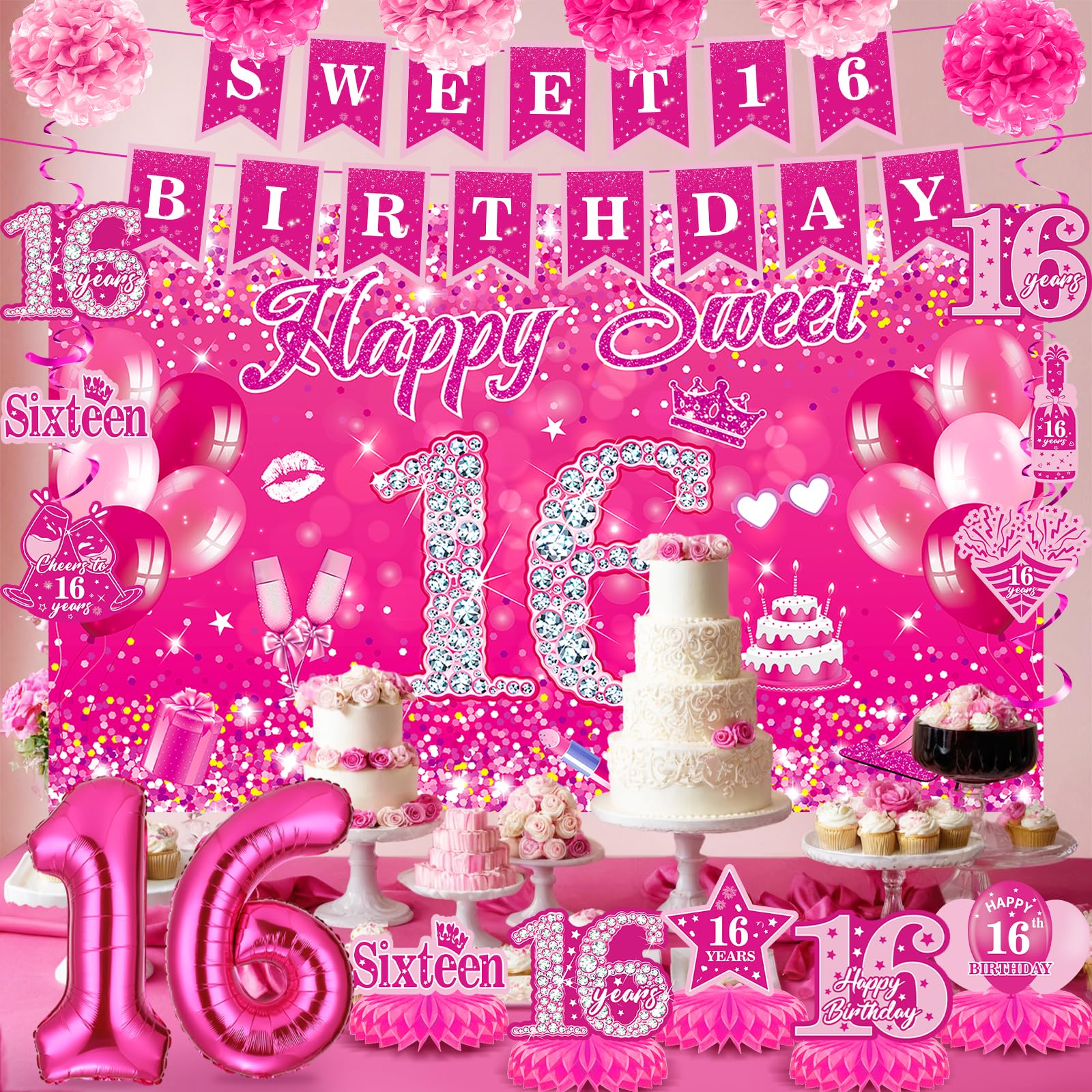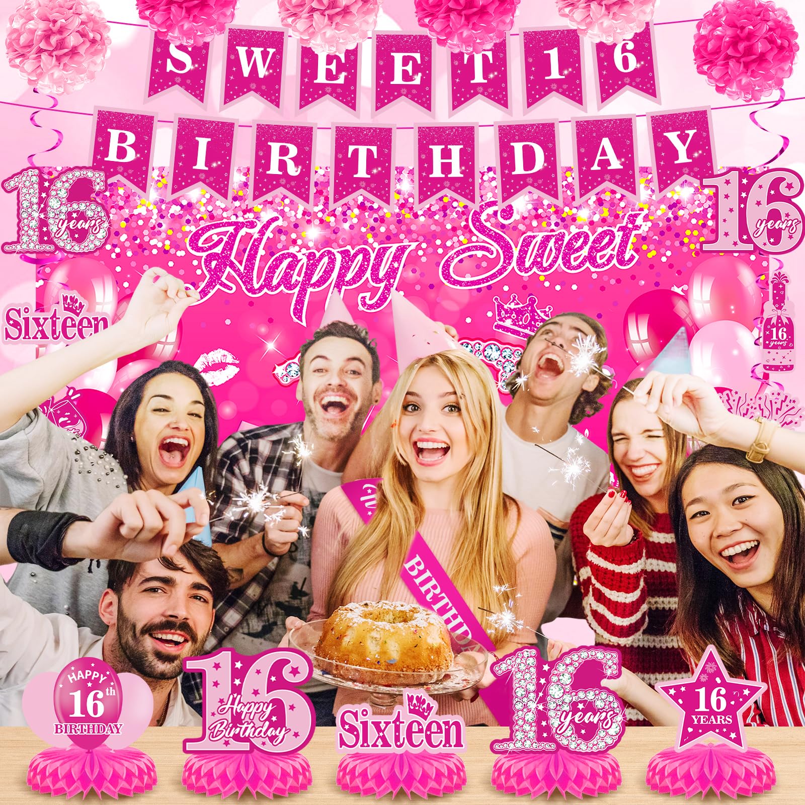 Pink Sweet 16 Birthday Decorations: These sweet 16 birthday decorations are designed with rich pink 16th patterns, "Happy Sweet 16 Birthday" banner,"16 Years" and "Sixteen" table centerpieces and hanging swirls, combines with these pink paper pom poms and birthday sash to decorate your memorable 16th birthday party