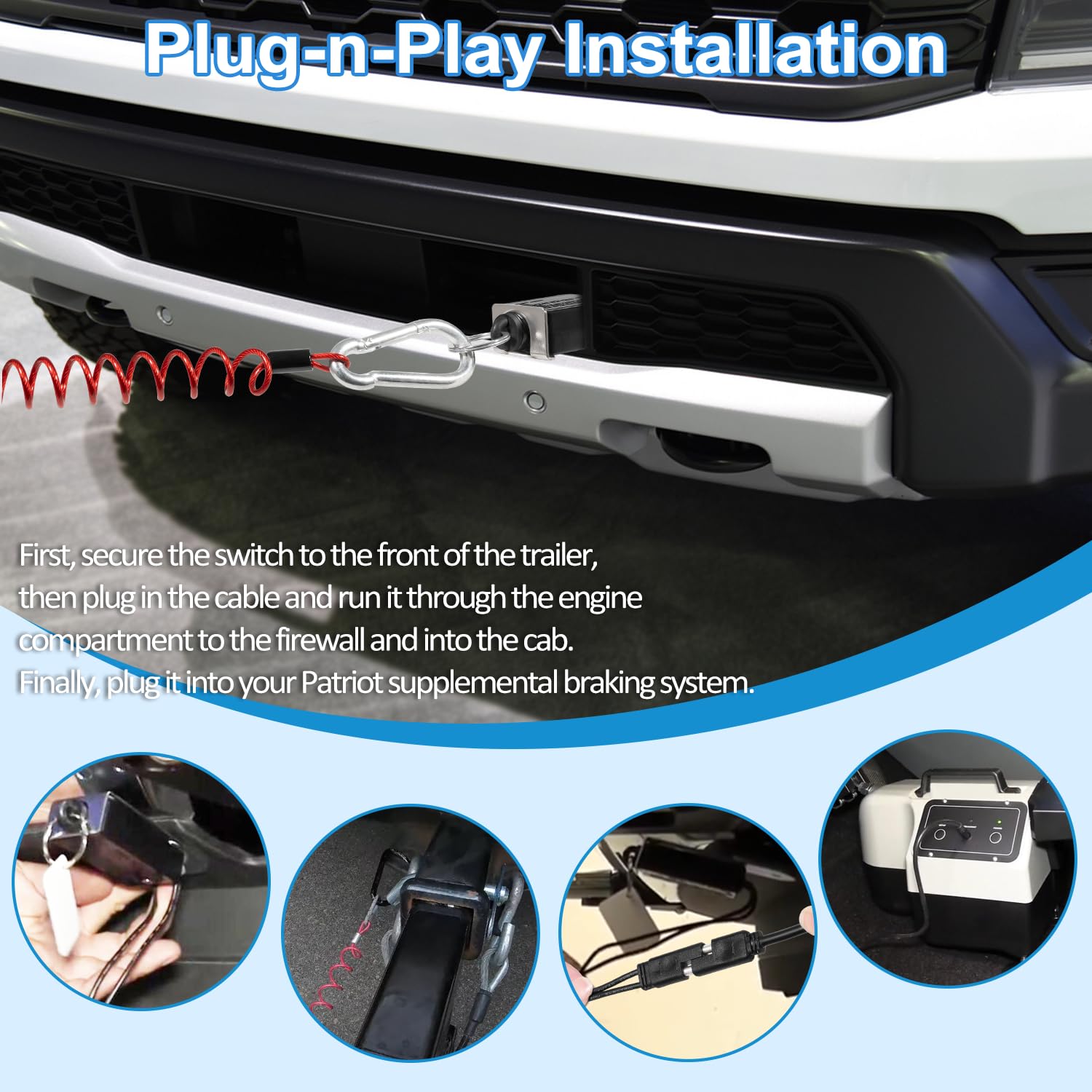 【Plug-n-Play Installation】: 2 different ways to attach the breakaway device to the Brake. Method 1: Through the firewall; Method 2: Feeding the cable through the door/window. First, secure the switch to the front of the trailer, then plug in the cable and run it through the engine compartment to the firewall and into the cab. Finally, plug it into your Patriot supplemental braking system.