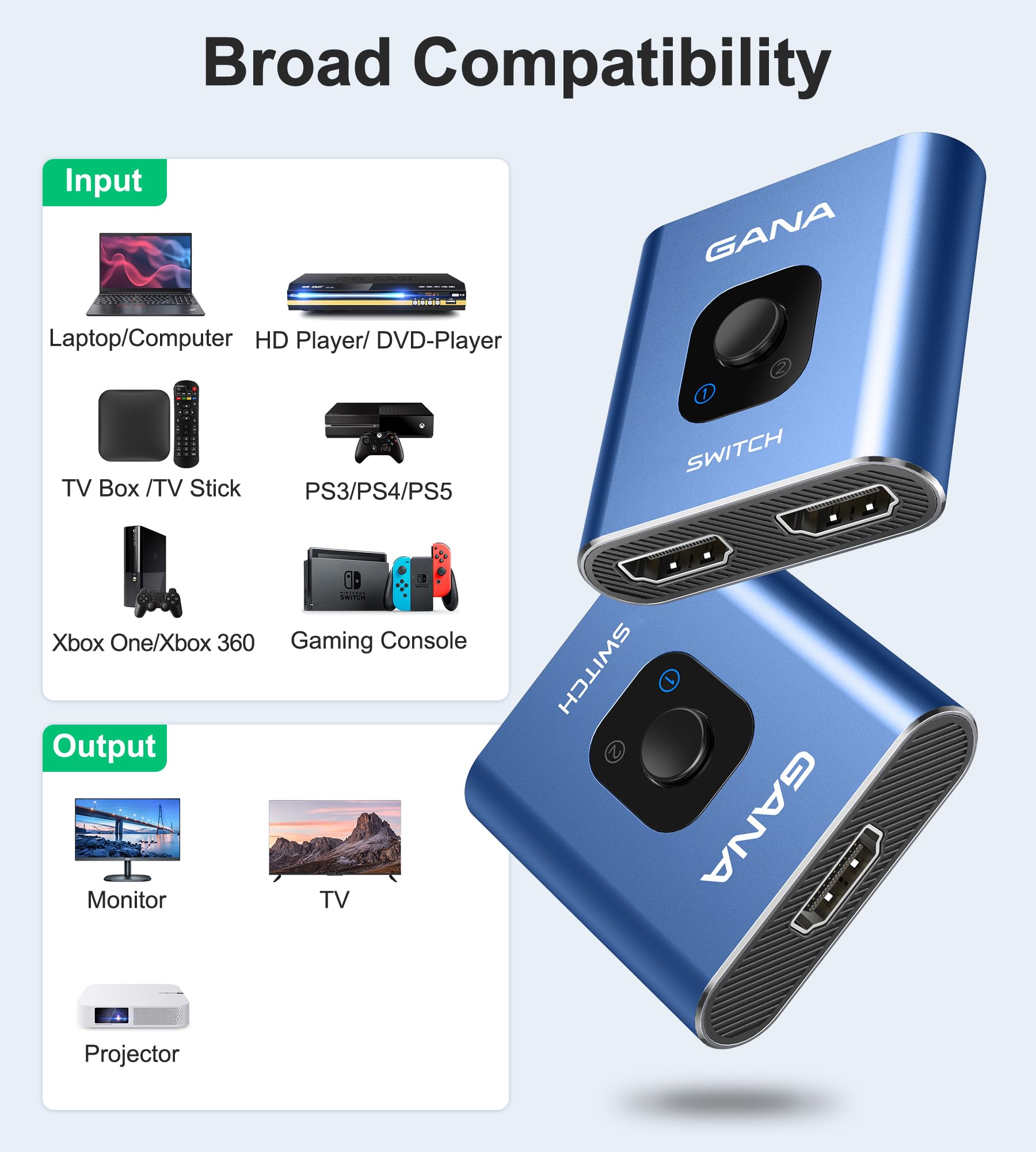 【Broad Compatibility】 HDMI Splitter Switcher compatible for most standard HDMI port devices. Support Input: Laptops, computer, XBox 360, XBox One, PS4/ PS5 ,Blu-Ray DVD player etc. Output: HD-Ready or Full HD TVs, monitors, projectors etc.