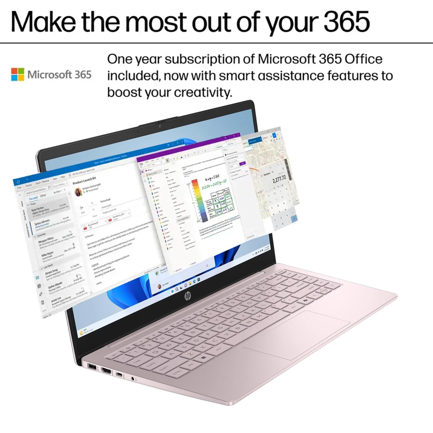 【Processor】 Intel Processor N150 (up to 3.6 GHz, 6 MB Intel Smart Cache, 4 Cores, 4 Threads) 【Graphics】 Intel Graphics 【OS】 Windows 11 Home 64-bit 【Memory】 32GB DDR4 SDRAM 【Hard Drive】 1.6TB Storage (128GB SSD + 512GB Portable Drive + 1TB OneDrive) 【 Display 】 14-inch diagonal, HD (1366 x 768), micro-edge, BrightView, 220 nits, 45% NTSC 【Wireless】 Wi-Fi 6, 802.11ax 2x2 + Bluetooth 5.4 【Audio】 High Definition (HD) Audio, Stereo speakers, 1.5W x2 【Keyboard】 US English, NonBacklit Full Size Keyboard 【Webcam】 HD 720p 【Ports】 1 x USB 2.0 1 x USB 3.2 Gen 1 1 x USB-C 3.2 Gen 1 (support data transfer only) 1 x AC smart pin 1 x HDMI 1.4b 1 x Headphone / Mic Combo Jack 1 x Multi-Format SD Media Card Reader 【Battery】 Up to 12 Hours 【Color】 Tranquil Pink 【Dimensions】 12.76 x 8.86 x 0.71 【Weight】 3.24 lbs 【Bundle】 1 x 512GB External Hard Drive 1 x Microfiber Cloth 1 x Hotkey Sticker