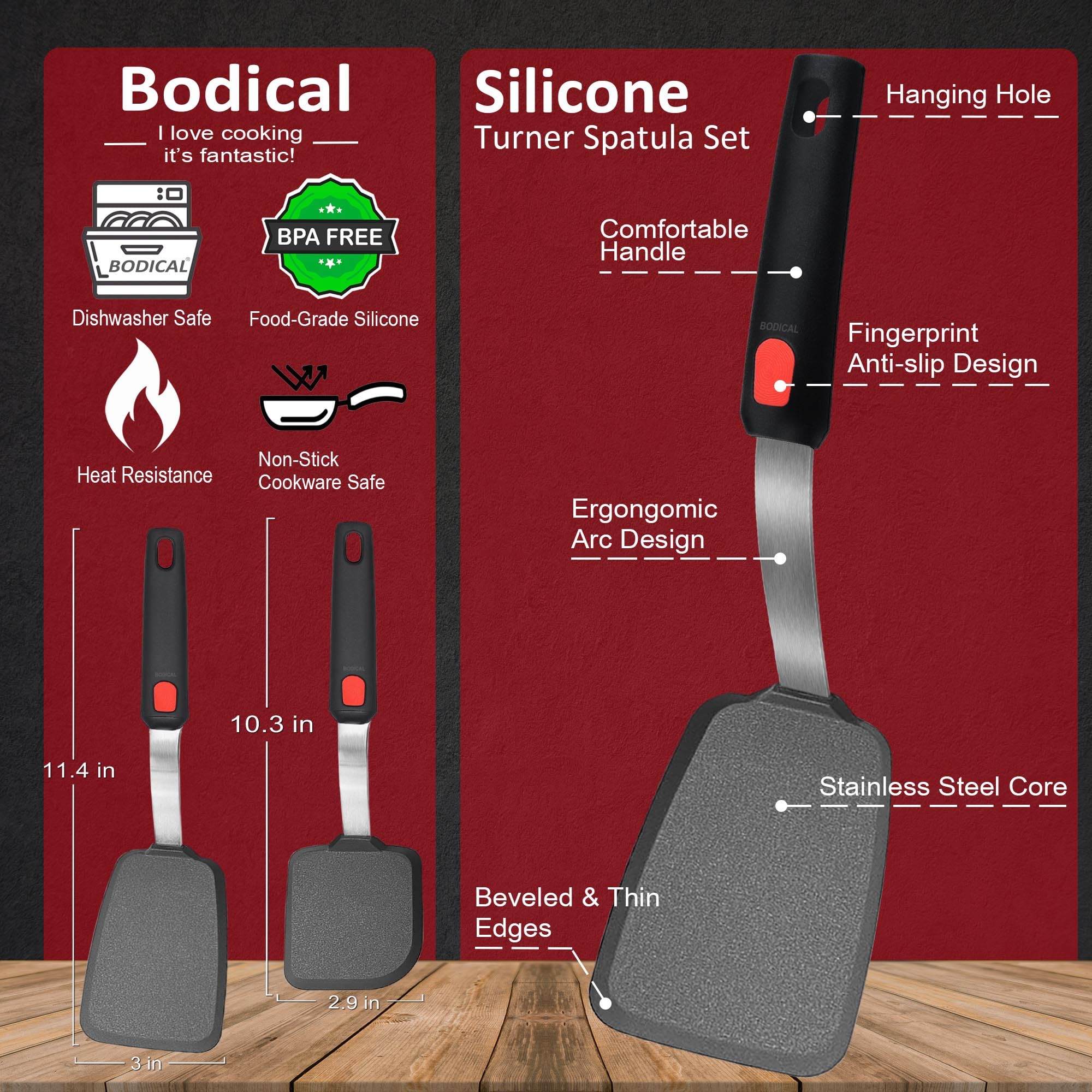 SILICONE SPATULA SET - Pack with large and small spatula turner set. Constructed with a easy grip nonslip handle, outer silicone layer bonded with a stainless-steel plate. Flippers for eggs, cookie, pancake, burgers, crepes and more.