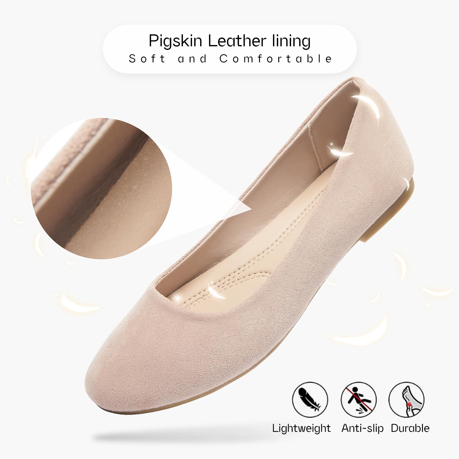 2. Elegant Suede Upper: The upper of ballet flats for women is made of suede fabric which looks elegant and fashionable. These upper material of womens flats is breathable which can be worn in summer.