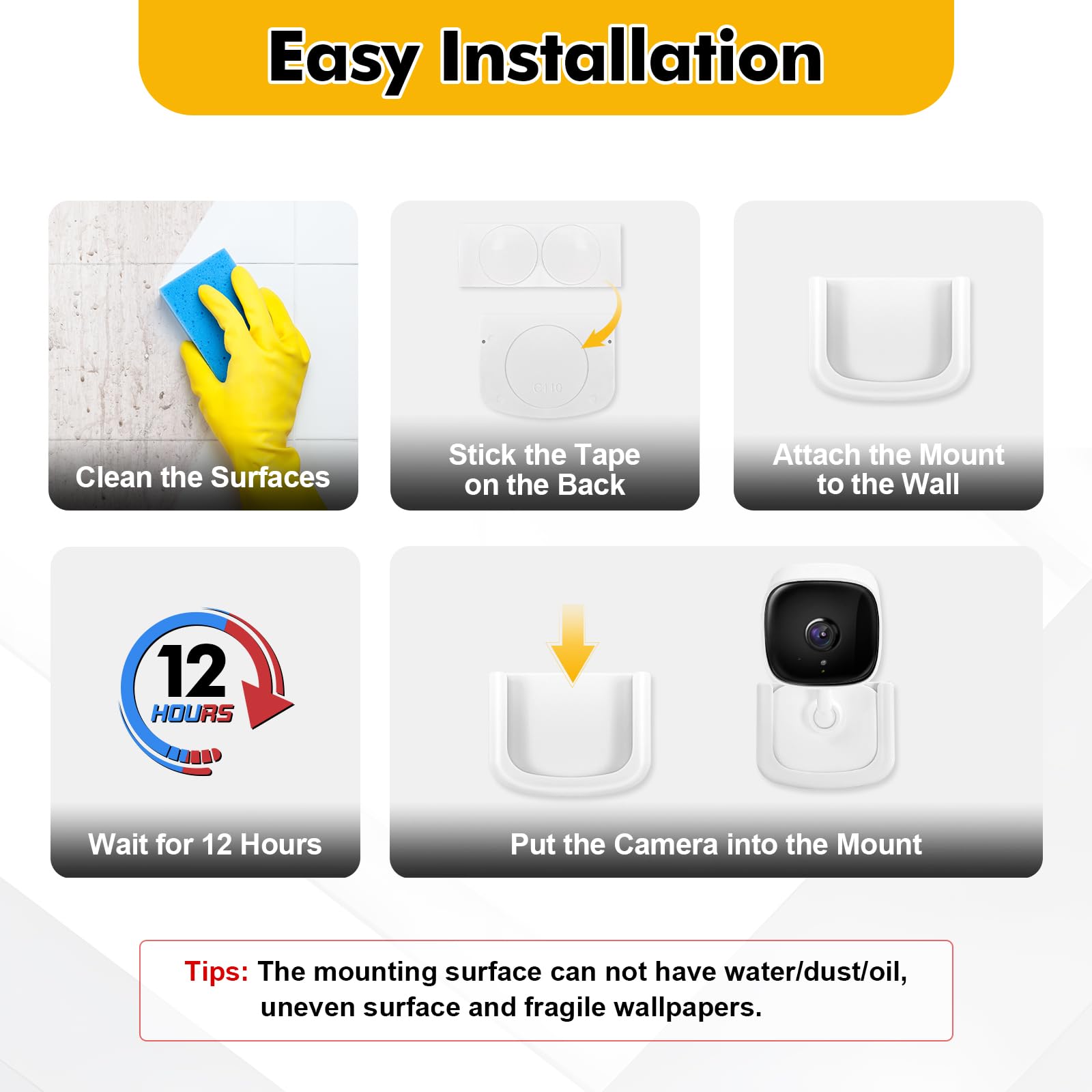 Package Includes: 2 security camera mount with strong adhesive tape (Cameras not included). For best results, it is recommended to wait 12 hours after mounting to ensure the adhesive fully sets on the desired smooth surface.