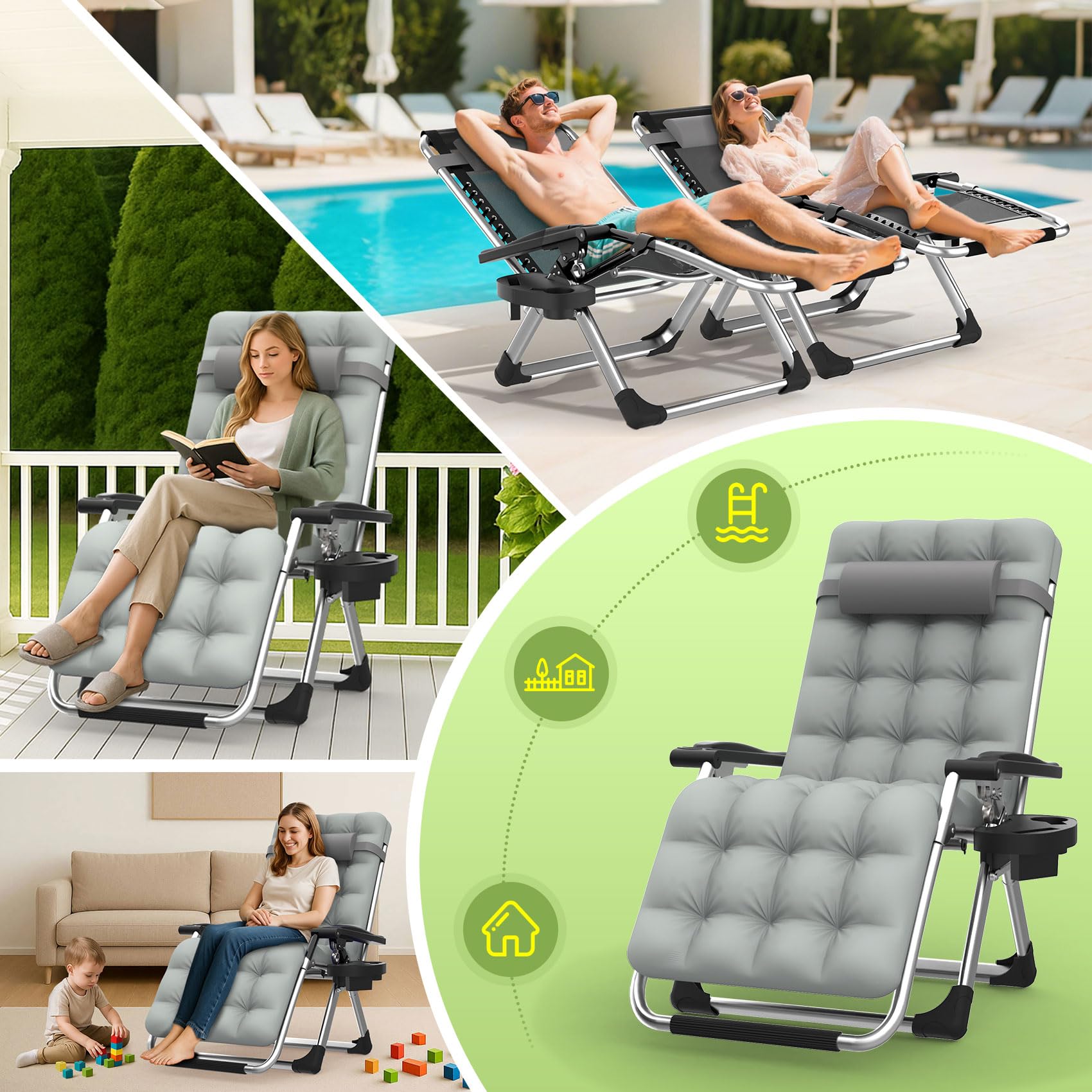 【4" Thicker Cushion, Cup Holder Pillow】The zero gravity lounge chair with a 4" cushion provides enhanced softness and comfort. The cushion is detachable, ensuring good ventilation even in the summer, making it suitable for use in both winter and summer. The multifunctional cup holder provides storage for items such as phones, water bottles, keys, and more. The upgraded padded pillow provides you with a comfortable experience