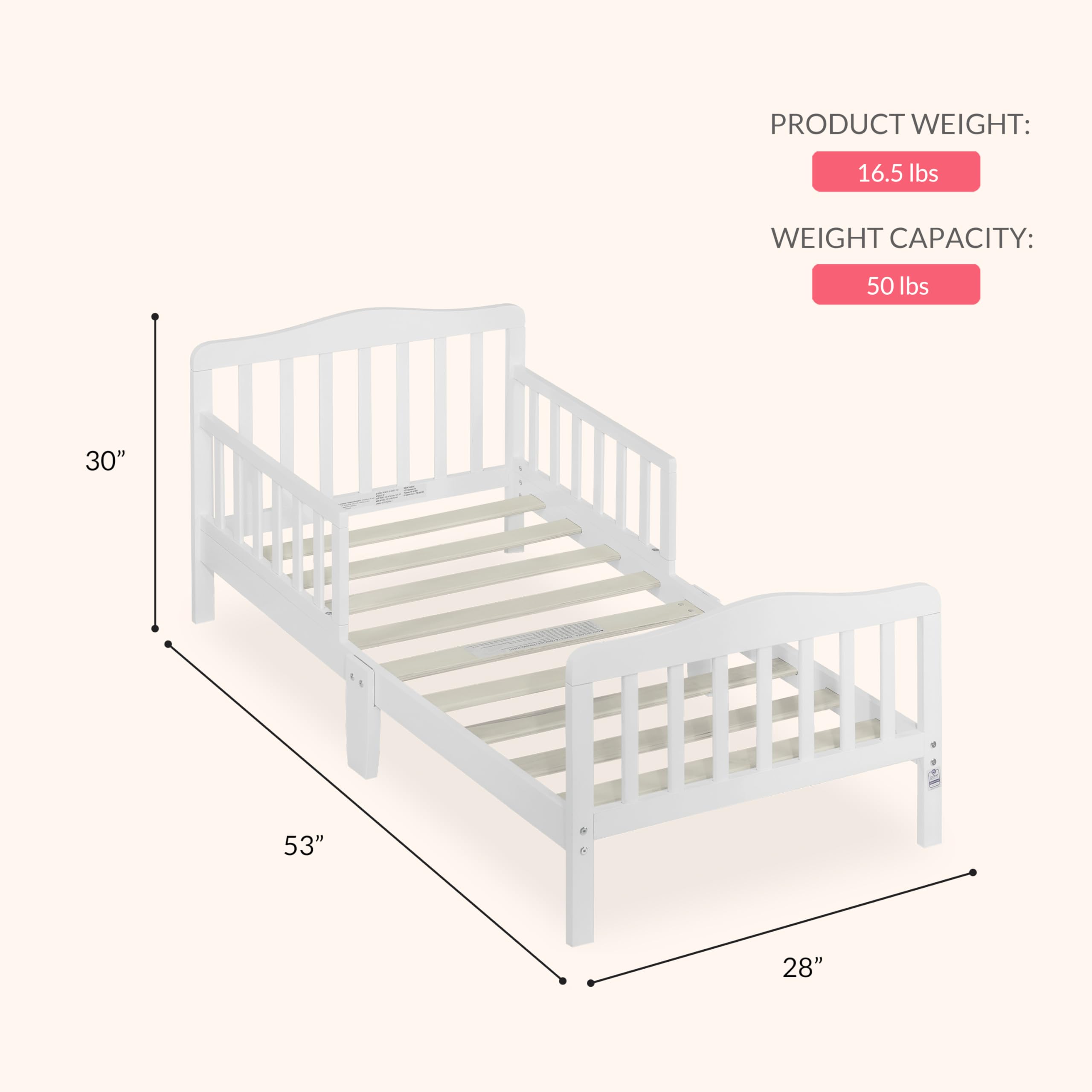 Let your little one transition from a crib to big bed with ease thanks to the Dream On Me Classic Design Toddler Bed! The bed sits low to the floor making getting in and out easy. It comes with two side safety rails and is reinforced for stability with a center leg. All user manuals and assembly tools are provided with the crib at purchase. Its design is classic and minimalist - the solid wooden bed features gently arched head- and foot-boards and smoothly curving rails and beams, making it a beautifully crafted piece of furniture. It is available in 12 elegant finishes, making it perfect to fit in the nursery of your dreams. Safety is always our top priority. The toddler bed is JPMA certified and designed to meet/exceed all applicable ASTM and CPSC standards. It is free of phthalates, latex, lead and BPA and is ergonomic, stable and sturdy. The dimensions are 53 L x 28 W x 30 H inches and it weighs 16.5 lbs. It can accommodate a child of up to 50lbs. Choose any Dream On Me non-toxic, Greenguard certified standard crib mattress for a perfect fit.