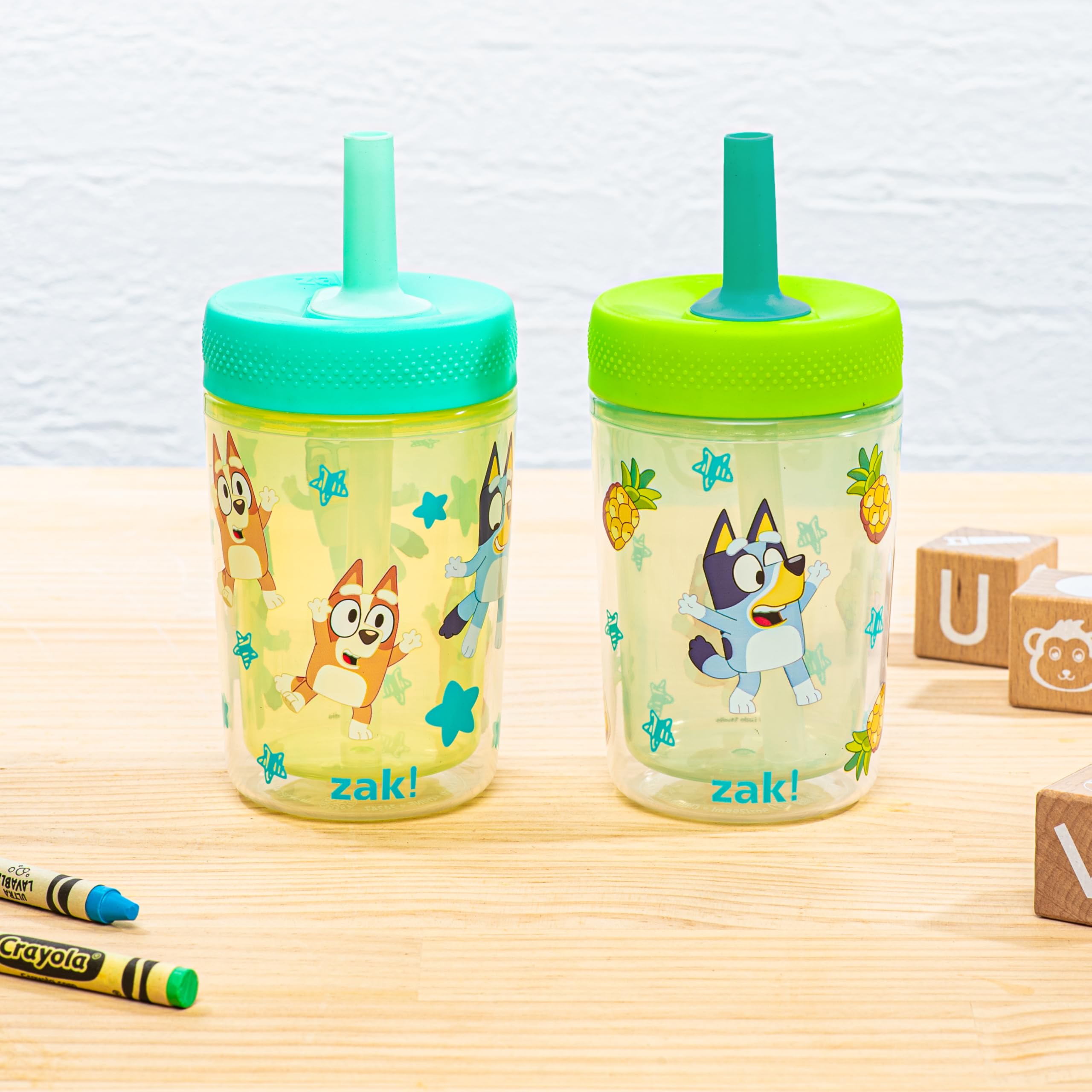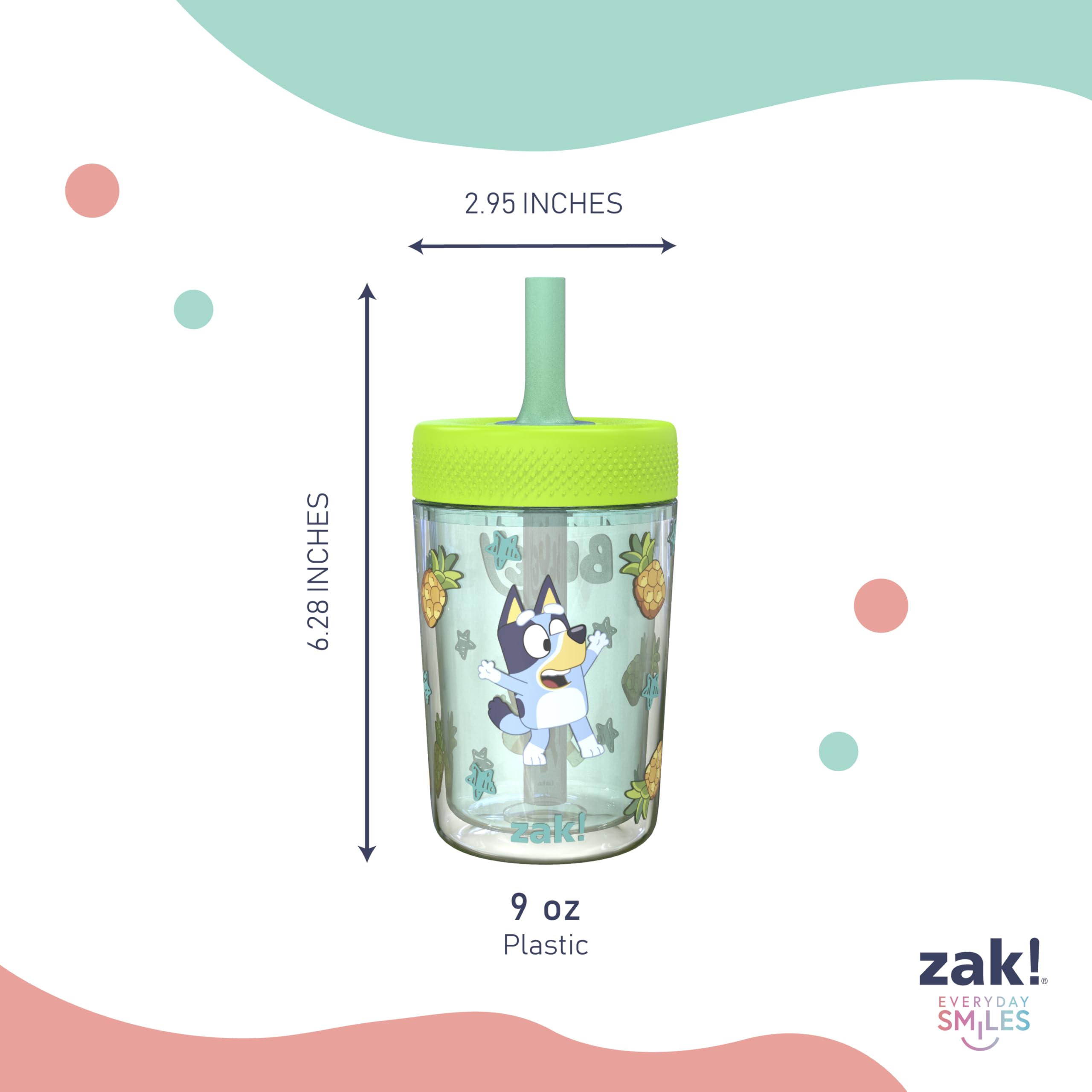 This leak-proof kids' tumbler set from Zak Designs makes hydration fun for Bluey fans! Durable Materials: The tumbler is made from lightweight plastic, and the comfortable straw is made from silicone. Everything is dishwasher safe, and the lid can be disassembled for easy cleaning. Leak-Proof Straw: The straw has a built-in valve that allows liquid to flow when drinking and prevents spills when the tumbler is tipped over. Hydrate Anywhere: The tumbler won't splash or leak and fits in car cup holders, making it ideal to take on the go. At home, you don't have to worry about spills or stains around fabrics or electronics, and drinks stay easily accessible through the straw. Plus, the double-wall insulation stops condensation and messy water rings! Specifications: 2 tumblers with 9 oz capacity. Made of durable plastic and silicone. Dishwasher safe, do not microwave. Length: 2.95-inch, Width: 2.95-inch, Height: 6.28-inch. Character: Bluey and Bingo (Bluey).