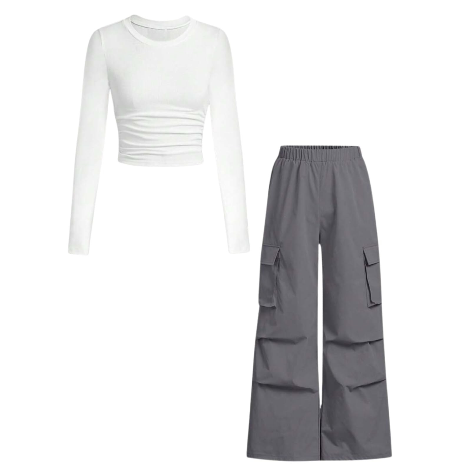 Material: Soft, stretchy and skin-friendly ribbed knit fabric for the top paired with lightweight cargo fabric for the pants, breathable and suitable for spring fall winter.