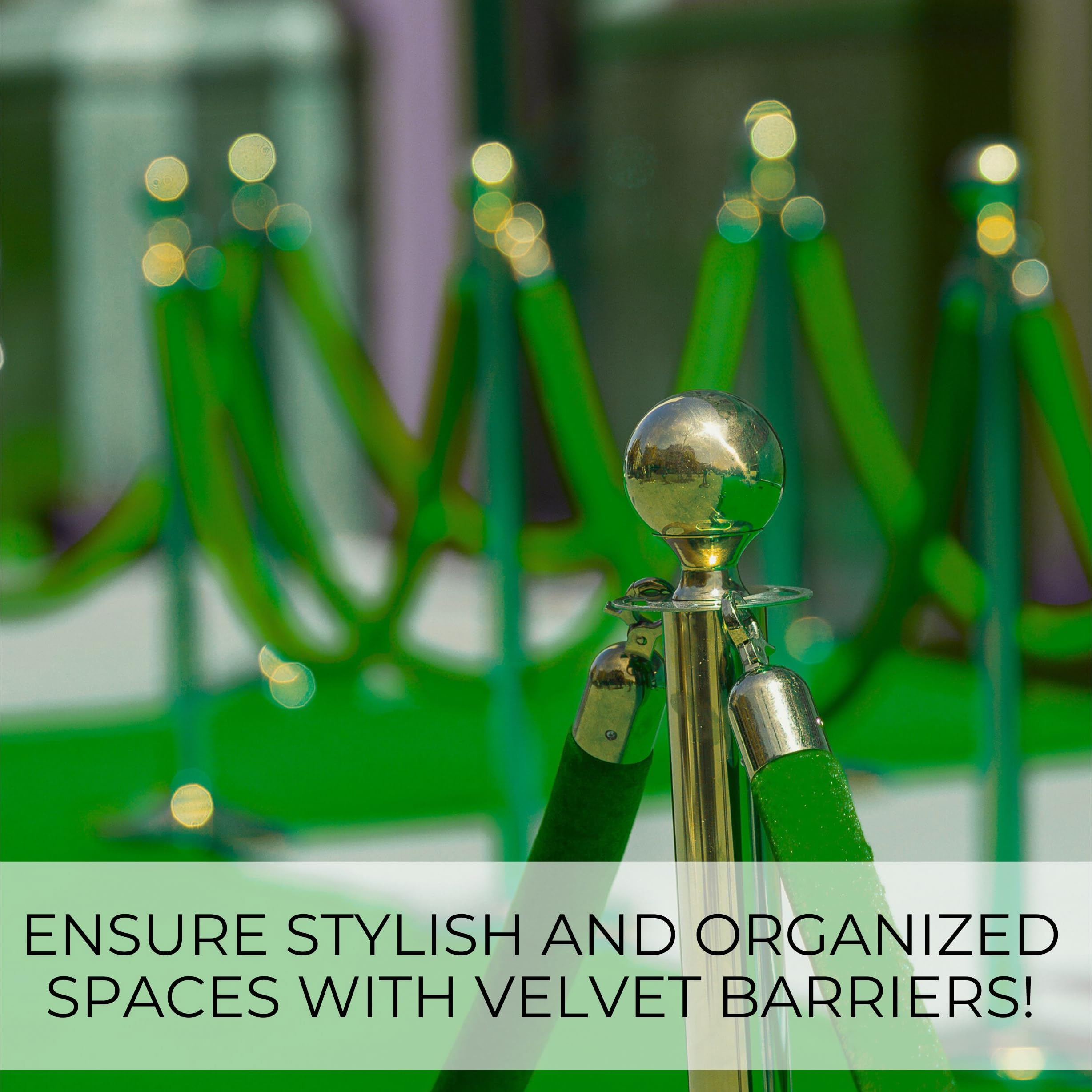 Rich green color and luxurious feel of velvet ropes will complement any red carpet or high-end decor, making them a must-have for anyone looking to create an unforgettable atmosphere. Designed to easily attach to stanchions, this velvet rooe set creates an elegant queue line or VIP area, adding a touch of glamour to your setup.