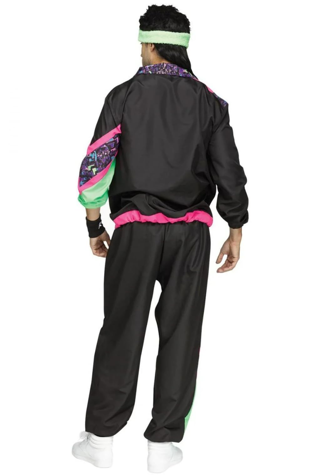 Description Rhythm Nation It's the 1980s, baby! Social media, Tide Pod challenges, and viral videos haven't even been invented yet and you have nothing to worry about except what rad song to play next for your aerobics workout. Maybe when you're done, you'll head over to the barber shop to get your mullet retouched or you'll hold a boombox over your head outside your crush's house as a dramatically romantic gesture (as long as her neighbors don't report you for disturbing the peace). Life is good! Product Details Show off your athletic... fashion sense when you wear this hilarious 80's Track Suit Costume for Men! Made of polyester windbreaker material, the pullover jacket has pink trim at the neckline and hemline, and is embellished with green, pink, and patterned fabric. The matching pants have a drawsting cord sewn into the pink waistband. The right leg features green, pink, and patterned embellishments. Don't forget to add your favorite pair of neon tennis shoes! Feel the Burn Has anyone ever worn a track suit to run track? Probably not. It's a fashion statement, not a practical workout outfit. Besides, if you're trying to pick up your crush, it would be totally not cool for her to see you covered in sweat. Impress her instead with your knowledge of Cheers episodes and trivia about the King of Pop. Maybe even hint that you're thinking of growing a mustache. She'll be so impressed, you might even convince her to go for a drive. That would be righteous! - Top - Pants