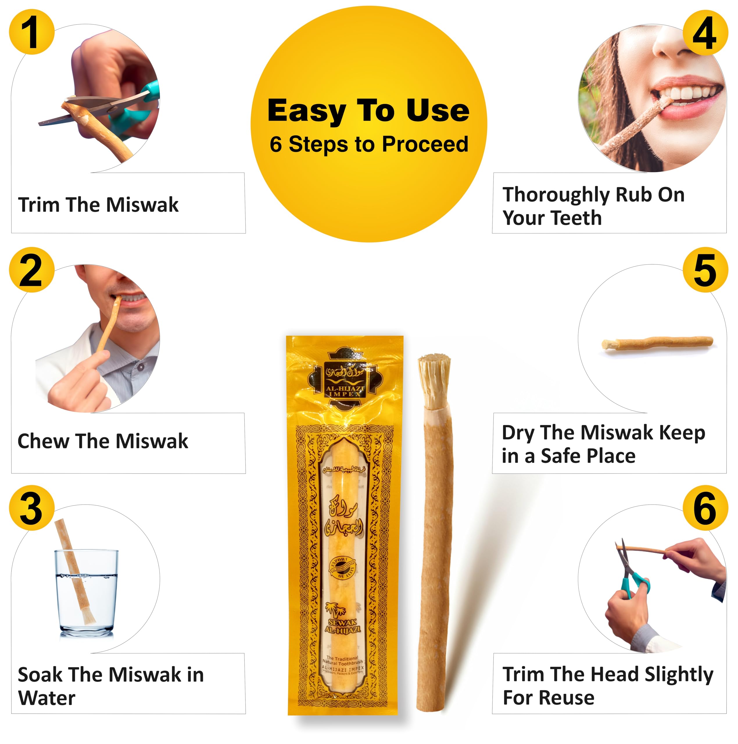 ✅ HOW TO USE: To Use Sewak Al Hijazi Miswak Toothbrush, first moisten the bristles few minutes under water. Hold it like a regular toothbrush and start brushing in gentle, circular motions. Focus on each tooth, ensuring the bristles reach all surfaces. Spit out excess saliva and debris.