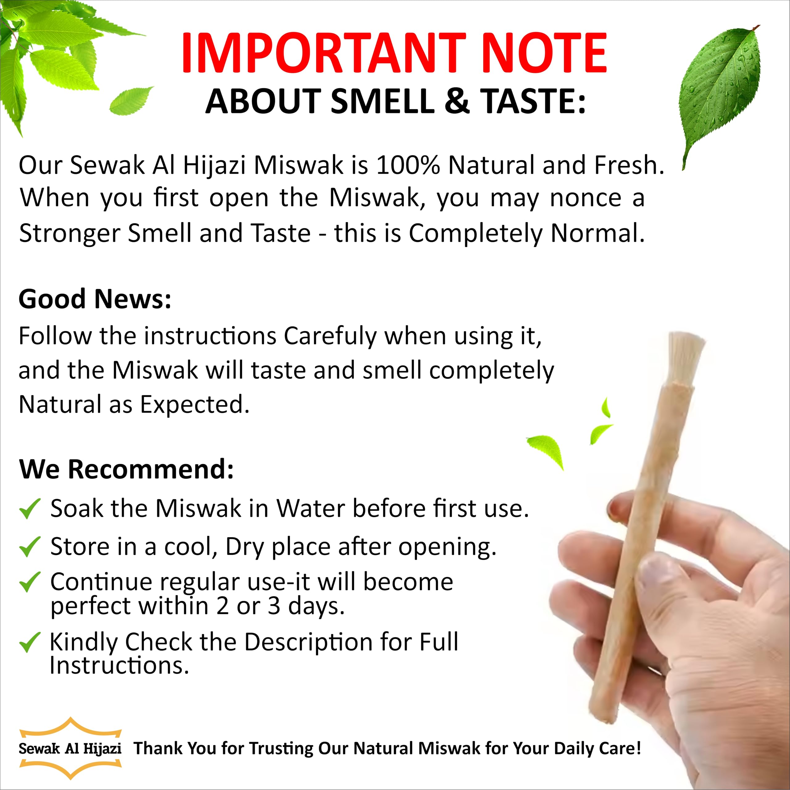 ✅ Fresh Breath Guarantee: Experience Naturally fresh breath with every use, thanks to the natural properties of Miswak.