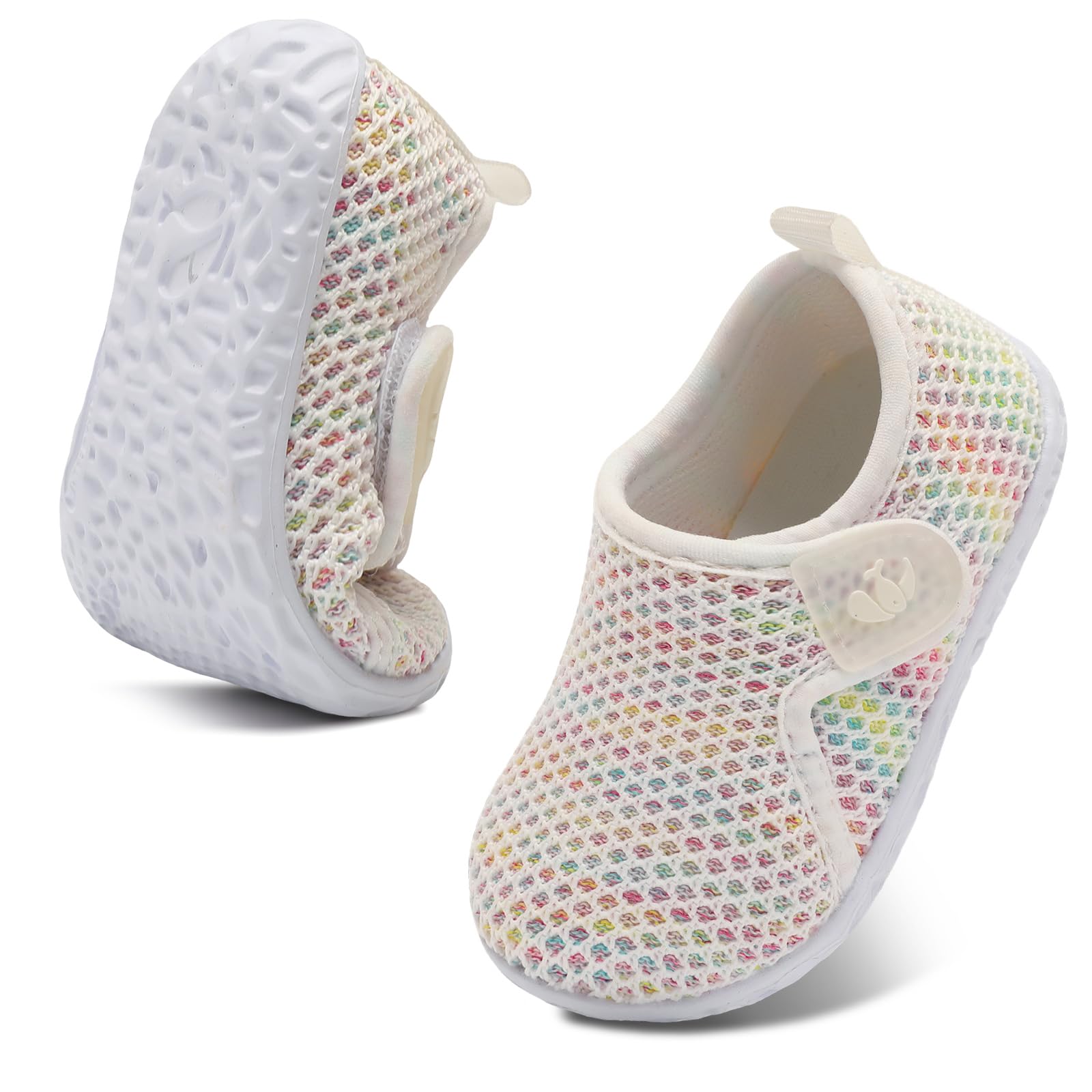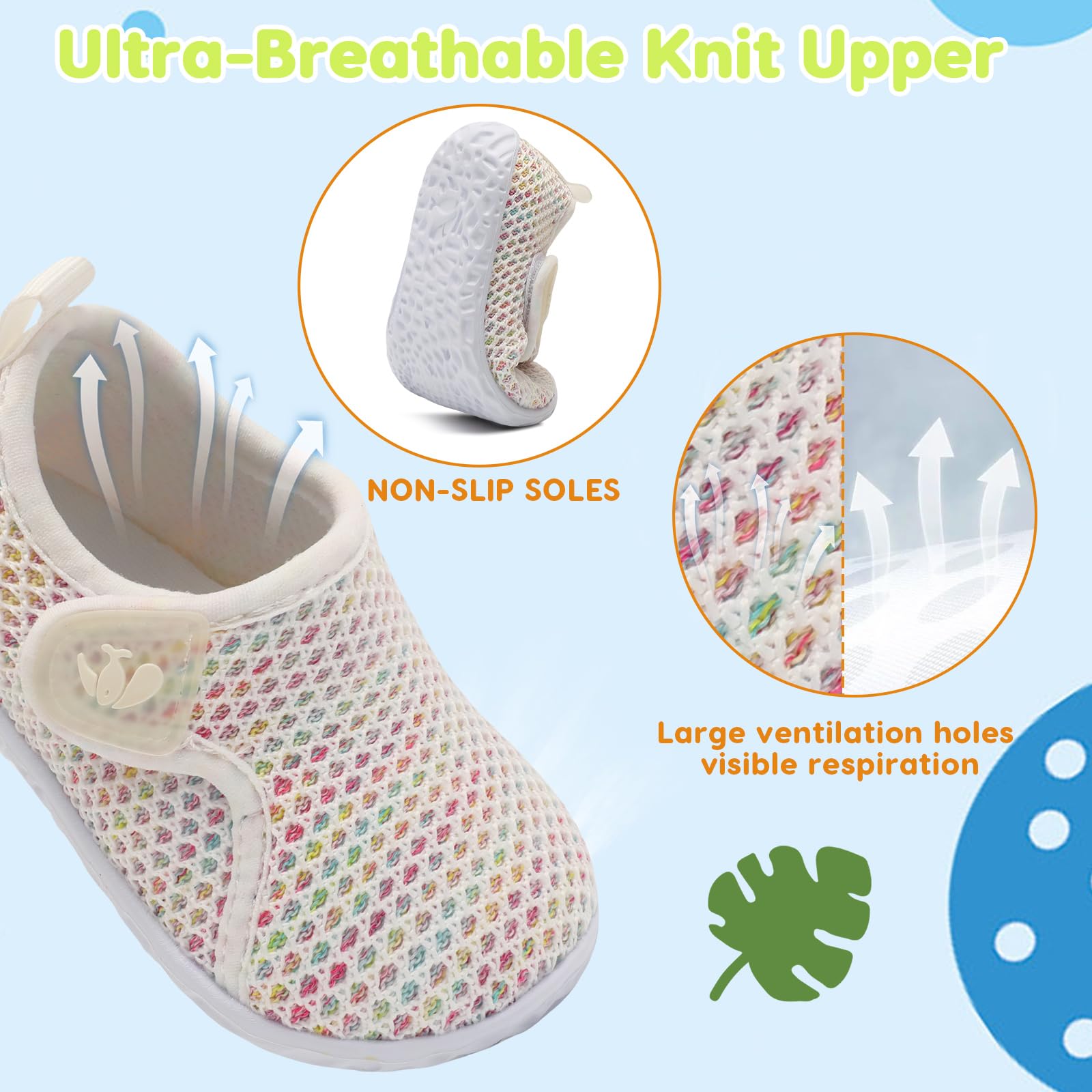 Upper:Knitted Mesh Upper offers comfort and air permeability,has excellent breathability,moisture wicking function,and keep baby's feet dry and odorless.Super Soft,Breathable and Comfortable fit all the year
