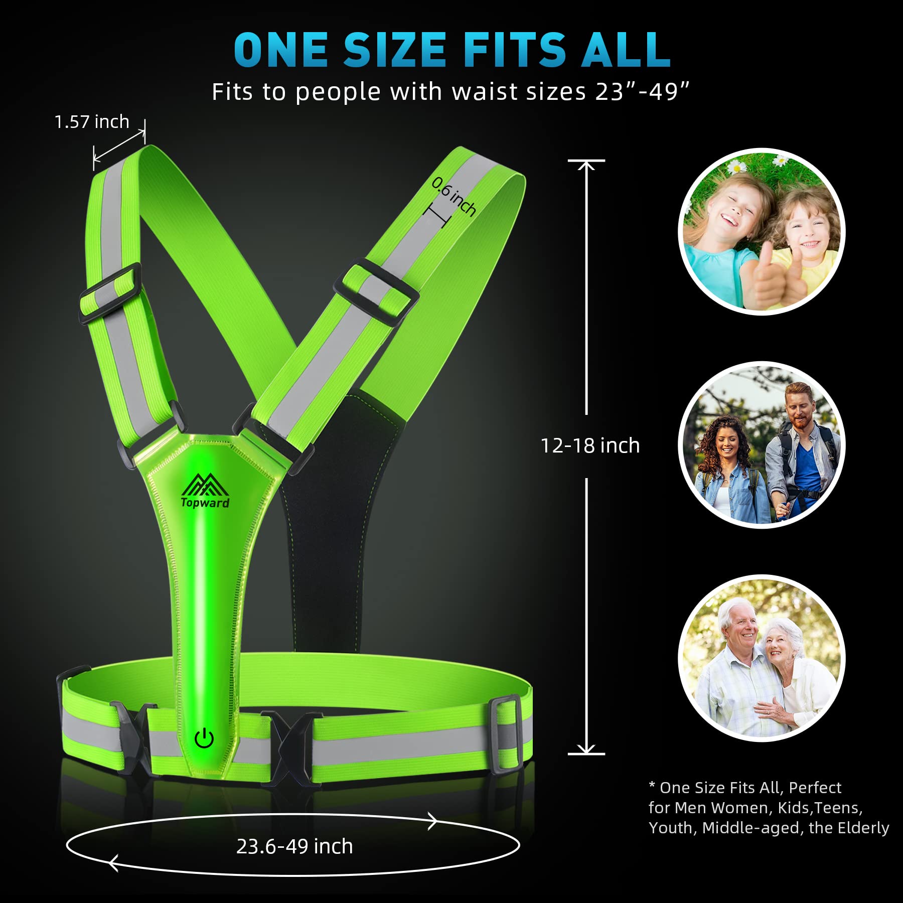 BE SEEN FROM A LONG DISTANCE - Topward LED Reflective Vest is an upgraded, new generation safety vest with LED flash lights both in front and back; Keep you safe for running, (dog)walking, riding, skiing and motorcycle, etc.
