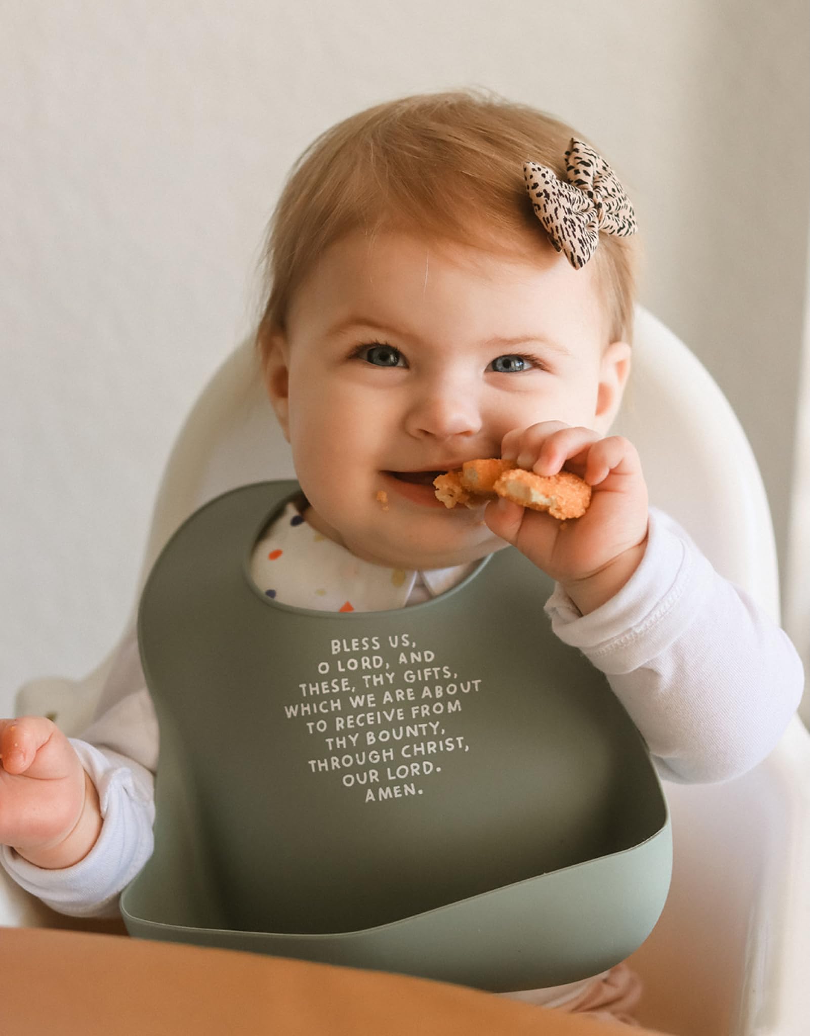 Description Our Best-Selling Meal Blessing Bib – A Meaningful Gift for Little Ones Cherished by many, this Meal Blessing Bib is the perfect new baby gift, offering a gentle reminder to pray before meals. Designed for both faith and function, it fosters gratitude while keeping mealtime mess-free. Faith-Inspired Tradition Handwritten Meal Blessing – Features the traditional Catholic prayer, encouraging mindfulness and gratitude during meals. Practical & Thoughtful Design: Mess-Free Dining – Made from food-grade silicone with a built-in food-catching pocket to reduce spills.