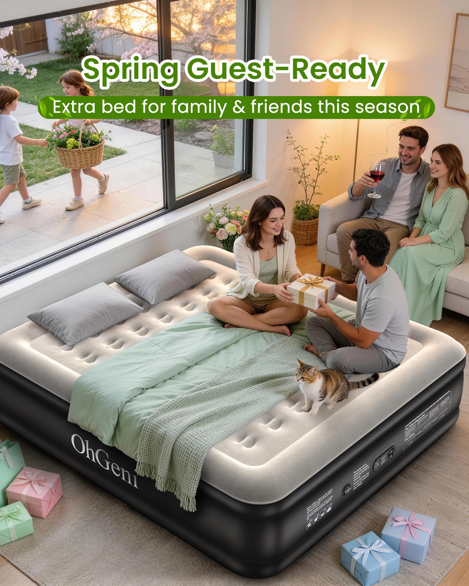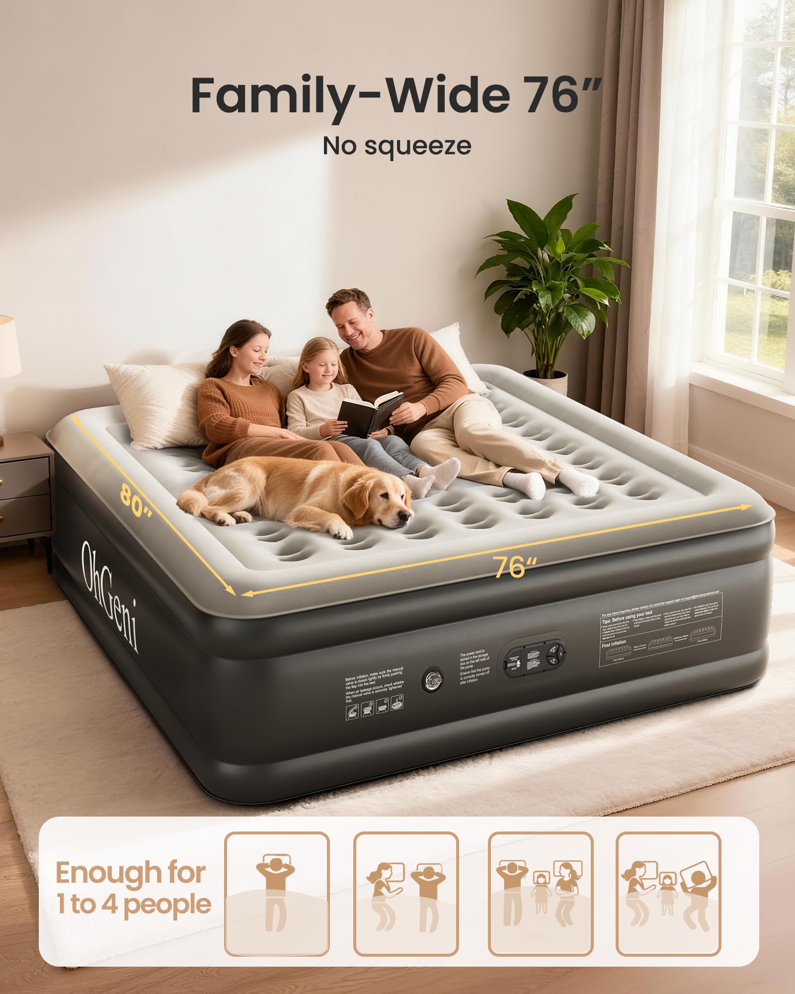 ๐๐ฉ๐๐๐-๐๐๐ฏ๐ข๐ง๐ ๐๐๐ฌ๐ข๐ ๐ง: The OhGeni King Air Mattress (80" x 76" x 18") delivers king-size comfort while saving space. It inflates in minutes to accommodate overnight guests and supports up to 700 lbs. When not in use, simply deflate and pack it away in the included bag for hassle-free storage