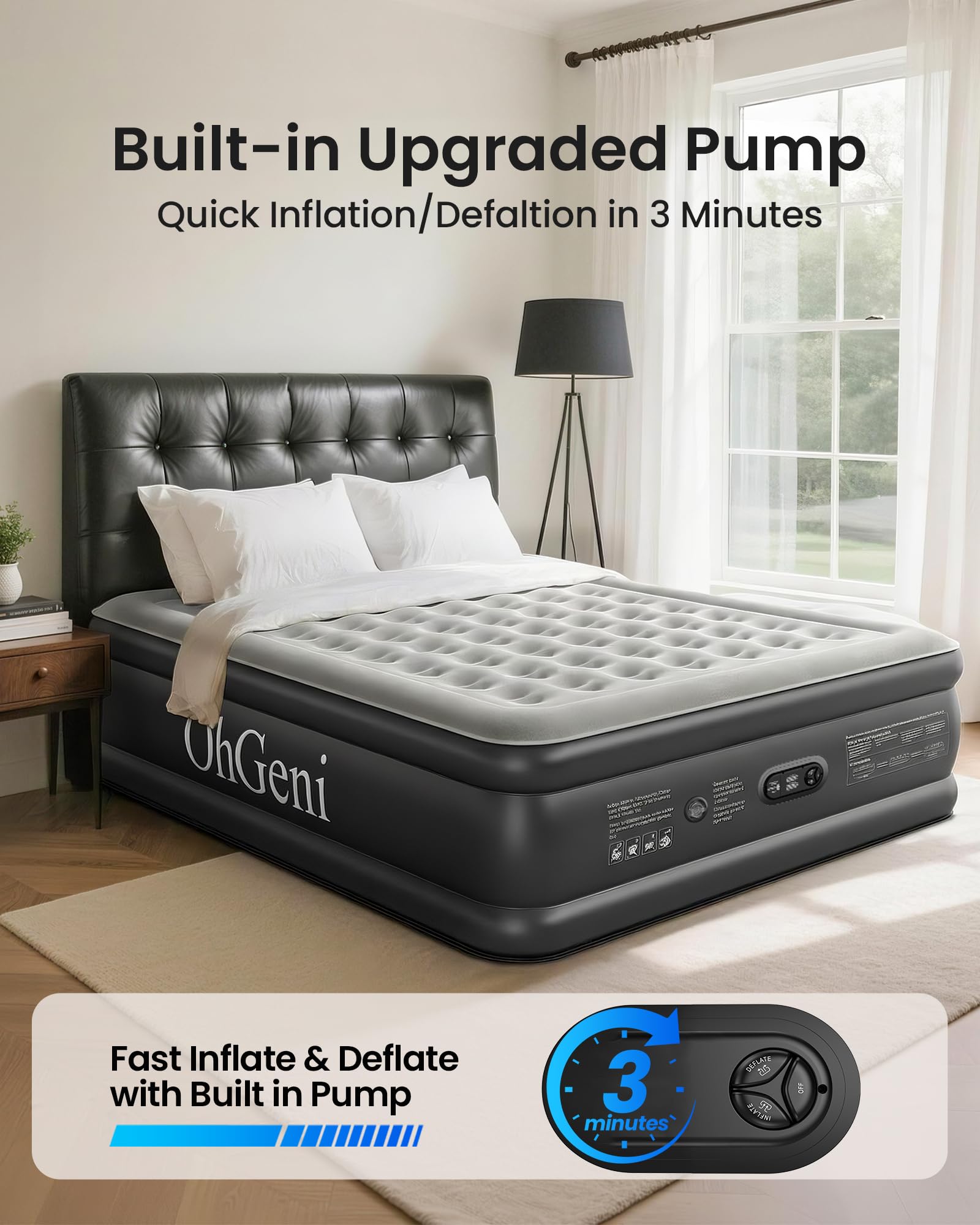 ๐๐ง๐ซ๐ข๐ฏ๐๐ฅ๐๐ ๐๐จ๐ฆ๐๐จ๐ซ๐ญ: Experience fast, firm support with the OhGeni air mattress. Its powerful 110V pump inflates or deflates the mattress fully in just 3 minutes. The smart Air Coil System conforms to your bodyโs shape, evenly distributing weight to prevent sinking and reduce back pressure