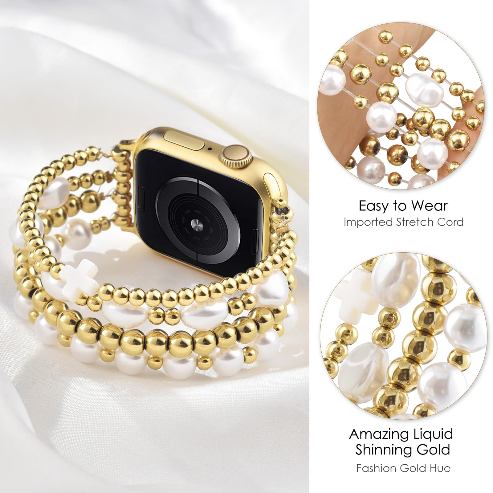 Gold Beaded Apple Watch Band: Made of premium quality stainless steel with 14K real gold plating that won't fade easily and can maintain its luster for a long time. Apple watch beaded bands for women contain 2 gold beaded bracelets and 2 pearl-beaded bracelets. It's very comfortable to wear. It is an excellent choice for people with susceptible skin.