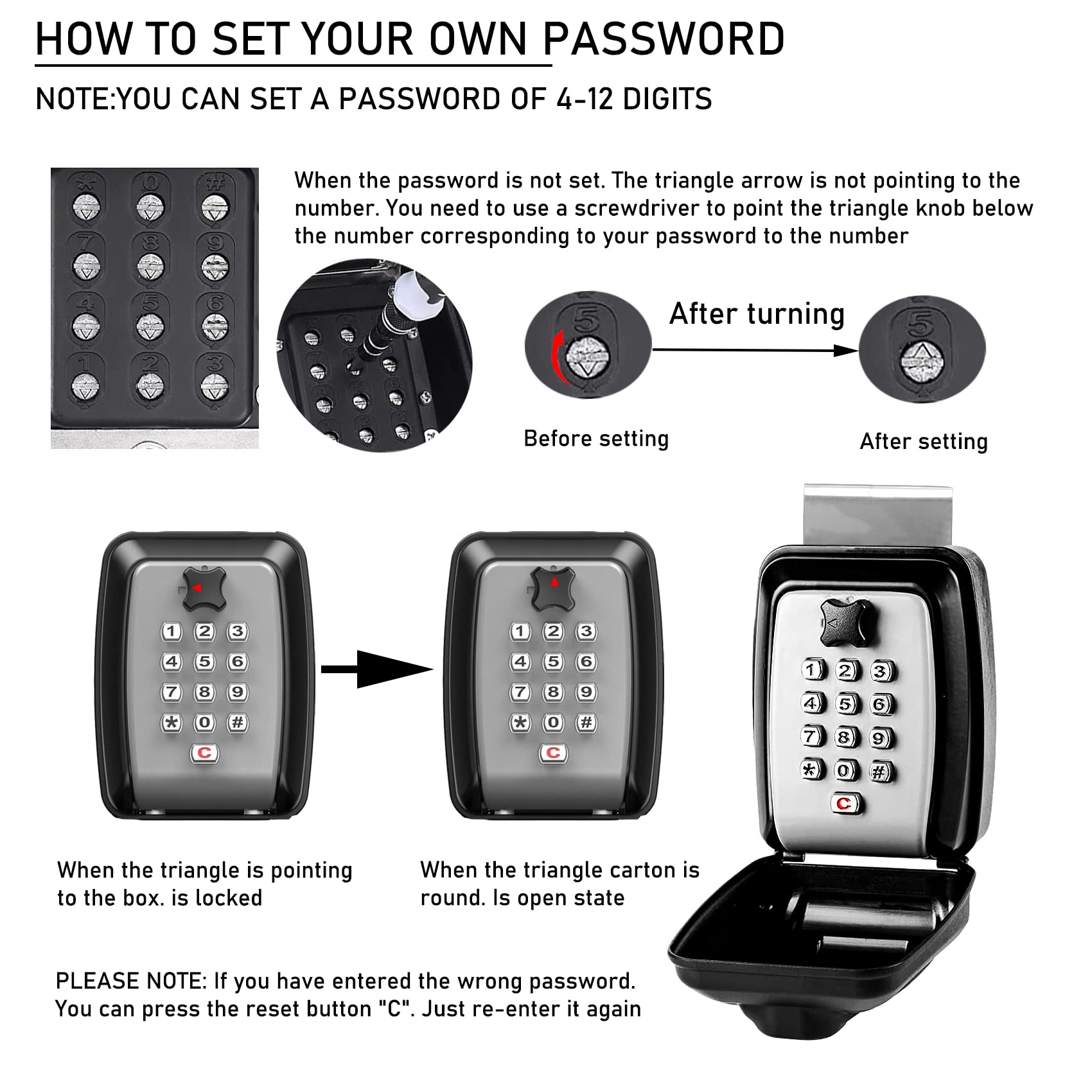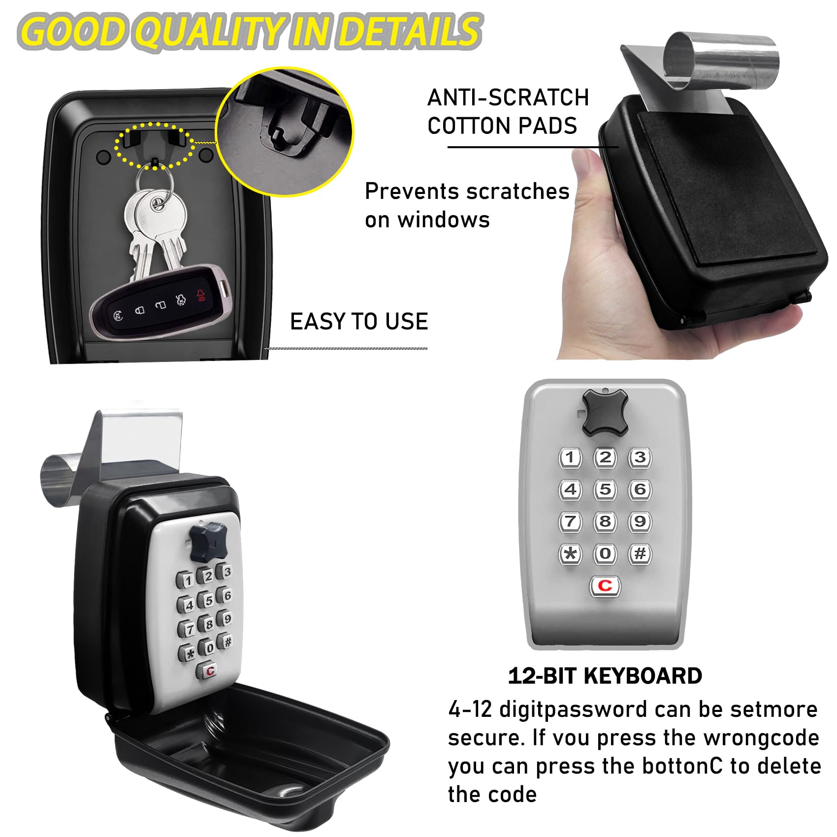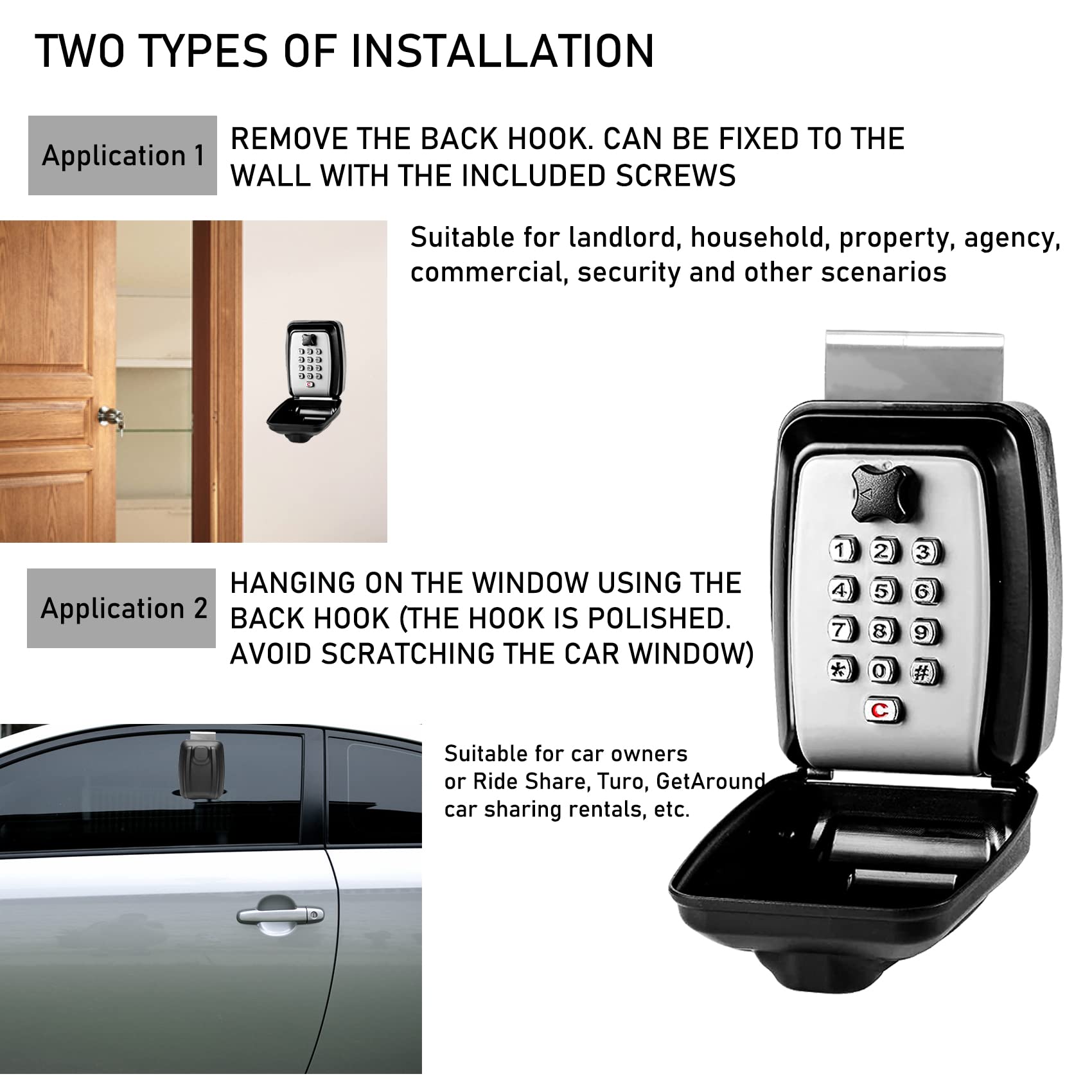 【Easy to Install and Use Design】Back with hook and screw fixing holes. Can be hung on the car window by rolling up the window. Will not scratch the window. Or it can be fixed to the wall or board by screws. Password opening system with familiar phone style keypad, you can easily remember the password and use it skillfully.