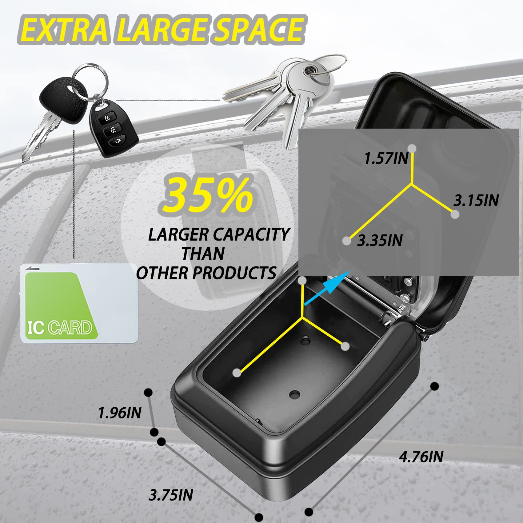 【Meet Your Storage Needs】The Key Storage Lock Box has an interior space of 4 x 2.47 x 1.23 inches. Not only can it meet your needs for storing metal keys, car keys, etc. It can also store cash, cards, garage door opening keys, and other items. Safe and secure storage Lock Box.