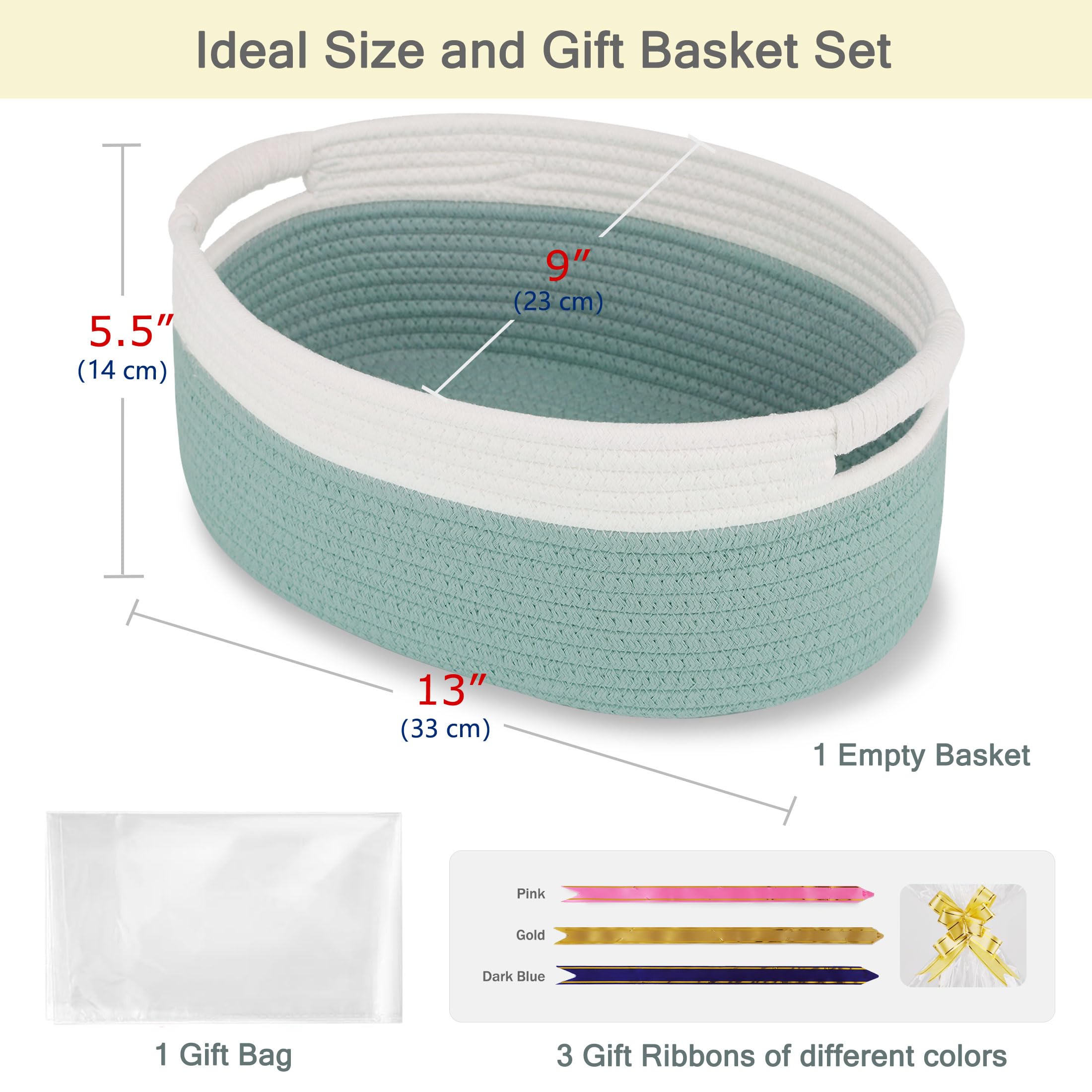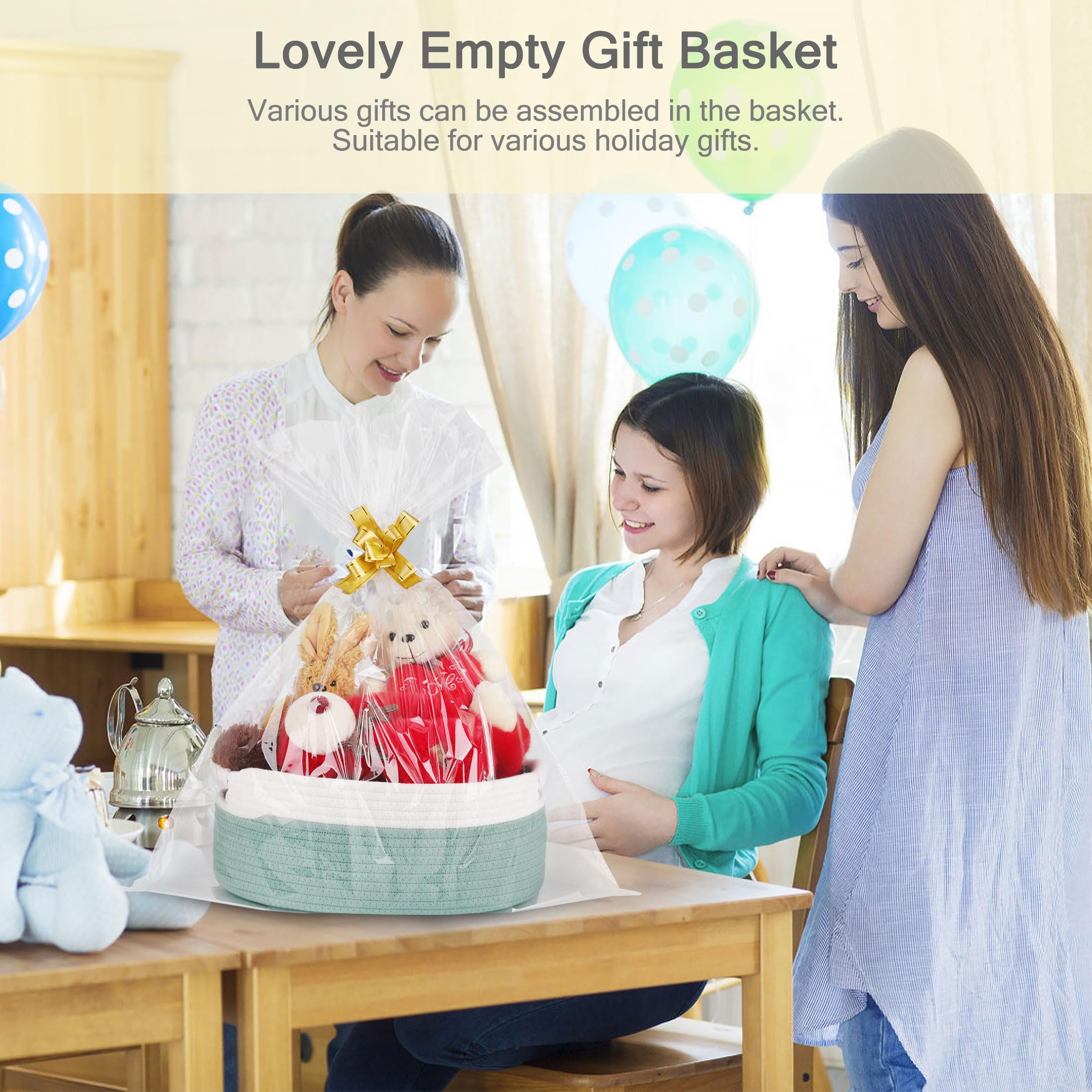 【Ideal Size and Material】Our lovely empty gift basket measures 13“ x 9” x 5.5". It is made of high quality natural cotton rope, soft and skin-friendly, chemical free, and won't scratch clothes or furniture. It's a perfect storage basket for families with babies or pets.