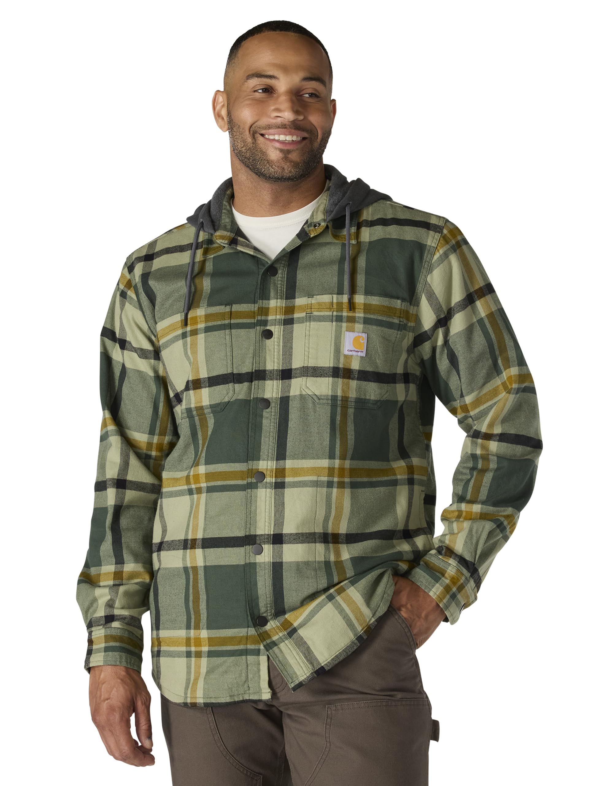 Description Made for work that requires a full range of motion, this men's Carhartt hooded flannel shirt jac is a versatile layer for cold shops and outdoor work. It's fleece-lined for warmth with built-in flex for an unrestricted range of motion. A relaxed fit offers a little extra room to bend and move.