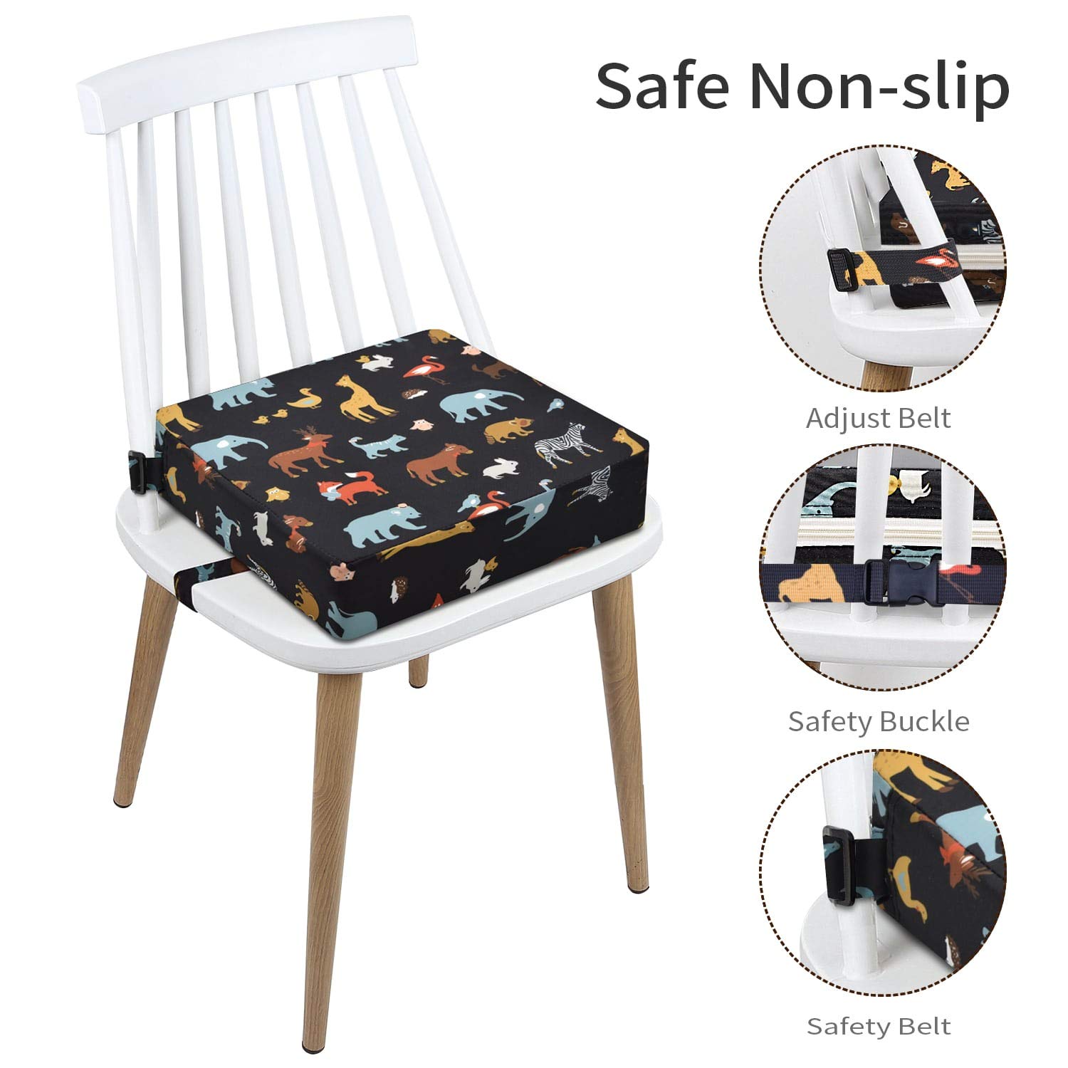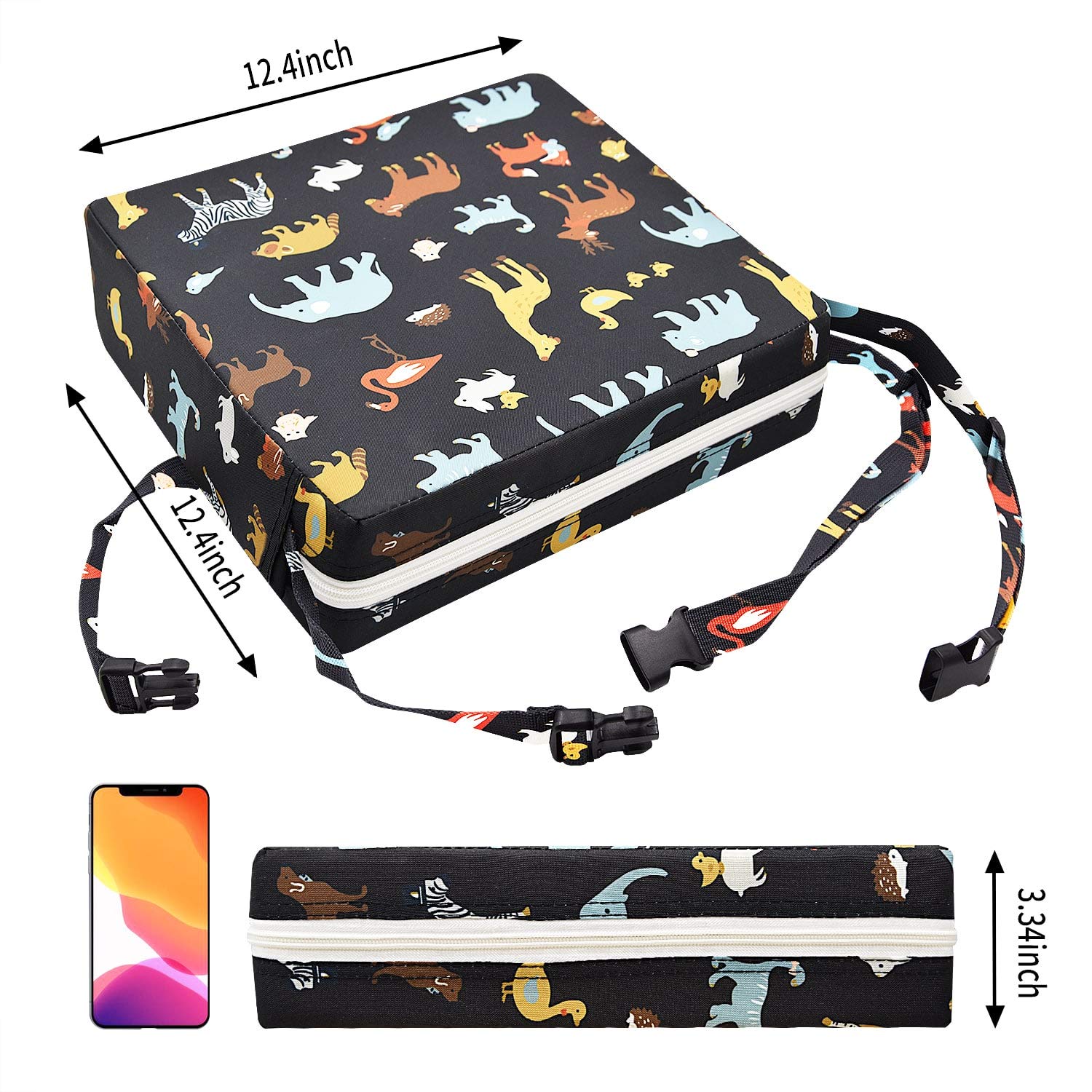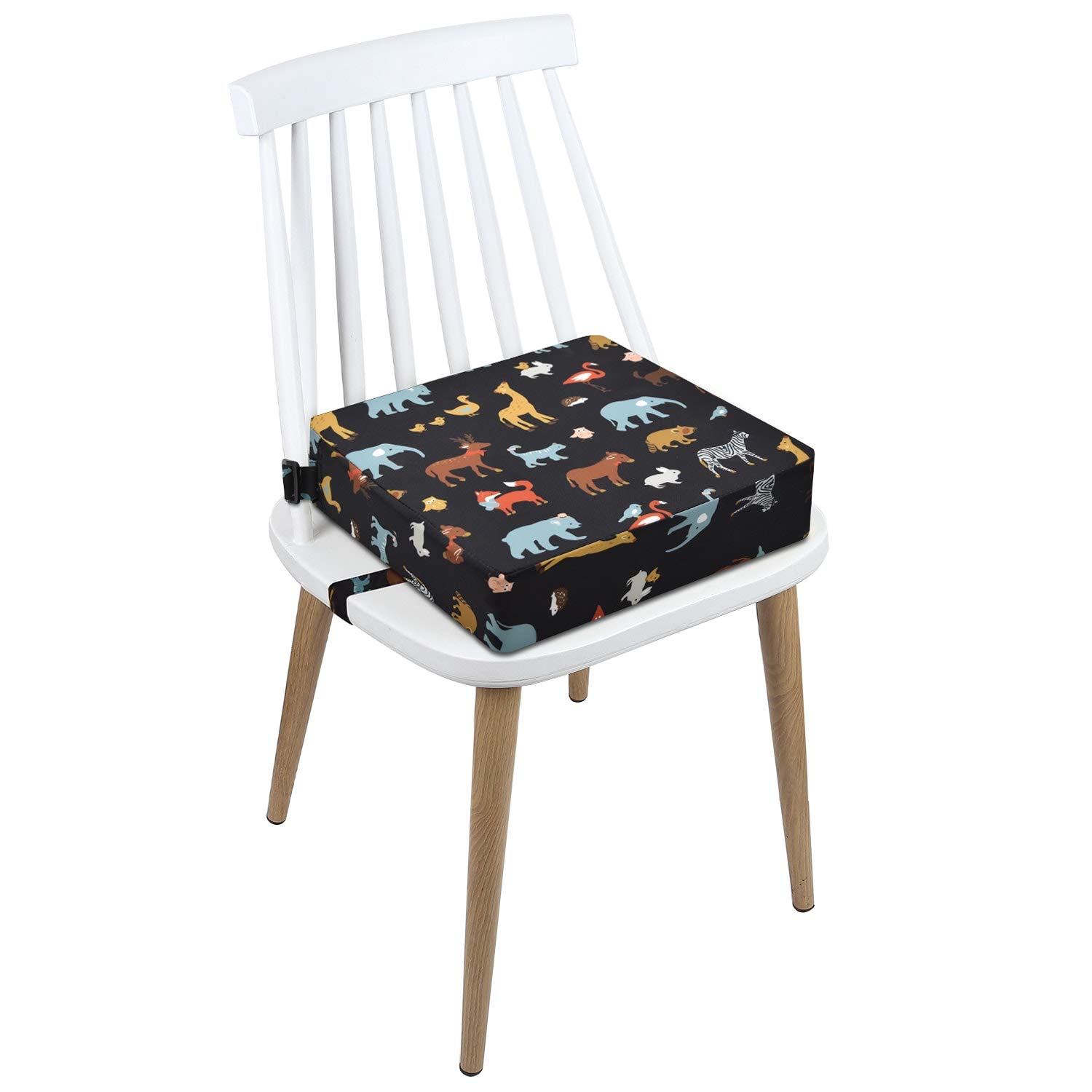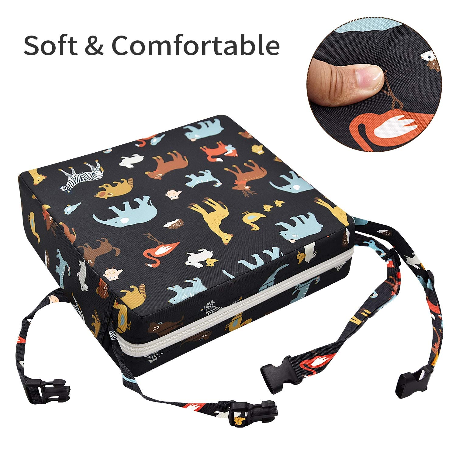CARTOON APPERANCE: Booster seat adopts a funny cartoon patterns--Colorful Animals on black cloth, which will meet children's intrest. Colorful Animals pattern can stimulate children's interest and make children curious about the world