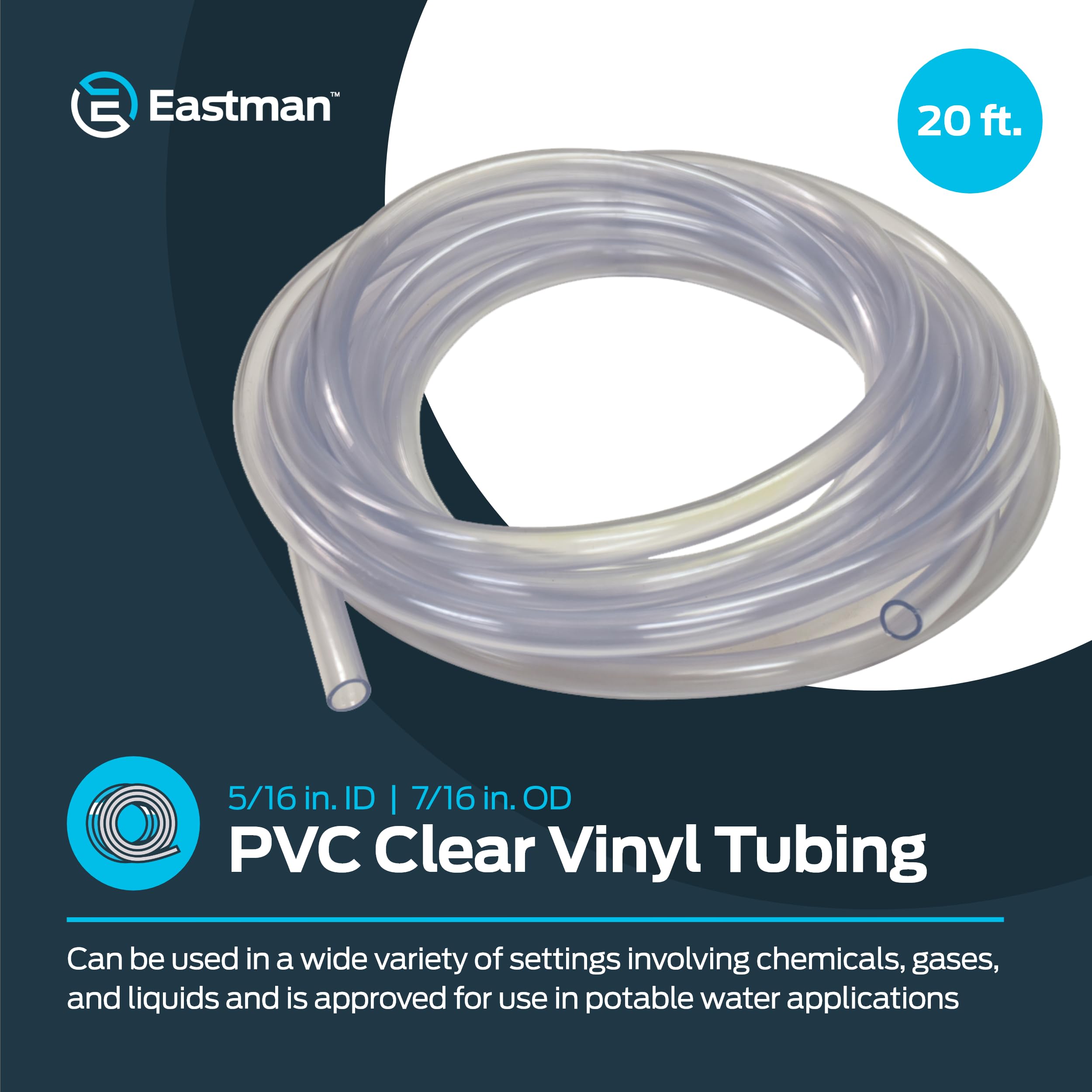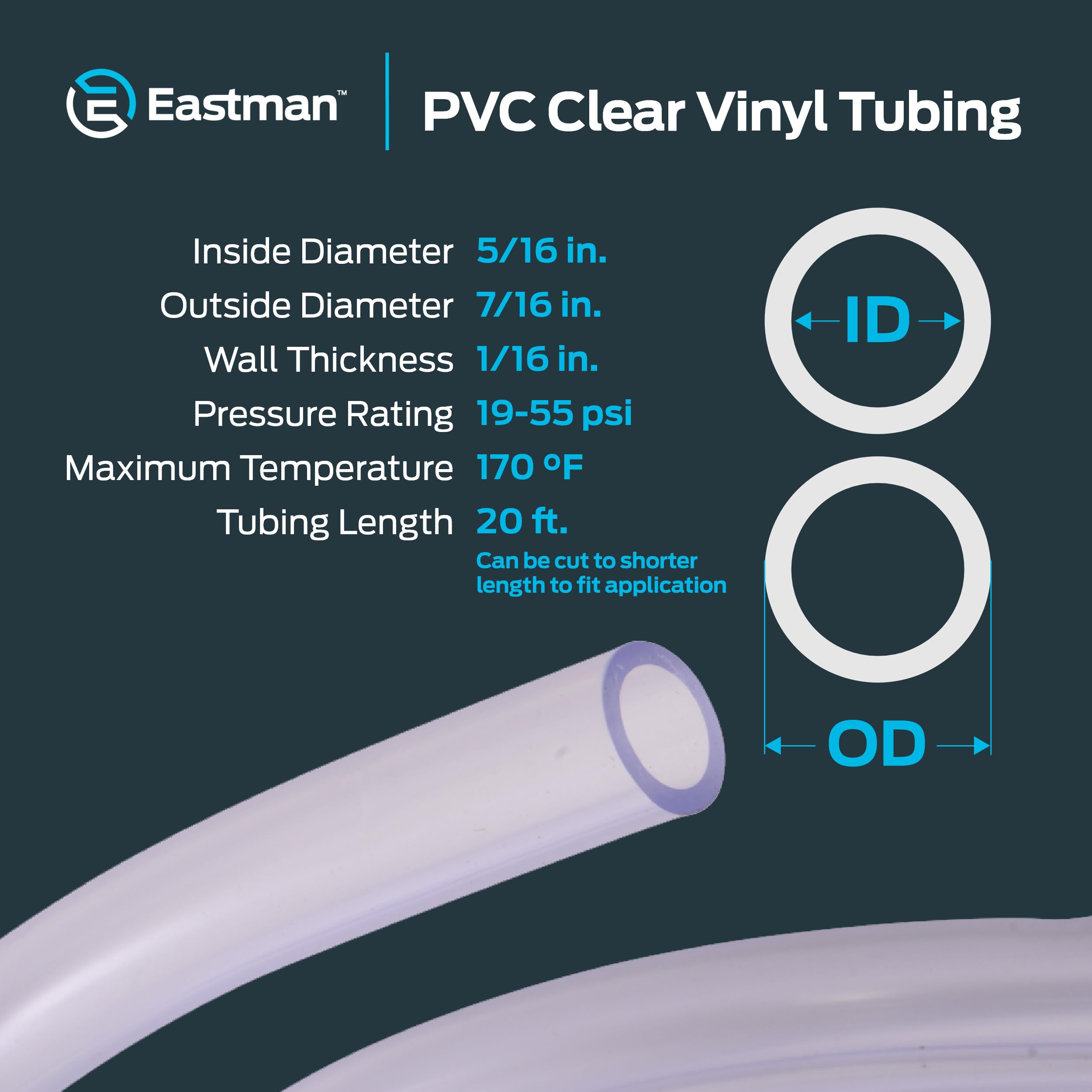 Simplify your plumbing and home improvement projects with the Eastman PVC clear vinyl tubing. Composed of clear, durable PVC, this tubing can be cut to size as needed and is suitable for drainage lines, potable water, beverage dispensing, laboratory use, and aquarium setups. Clear vinyl tubing is a flexible, versatile option that handles chemicals, gases, and liquids in low-pressure applications. Tubing wall thickness is 1/16 inches with a pressure rating of 19 to 55 PSI and a maximum temperature of 170 degrees F. Made with FDA-compliant materials. Not recommended for ice makers.
