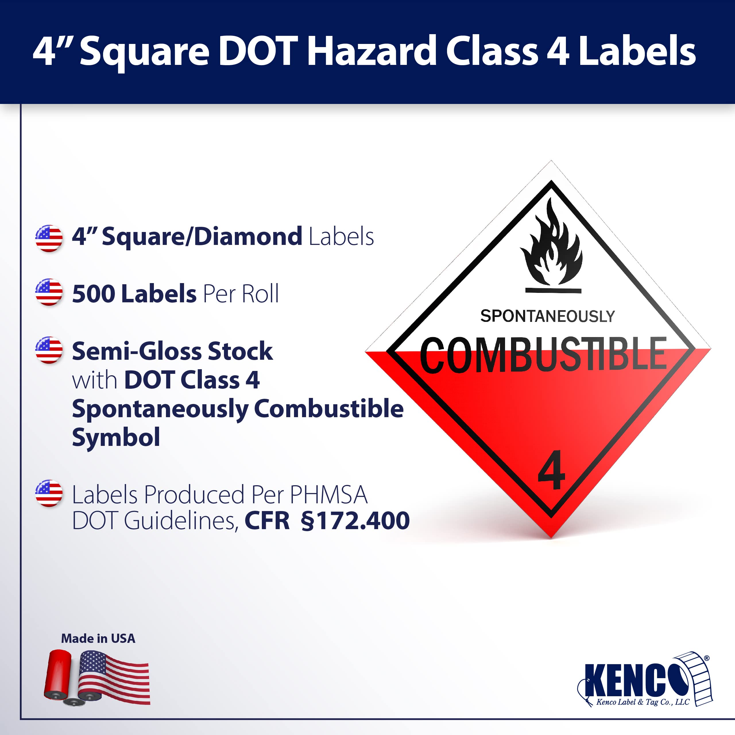 4" X 4" , 500 Labels Per Roll, With all necessary text, size and colors to conform to CFR, ICAO, and DOT regulations. They also meet the design and durability standards of DOT Guielines, CFR 172.400 Semi Gloss Stock and Superior Adhesion provide for all your hazmat needs. Custom Vinyl material orders available upon request All Hazard Class DOT Labels are available, Class 1-9 Kenco is a third generation family business located in the heartland of the USA. All employees, all production and manufacturing, and all raw materials are 100% from the USA all the way to your door Featuring Patent Pending manufacturing process to reduce waste and eco friendly water based ink