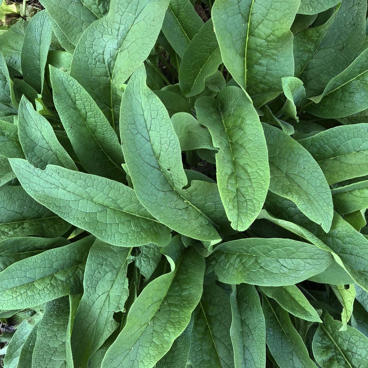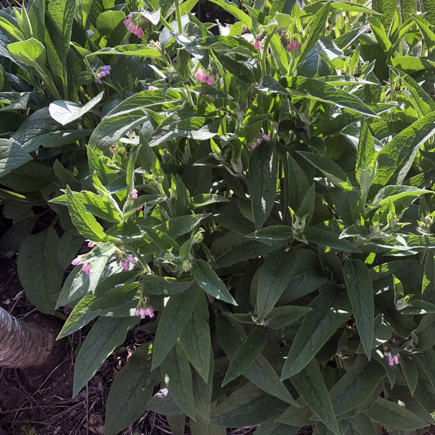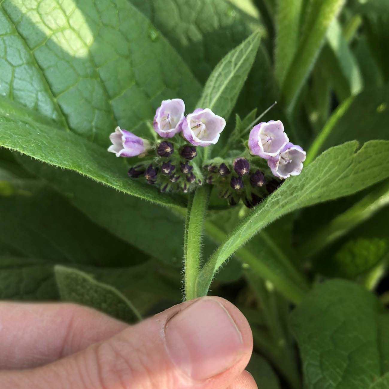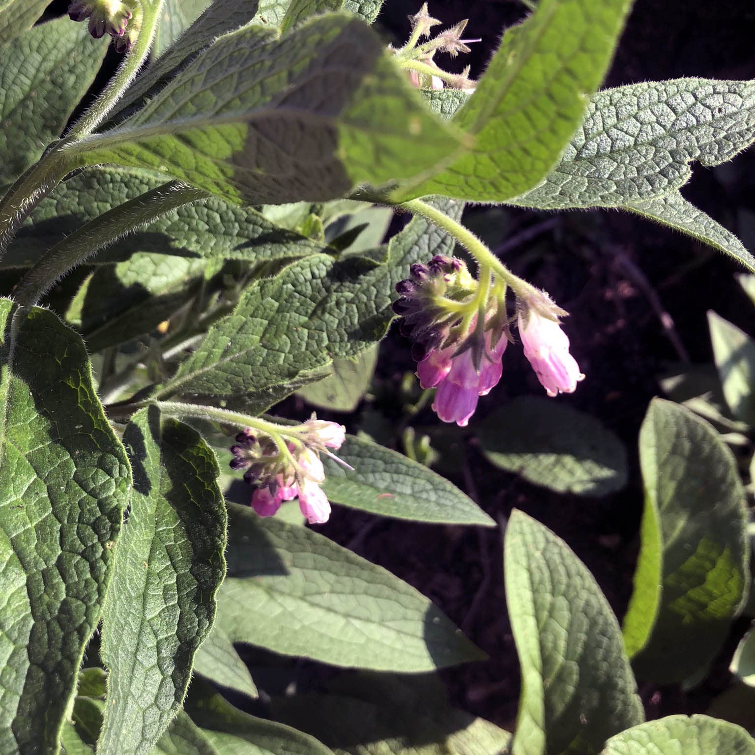 This large, flowering herb has many names. Comfrey (Symphytum officinale), also called common comfrey, true comfrey, knitbone, knitback, and consound, is great for tree guilds, wildflower plantings, and pollinator gardens. While comfrey is a Boraginaceae or borage and forget-me-not family member, it isn’t a culinary herb like its cousin borage. A few of comfrey’s common names hint at its heritage as a medicinal herb. Historically, herbalists used comfrey to create salves, poultices, and compresses to address skin irritations, burns, diaper rash, broken bones, sprains, and bruises. Permaculture enthusiasts use comfrey as an “accumulator,” or a plant that accumulates nutrients from the soil, and as a “chop and drop” mulch crop, meaning they cut the leaves to use as a mulch.