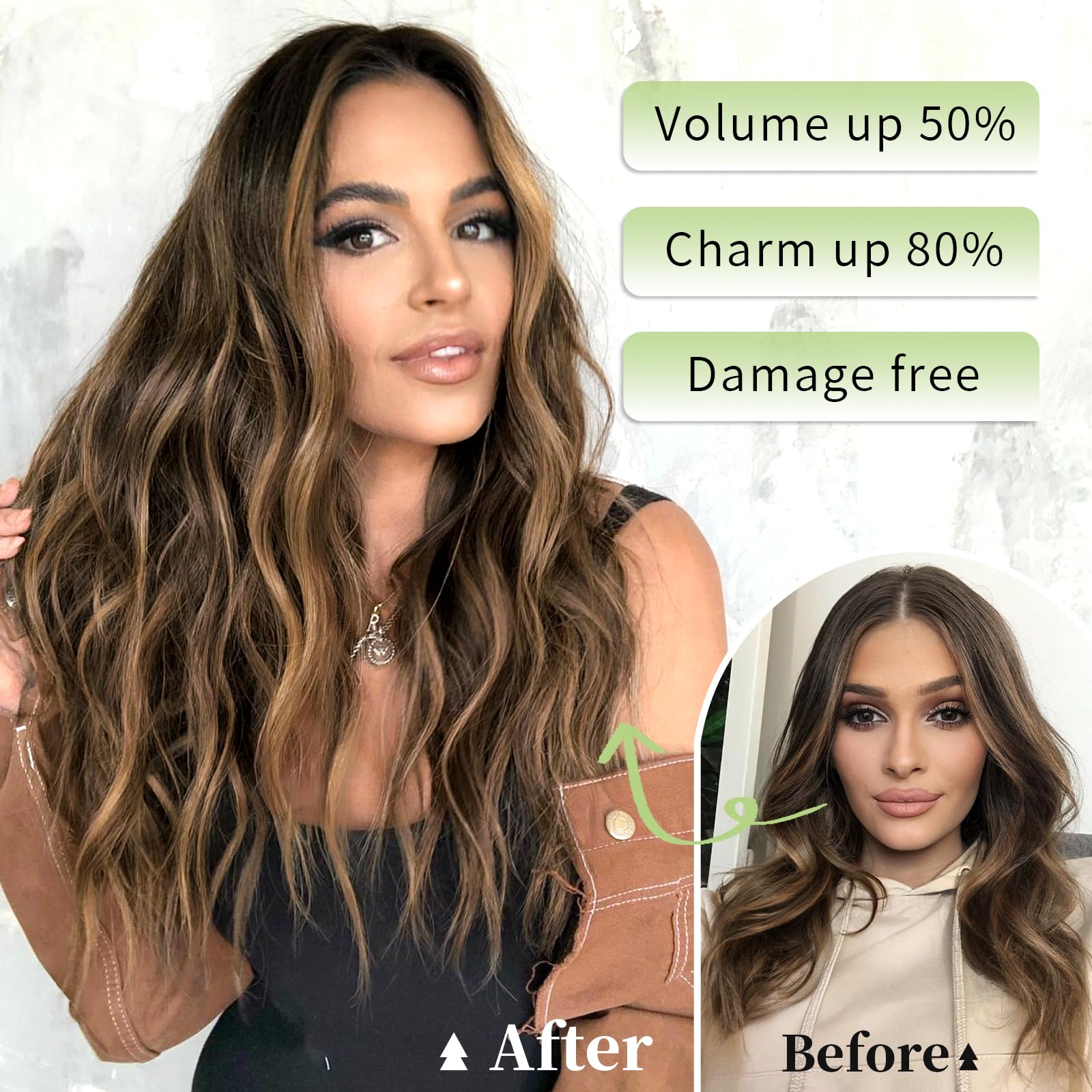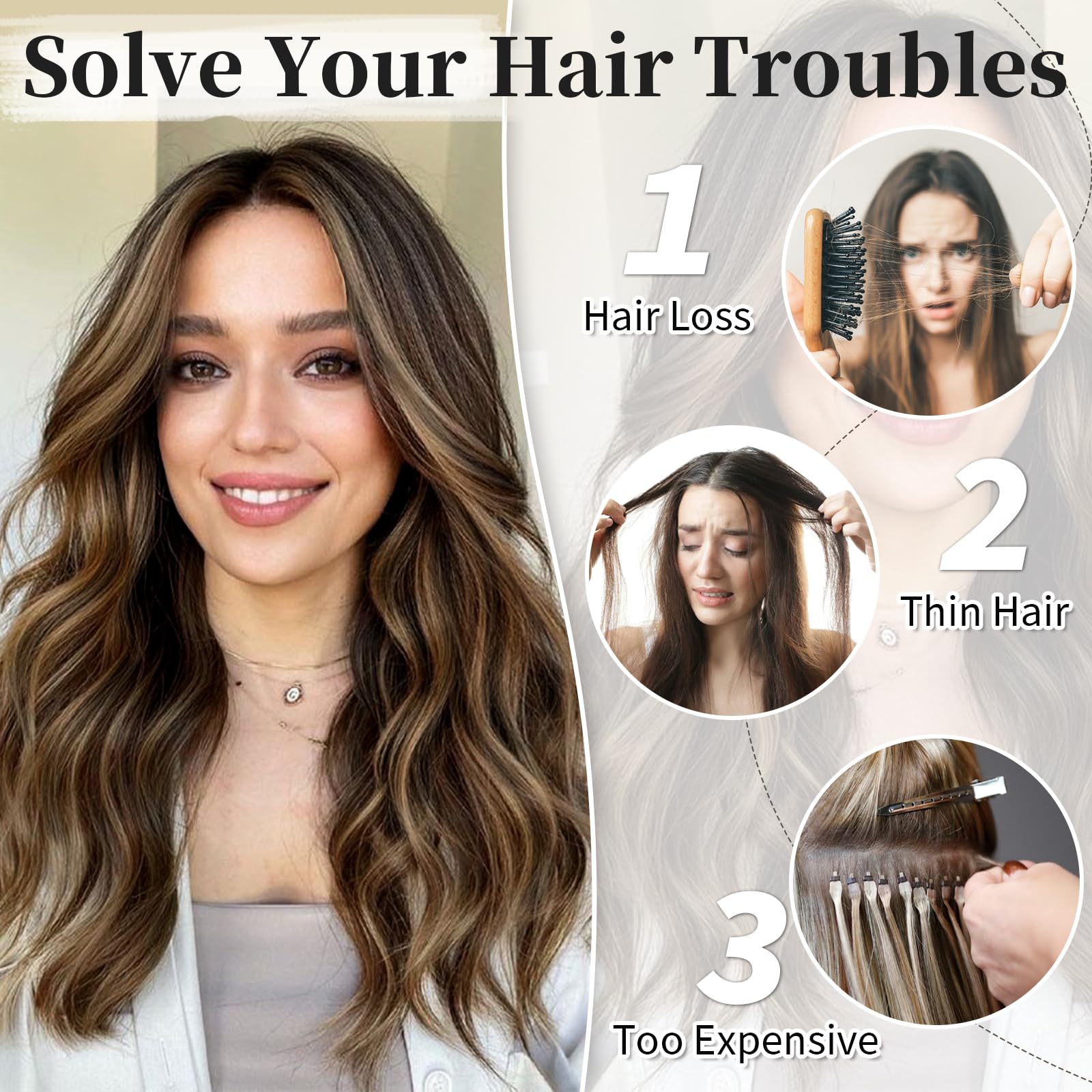 Different ways of wearing: 1. Position the wire hair extensions on your head like a hairdband, secure them with 4 clips, and hide the wires with your own hair.2. Only use invisible wires, suitable for easy hair loss and sensitive to bobby pins customers. 3. Only use 4 hair clips, suitable for customers with soft and sparse hair on the top of the head.It can meet various wearing situations.