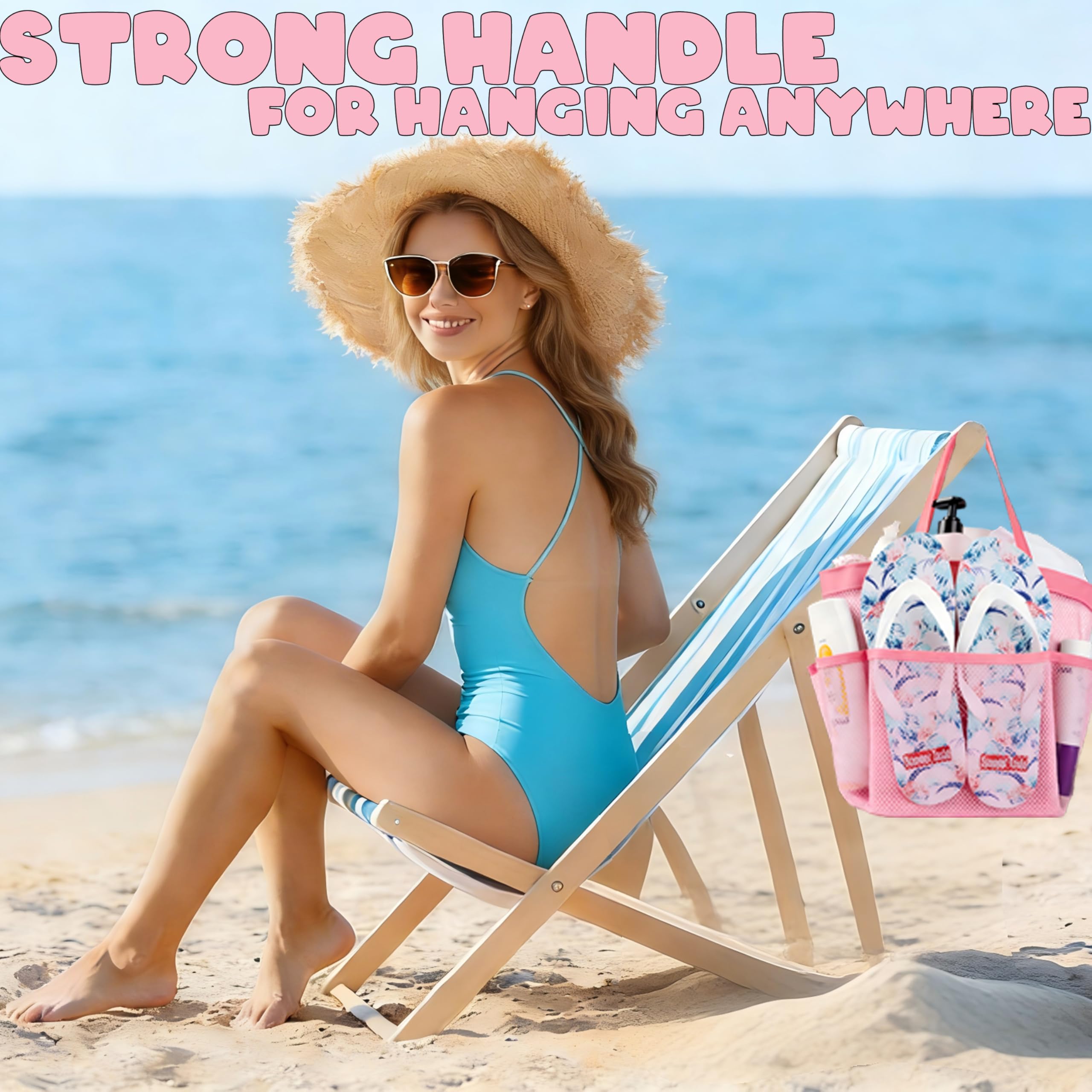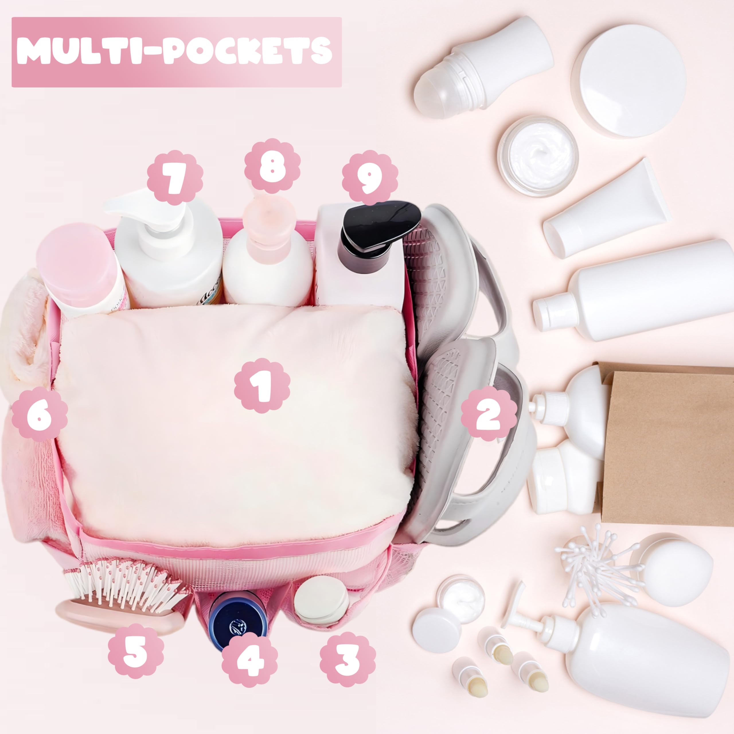 Ample Storage Space - Our shower tote bag has 8 outer compartments and a large one in the center, the main pockets can keep bigger one you need easily accessible including shampoo,towel, clothing, toiletries, hair dryer. The side pockets can contain other tiny pieces, like toothbrush, face wash, comb, shaver, soap and keeps them organized and shipshape.