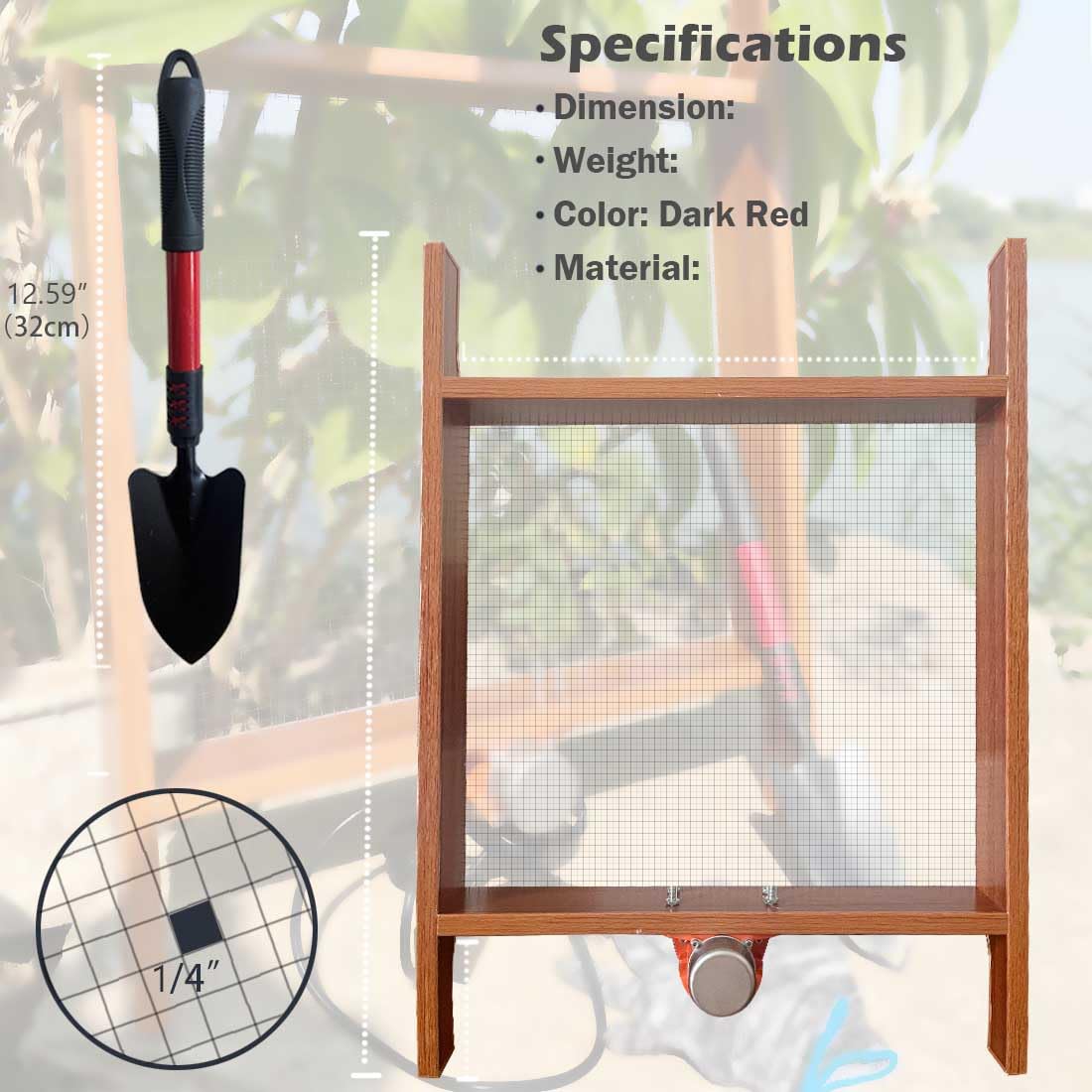 【Timeless Charm for Your Garden】 Enhance your garden's aesthetic with our soil sifter's polished wooden screen. Resistant to stains and waterproof, a simple wipe restores its brightness. The rich dark red wood grain adds a rustic touch to your outdoor space.