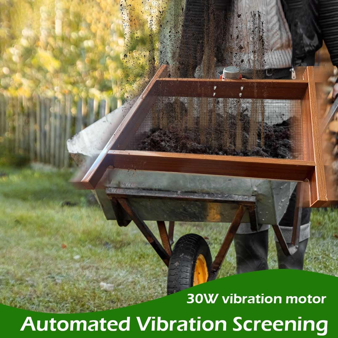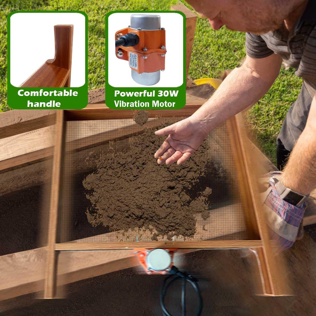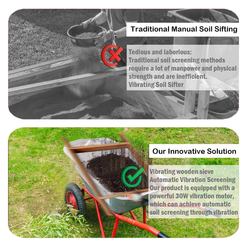 【Effortless Soil Screening】 Say goodbye to strenuous soil sifting! Our wooden soil sifter, powered by a robust 30W vibration motor, 110V plug with switch, effortlessly screens soil, eliminating physical labor while boosting efficiency.