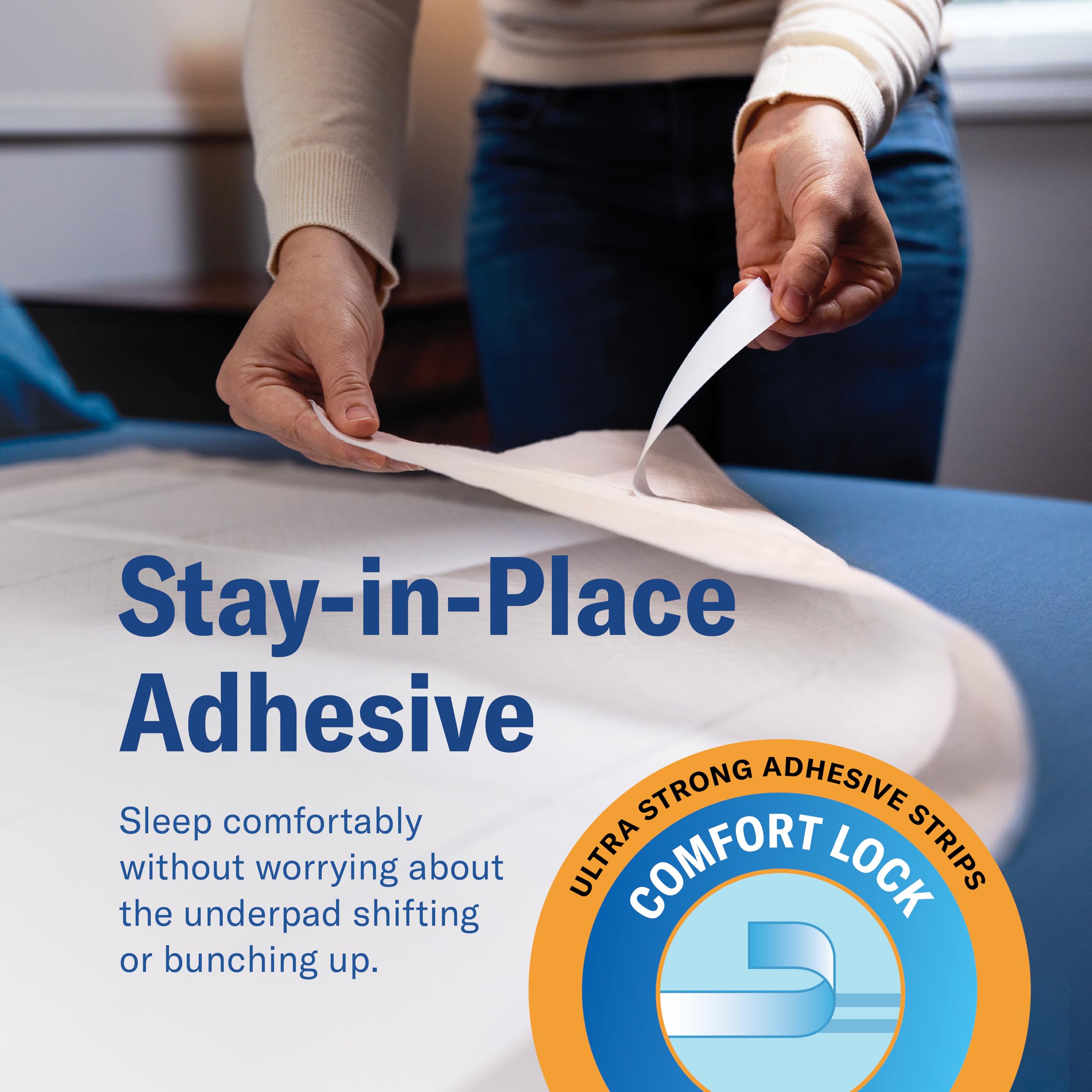 SECURE ADHESIVE STRIPS — Built-in adhesive strips keep each underpad firmly in place, preventing slips, bunching, or movement throughout the night — ideal for caregivers, elderly patients, or restless sleepers.