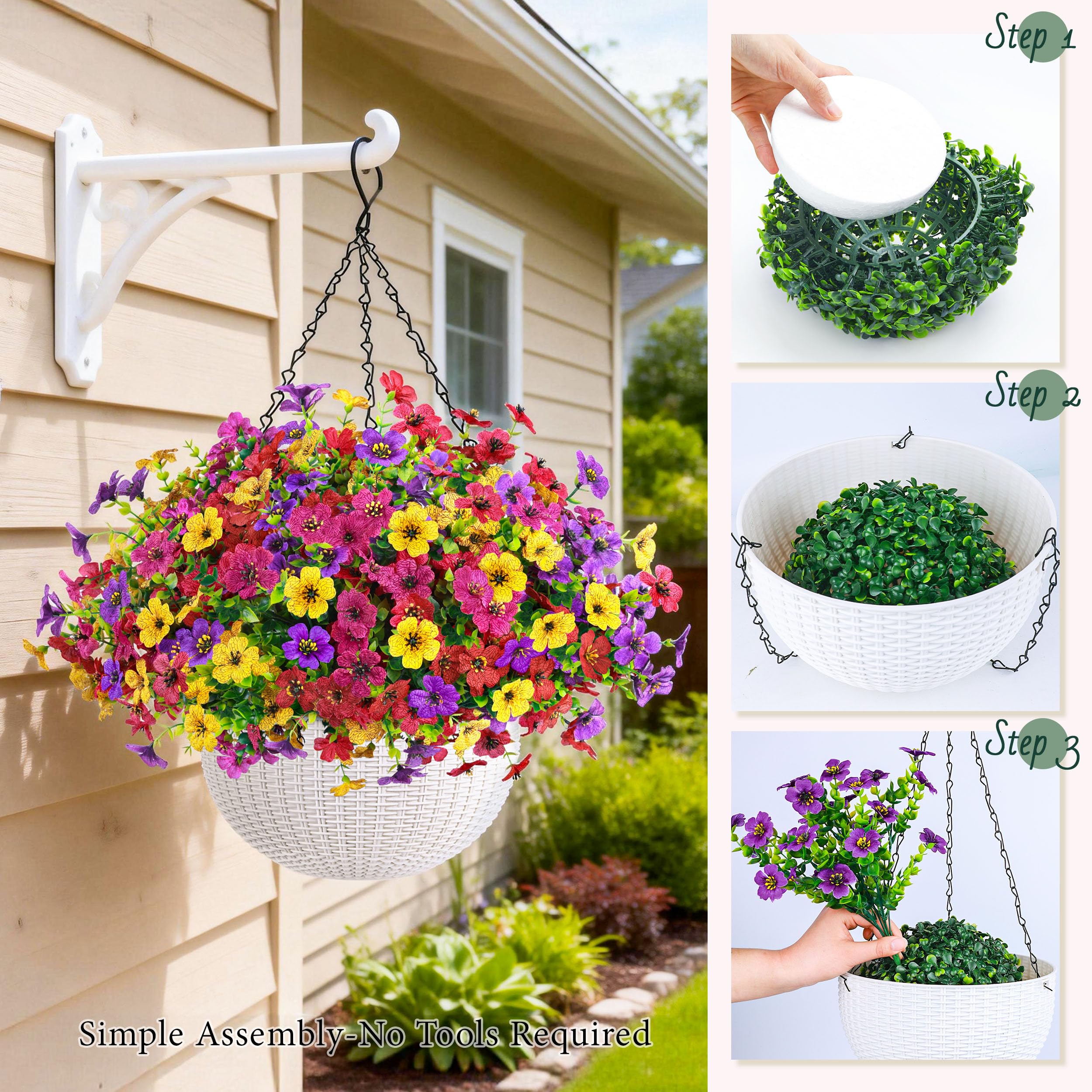 Realistic Hanging Flowers: This faux hanging plants outdoor in a white plastic basket with metal chains, with 12 bundles of colorful artificial plants outdoor, add a natural charm to any setting
