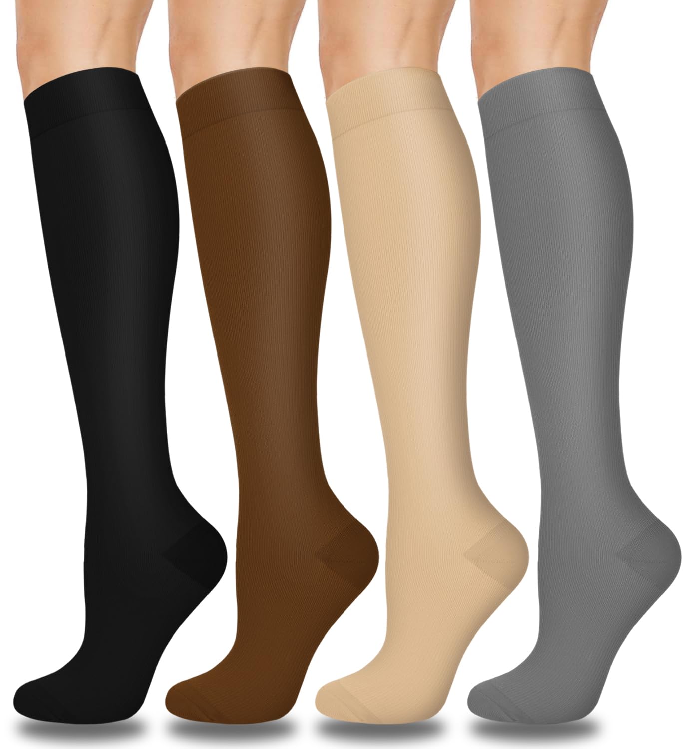 4 PAIRS OF UNISEX -Our compression socks are made up of high-quality Lycra fiber.The design is ergonomic to give ultimate comfort.You can best describe them in two words:flexible and durable. Affordable prices without sacrificing comfort, quality, and fashion.High performance material and temperature control,keeping your muscles cool during workouts and warm during rest.You can expect them to alleviate any mild leg pain and swelling that hinders a productive -free day.