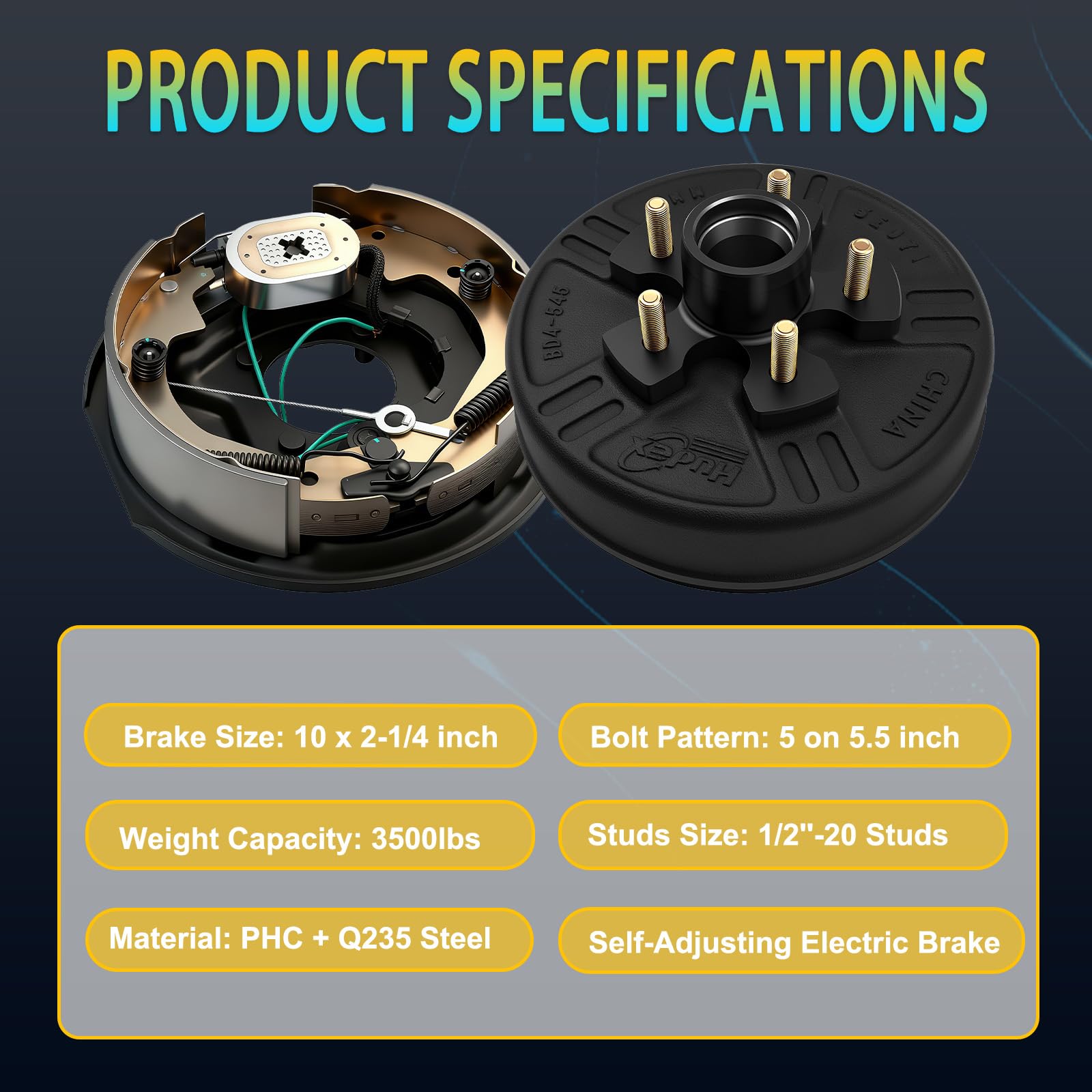 This trailer axle brake kit features a pair of 10" x 2-1/4" hub and drums with a 5-5.5" bolt circle, precisely engineered for secure wheel mounting. The stud spacing is 3" from center to center, ensuring accurate alignment and compatibility with most standard wheels.