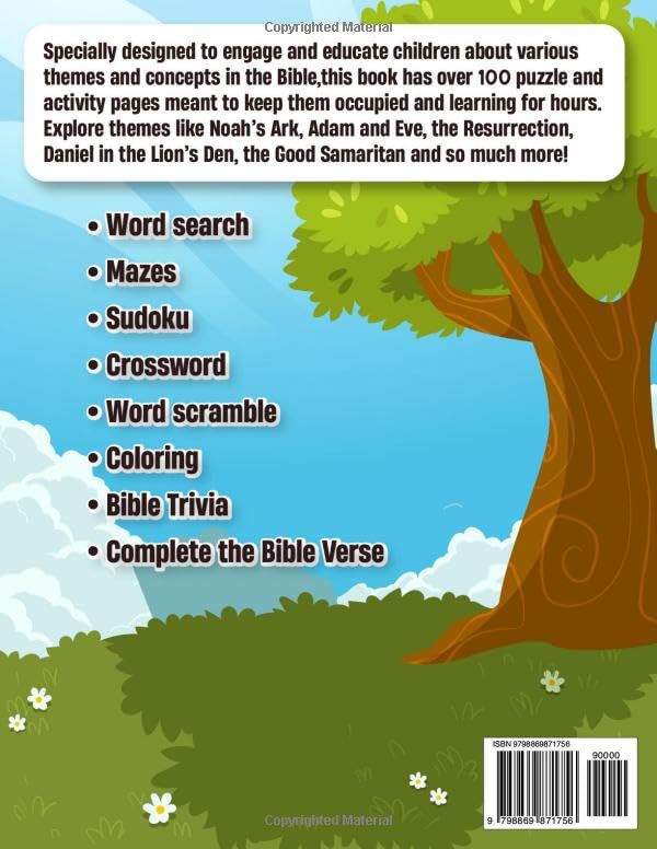 !!! NEW AND UPDATED - FEBRUARY 2026 !!! Help kids learn more about the Bible while having fun. Specially designed to engage and educate children about various themes and concepts in the Bible, this book has over 100 puzzle and activity pages meant to keep them occupied and learning for hours. Some themes in the book include Noah’s Ark, Adam and Eve, The Resurrection, Daniel in the Lion’s Den, The Good Samaritan and so much more! Features: Over 100 themed activities Single-sided coloring pages Bible references Solutions at the end of the book Get a copy today!