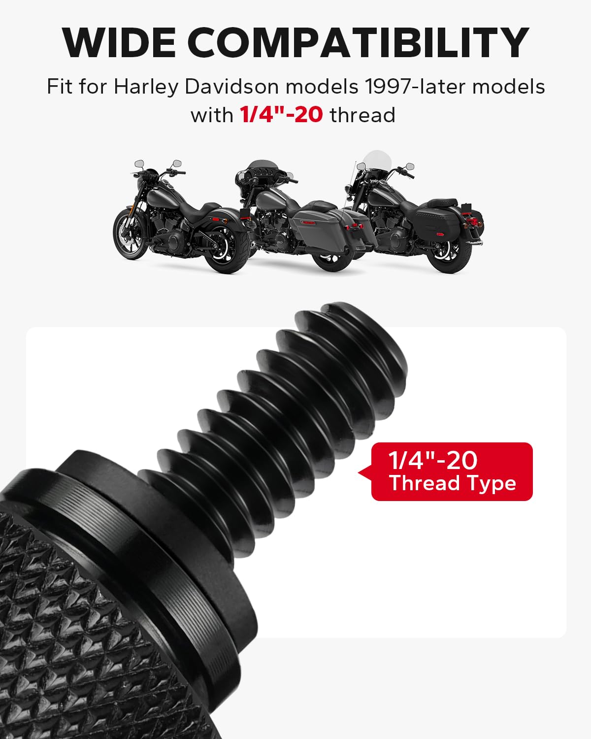 WIDE COMPATIBILITY. Amazicha aftermarket stainless steel seat bolts screw fit for 97-later XG, XL, Dyna, Softail (except 2012-2017 FLS models equipped with Former Equipment seat), Touring and Trike models equipped with SAE 1/4"-20 seat mount hardware. NOTE: Does not fit seats equipped with spring-loaded rear seat bracket