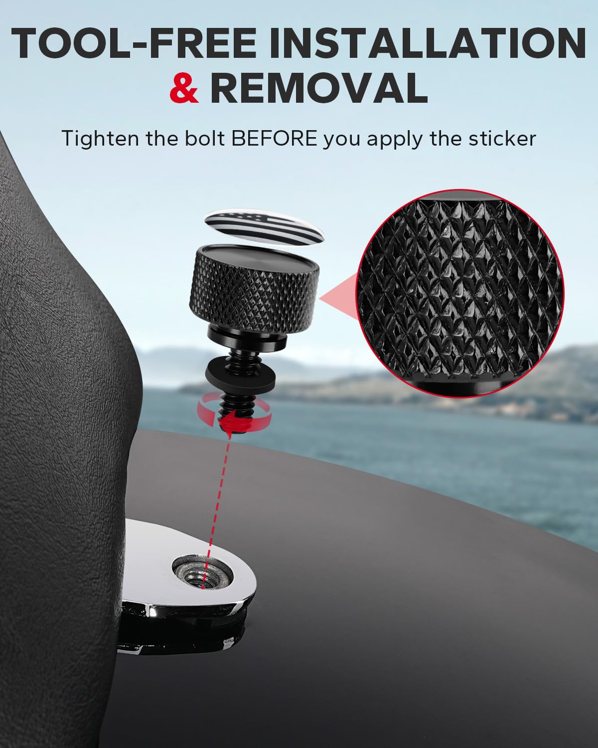 EASY TO INSTALL. Amazicha rear seat screw features knurled sides for easy grip and quick release, enabling tool-free installation and removal. Note: Please screw in the bolts before applying the sticker and make sure the pattern is facing the desired direction