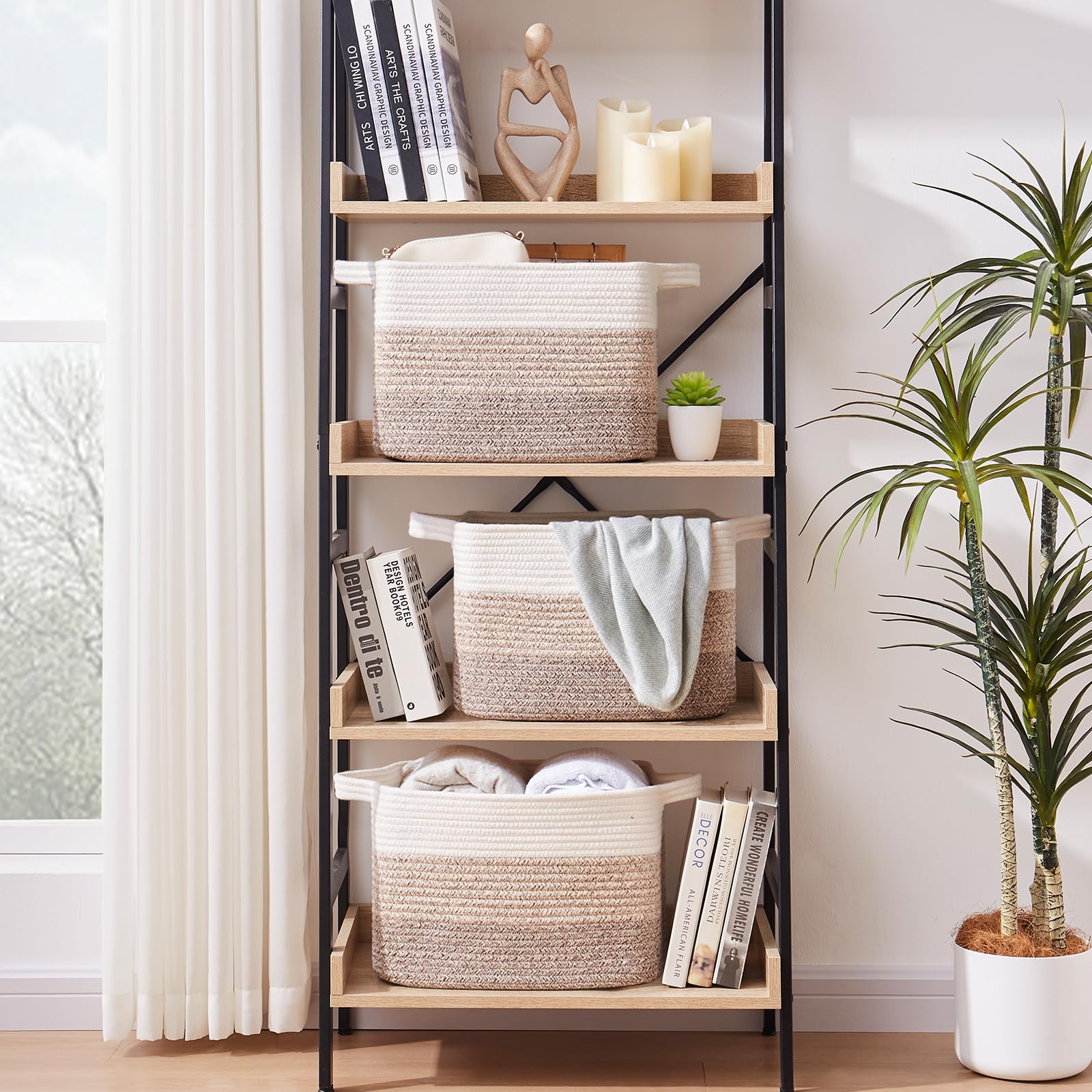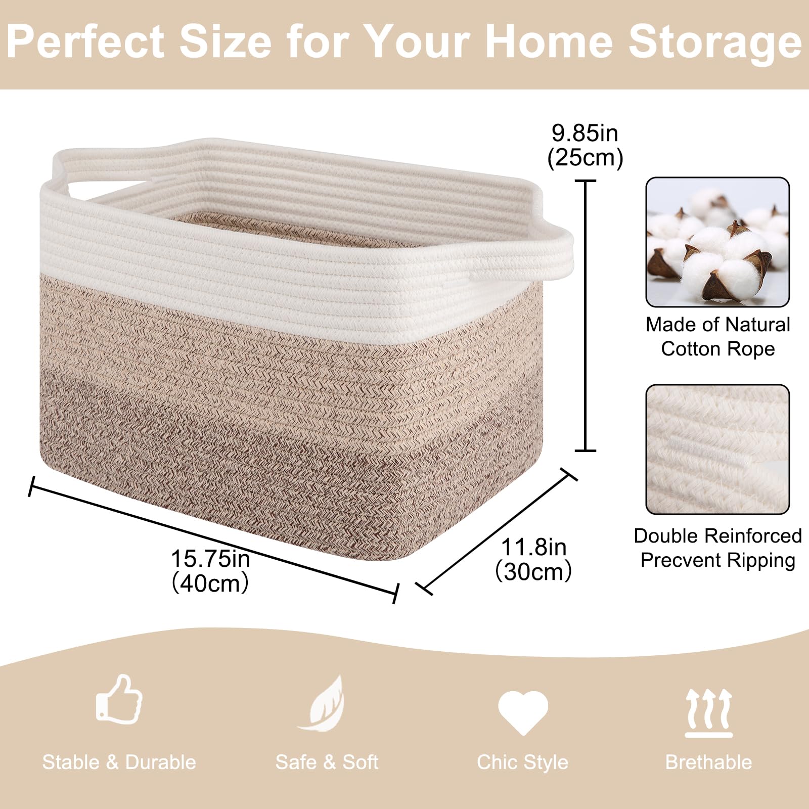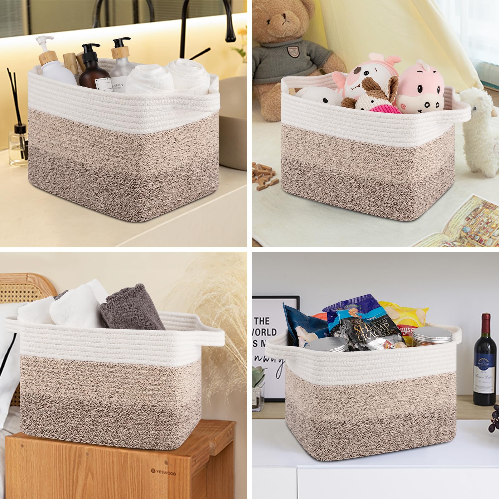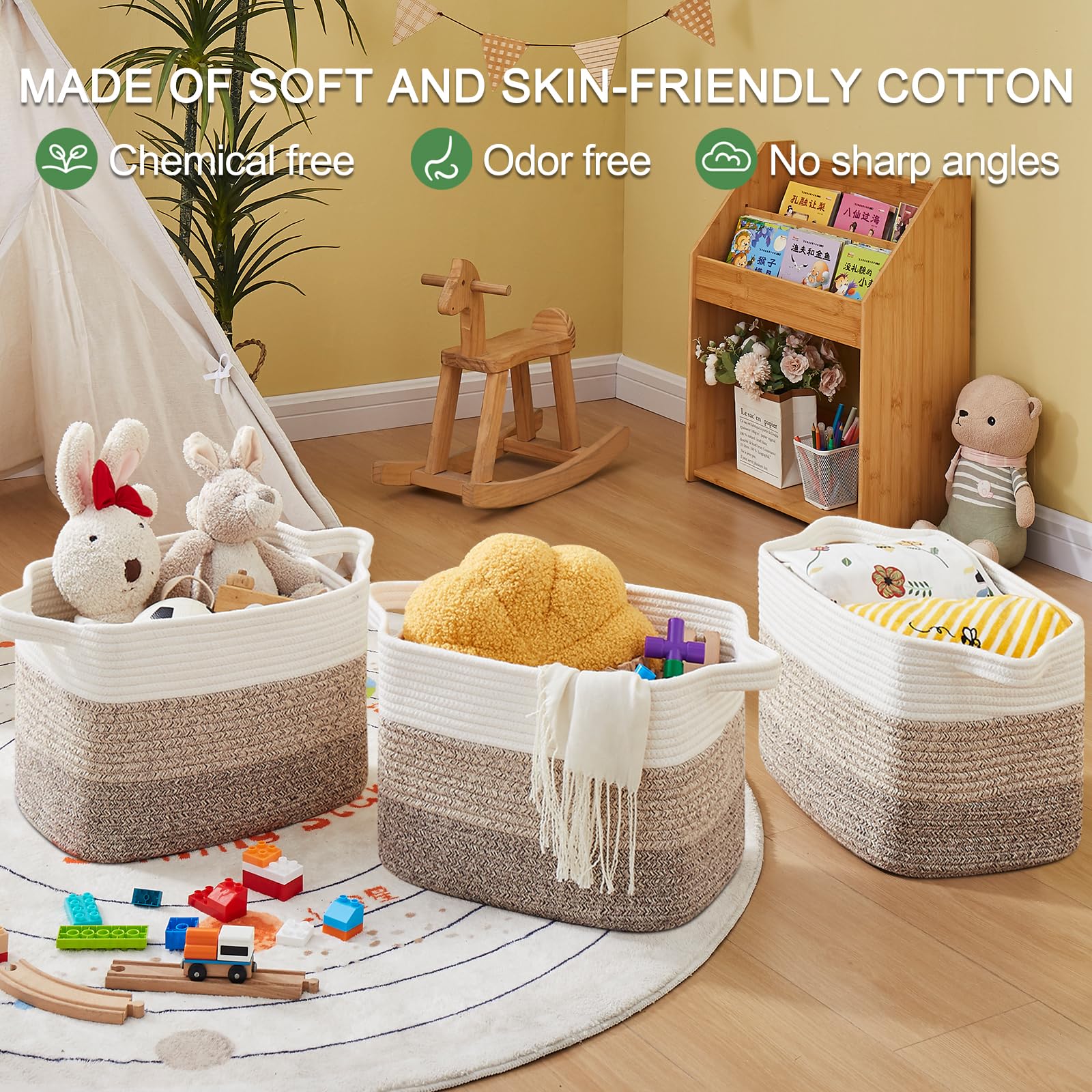 Soft and Durable: Our shelf baskets are meticulously handcrafted from high-quality natural cotton rope that's ultra-soft and durable. No odor or sharp corners, making it safe for babies, and won't scratch your furniture and floor. Ideal for nurseries and playrooms