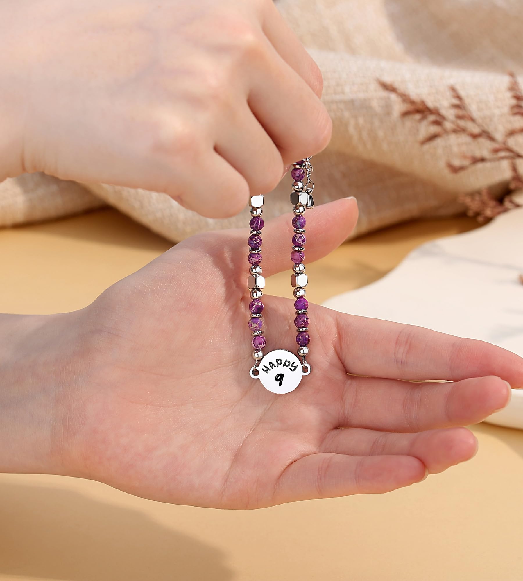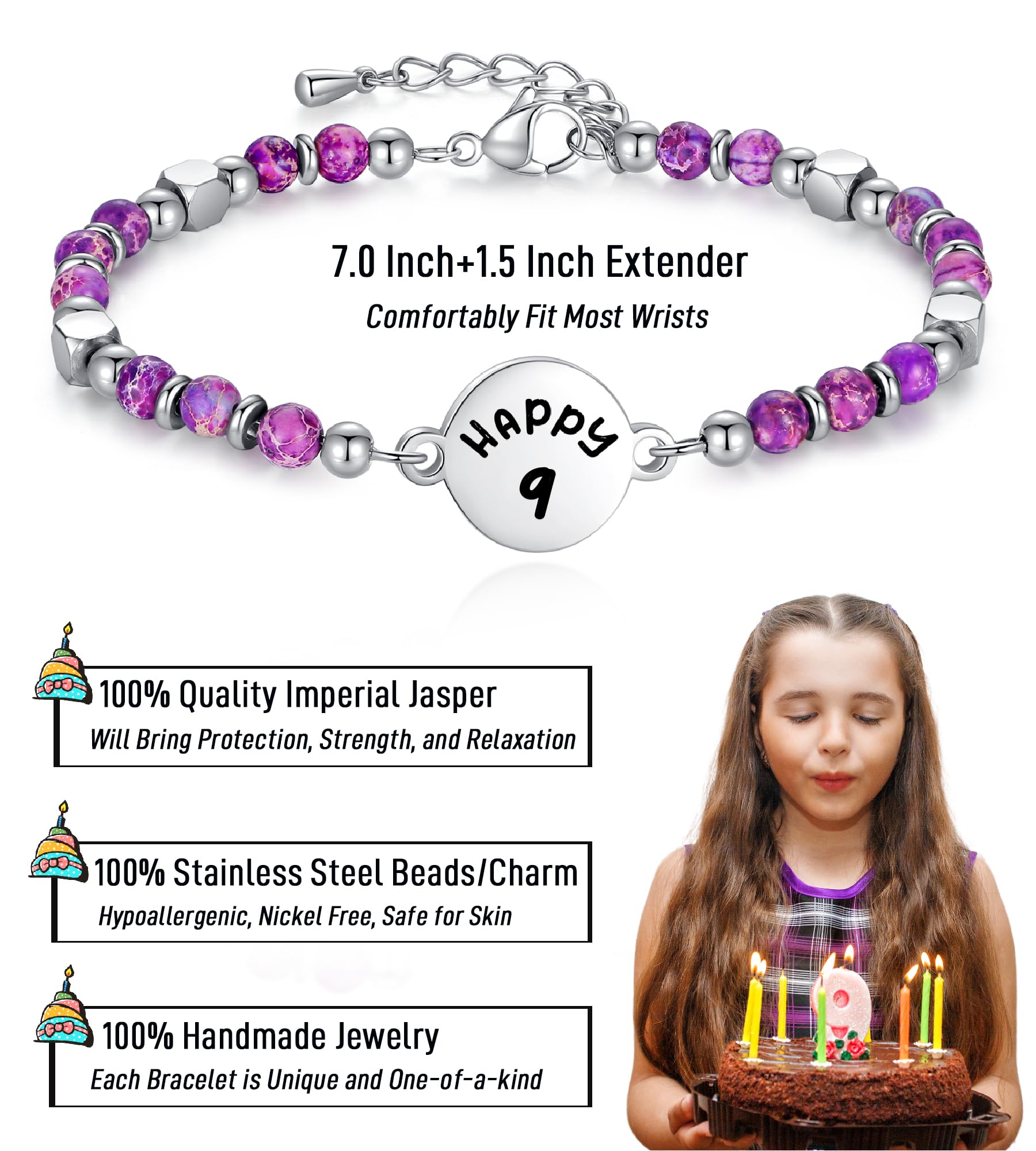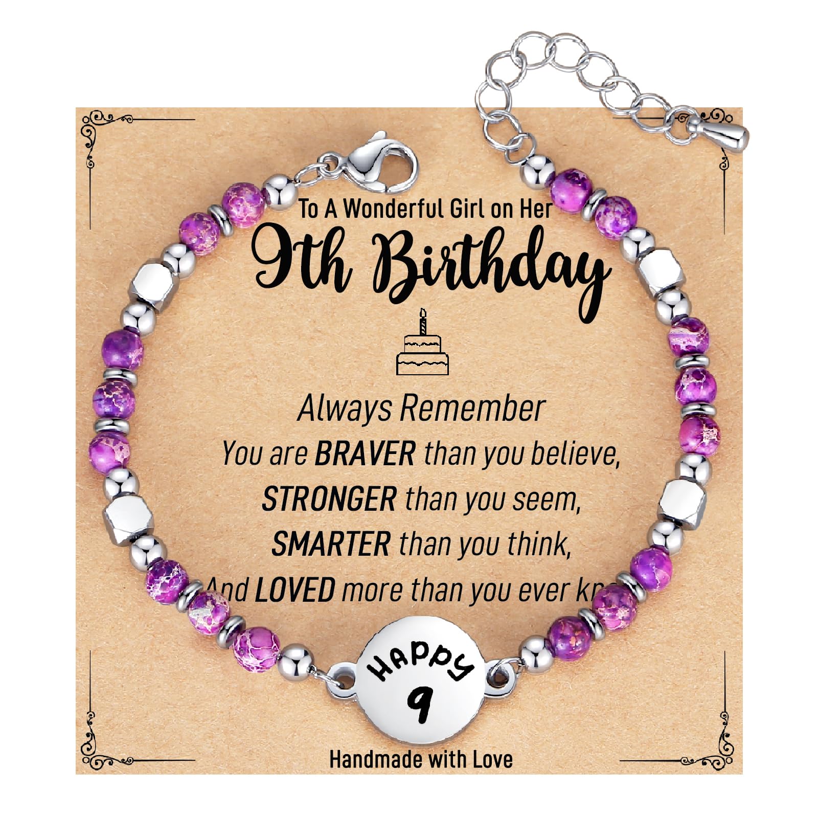 Birthday Bracelet for 9 Year Old Girl: Combination of tiny gemstones, stainless steel beads, and a sweet "Happy 7" charm, this pretty bracelet makes the perfect 9 year old birthday gifts due to its unique design and natural stone meaning. Imperial Jasper is said to bring peace, serenity, healing, and strength to your young girl. Celebrate her turning 9 with this cute bracelet, remind the sweet girl always remember that she is brave, strong, smart, and beautiful.