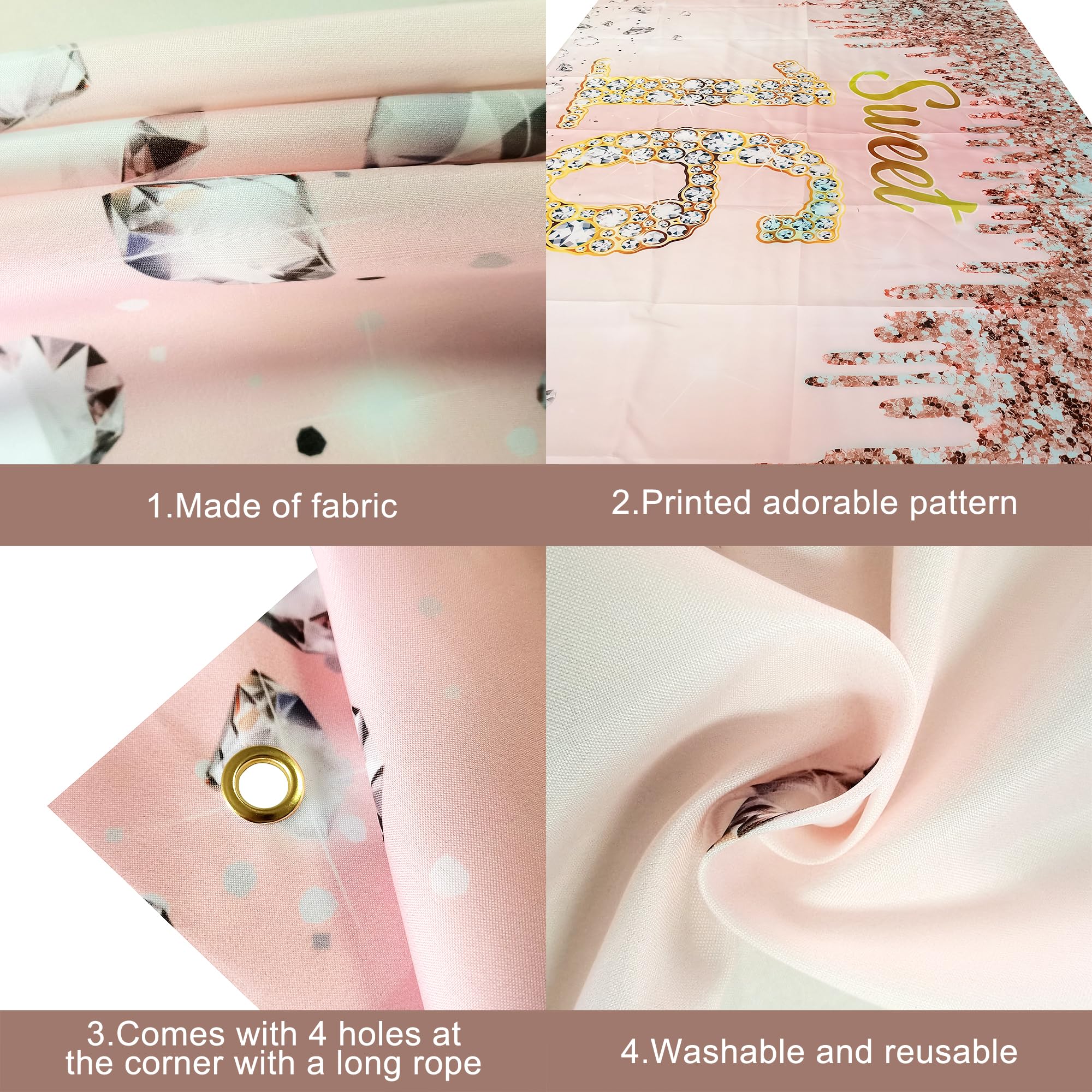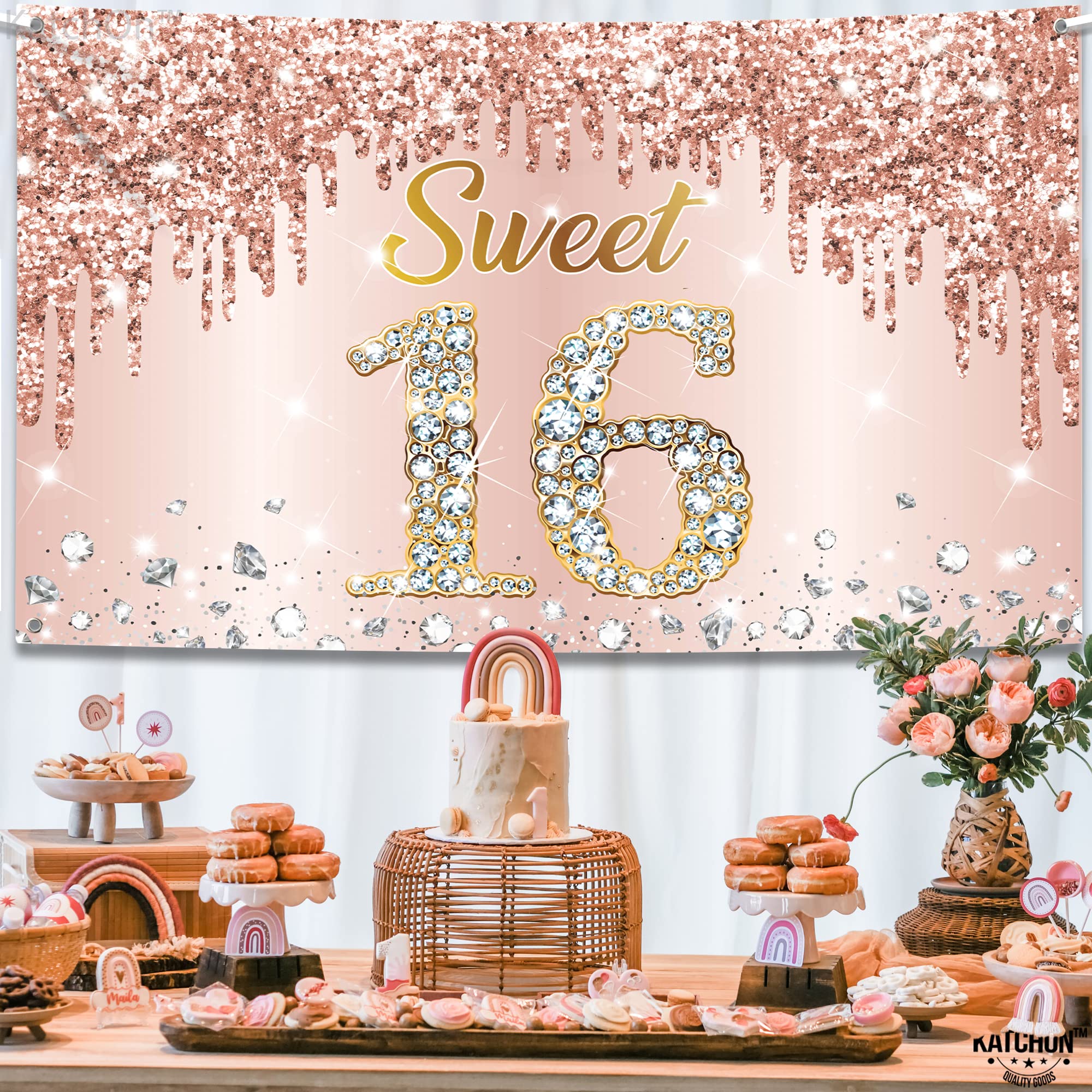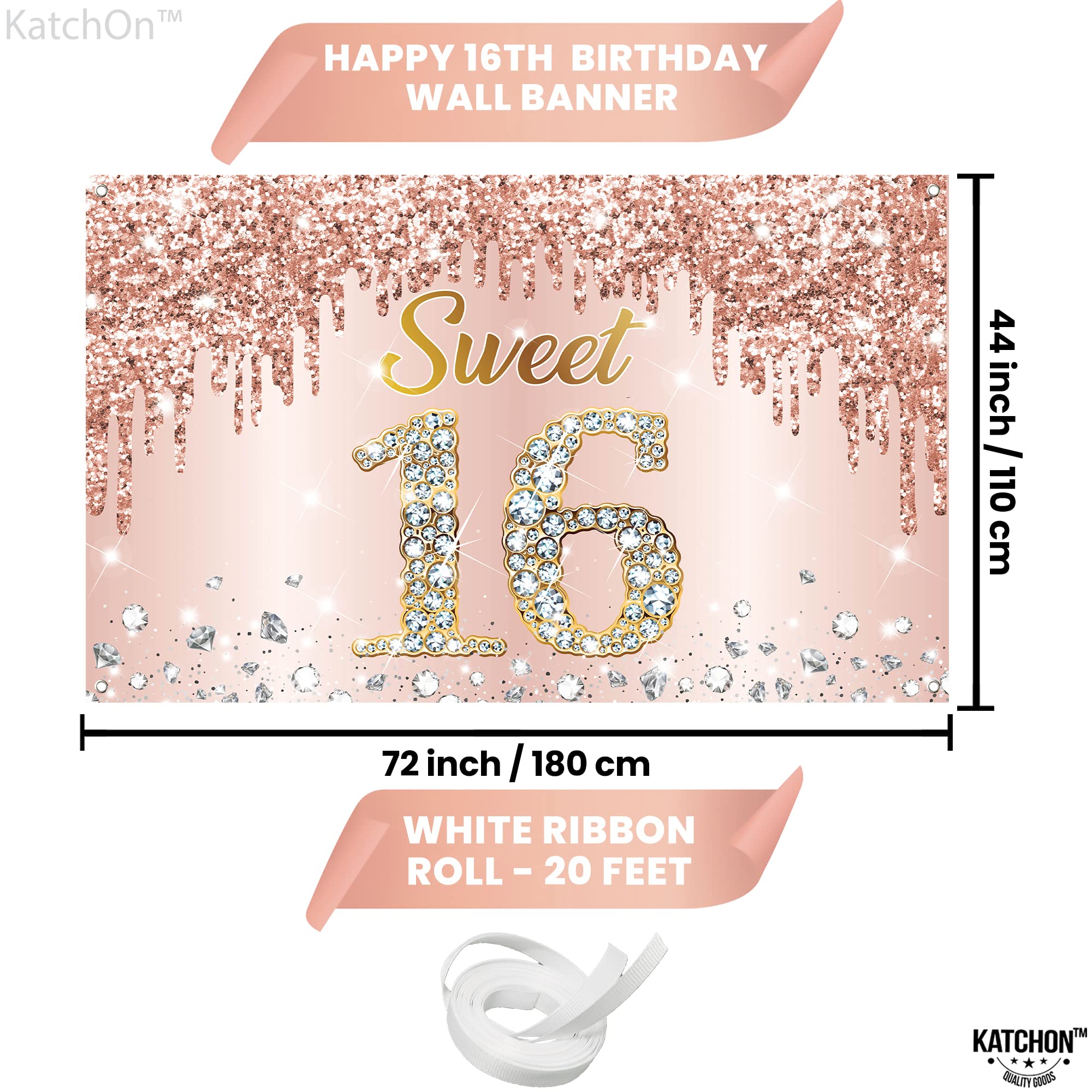 LARGE SIZE - 72 x 44 INCH | ROSE GOLD SWEET 16TH BANNER : Introducing the 72x44 inch Rose Gold Sweet 16 Backdrop Banner, sweet 16 party banner for your upcoming birthday party! This sweet sixteen party decorations, happy birthday decorations adds a touch of luxury and elegance, while the diamond accents, adding a touch of glamour and sparkle to the overall design, this makes rose gold sweet 16 banner a perfect for a sweet 16 birthday decorations. Our vibrant Sweet 16 decorations for girls, sweet 16 background, happy sweet 16 birthday banner, sweet 16 pink backdrop will make your celebration unforgettable.