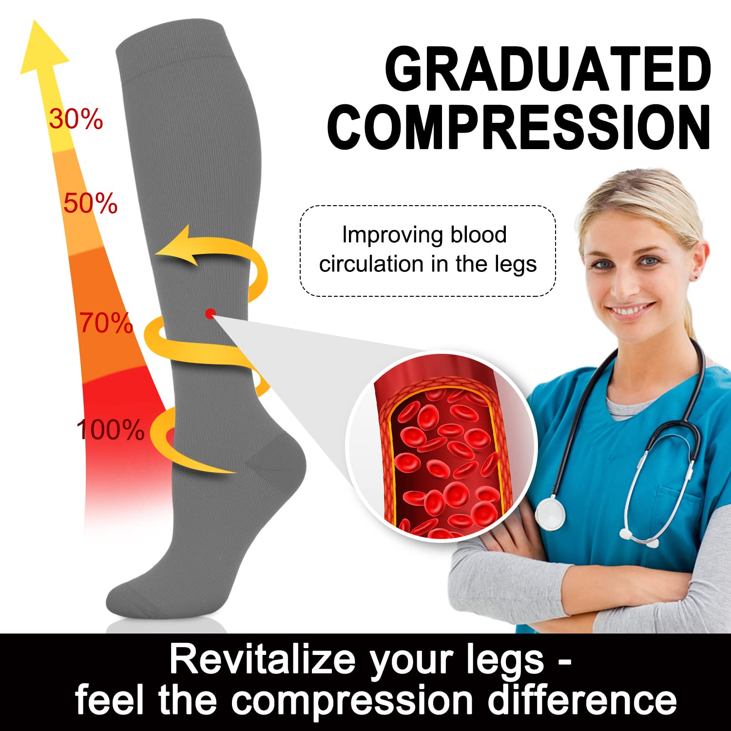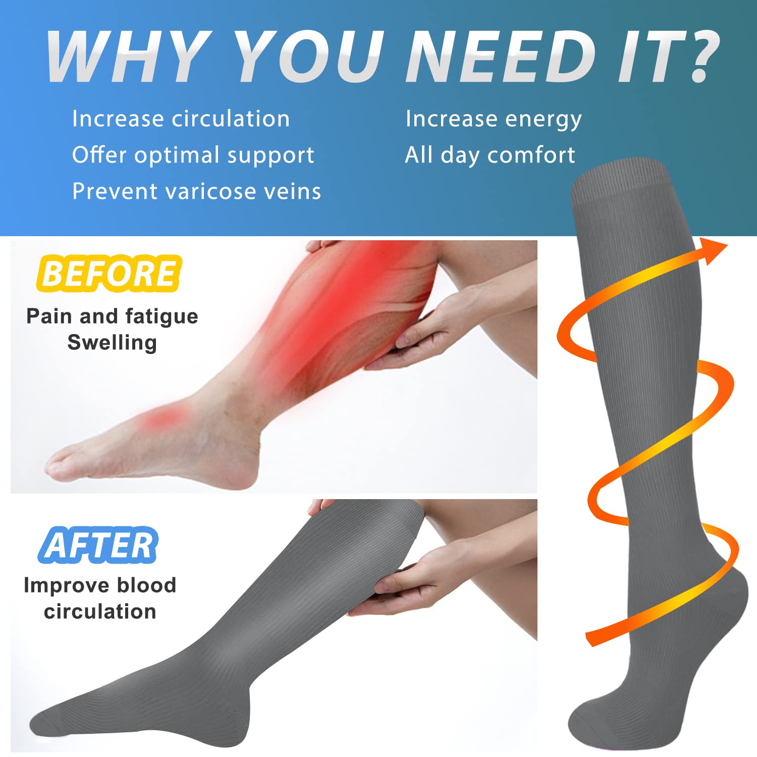🆕【ENERGIZE YOUR LEGS】-- Compression socks have been shown to help decrease swelling and pain in the legs and ankles. Graduated compressions' whole purpose is to increase circulation, thus improving sports levels in the body. Another benefit of improving circulation is decreasing swelling and fluid retention. Increased circulation decreases swelling and increases blood flow, this reduces the feeling of heavy and achy legs.