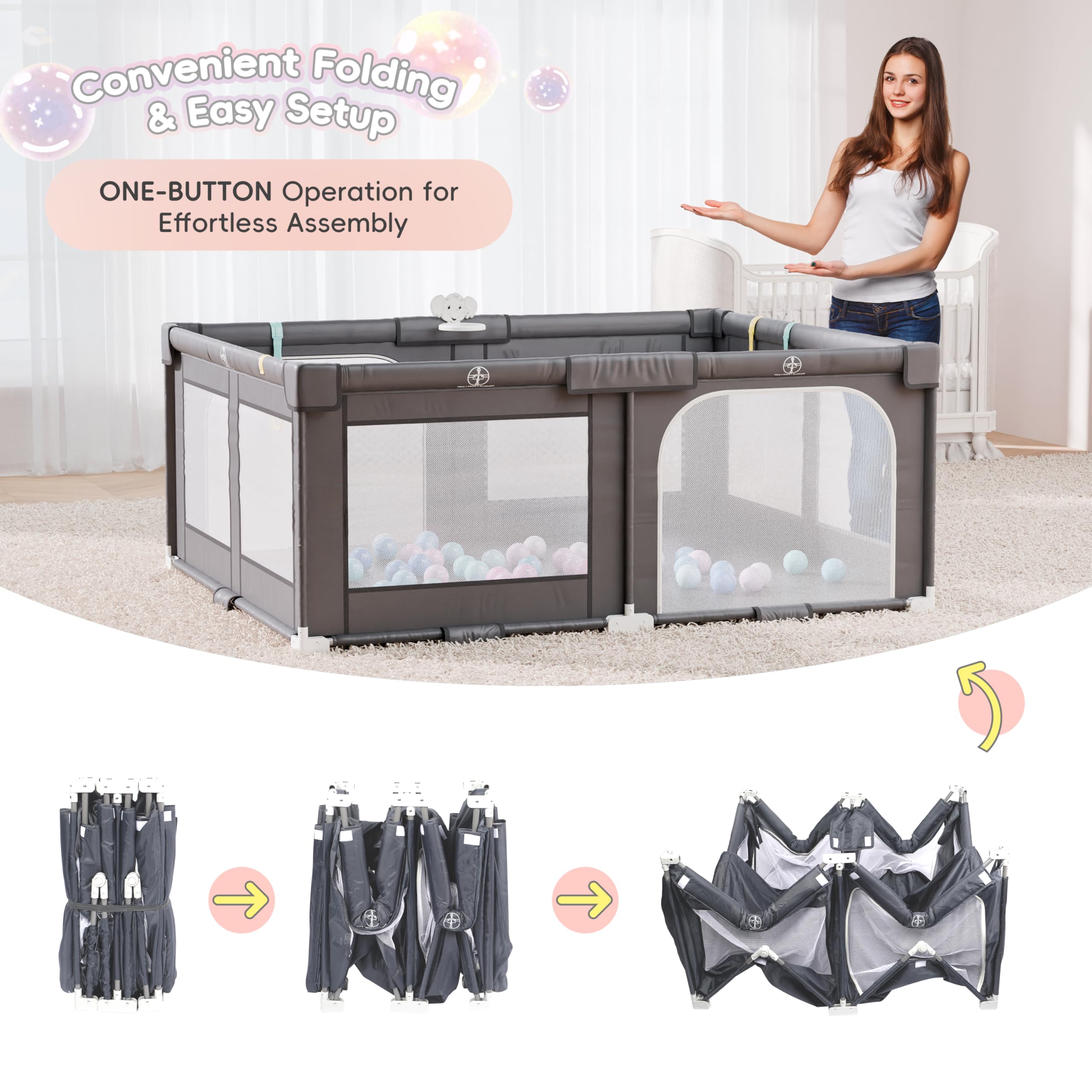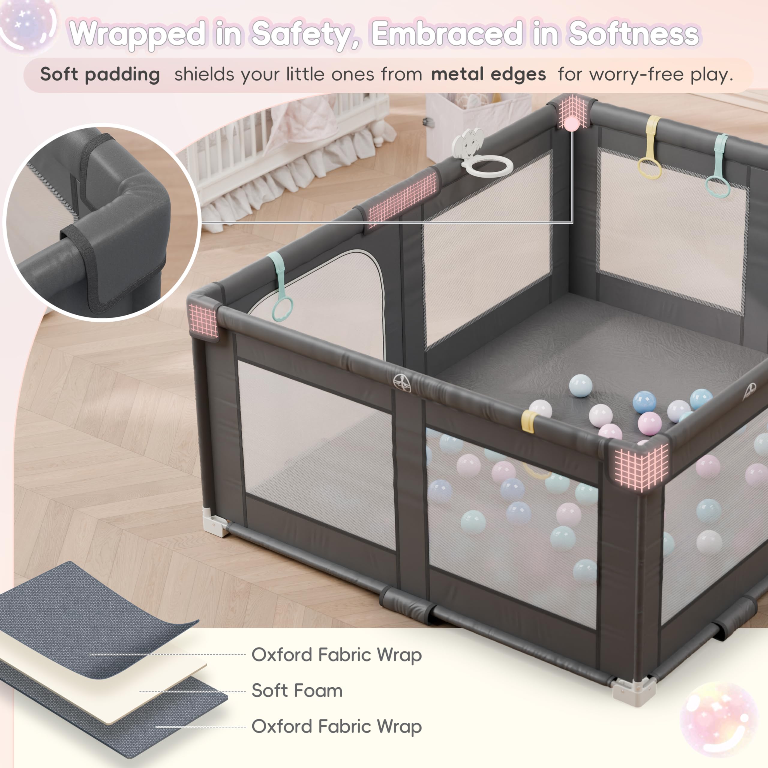 【Spacious & Versatile Play Area】Our Extra large baby playpen measures 72”x59”x29.5”, offering ample space for your baby to crawl, play, and explore. The large size ensures parents can comfortably join in the fun. Equipped with a variety of accessories including 50 colorful ocean balls, 4 hand grips, and a basketball hoop, it provides endless entertainment. It's also a perfect solution to keep your baby safe from pets while allowing you to take a restful nap with them during the day.