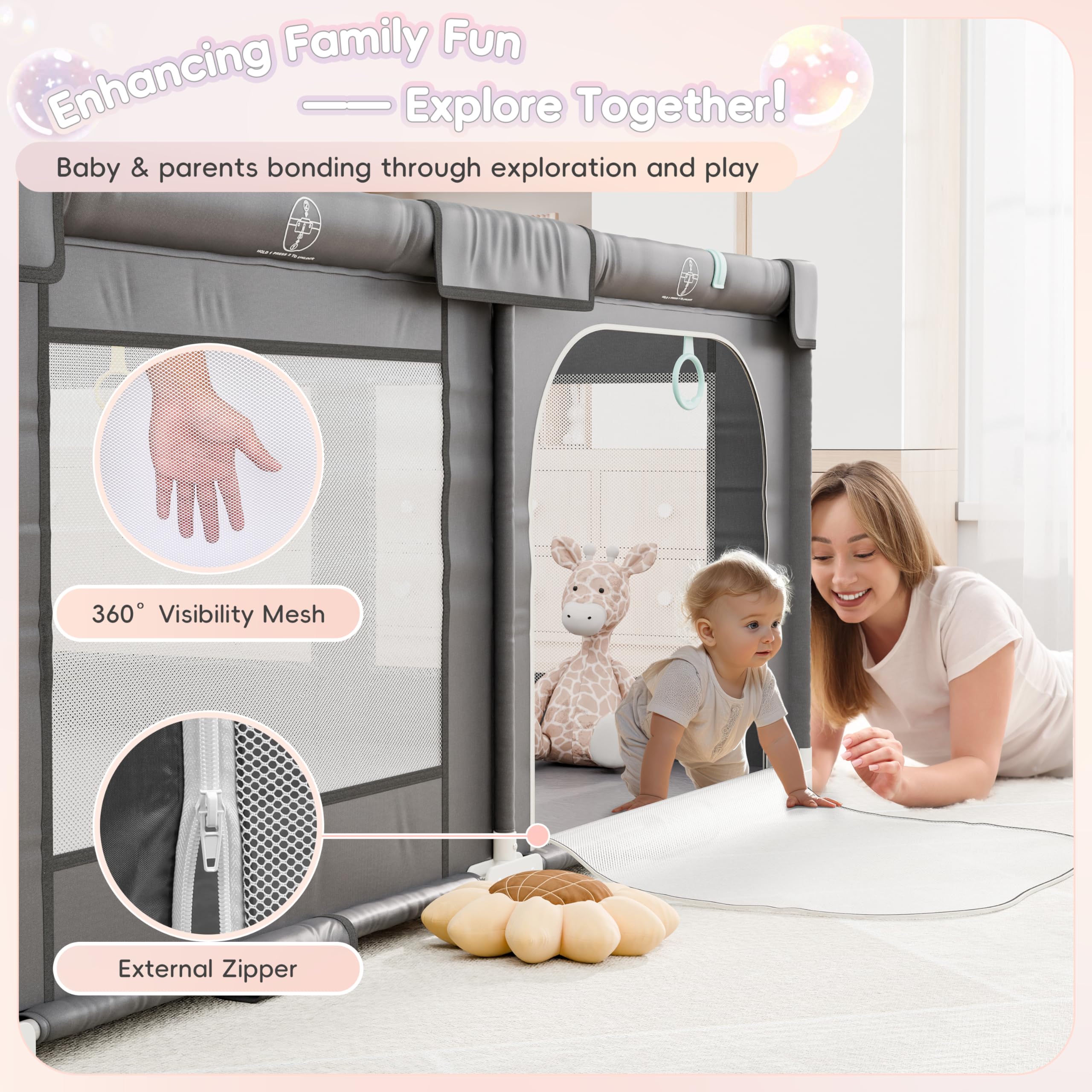 【Easy to Assemble & Fold Up】Setting up our foldable playpen is a breeze with its One-Piece Locking Joints. No more struggling with multiple pieces; simply open, pull up, and secure the locking mechanisms. To fold, just press a few buttons, and this spacious playpen becomes compact and portable, perfect for travel or storage. Its ease of assembly and portability make it an ideal travel companion for your baby.