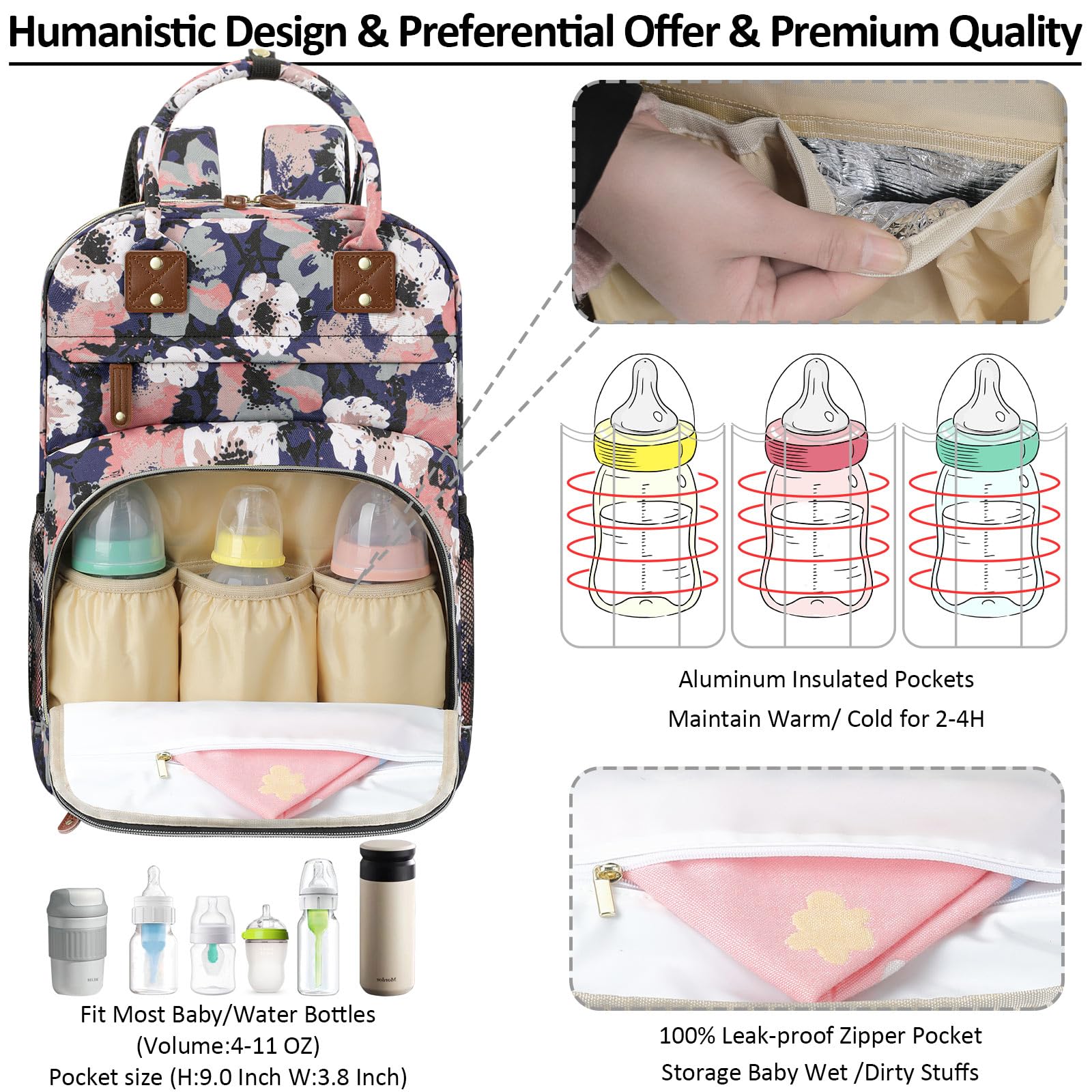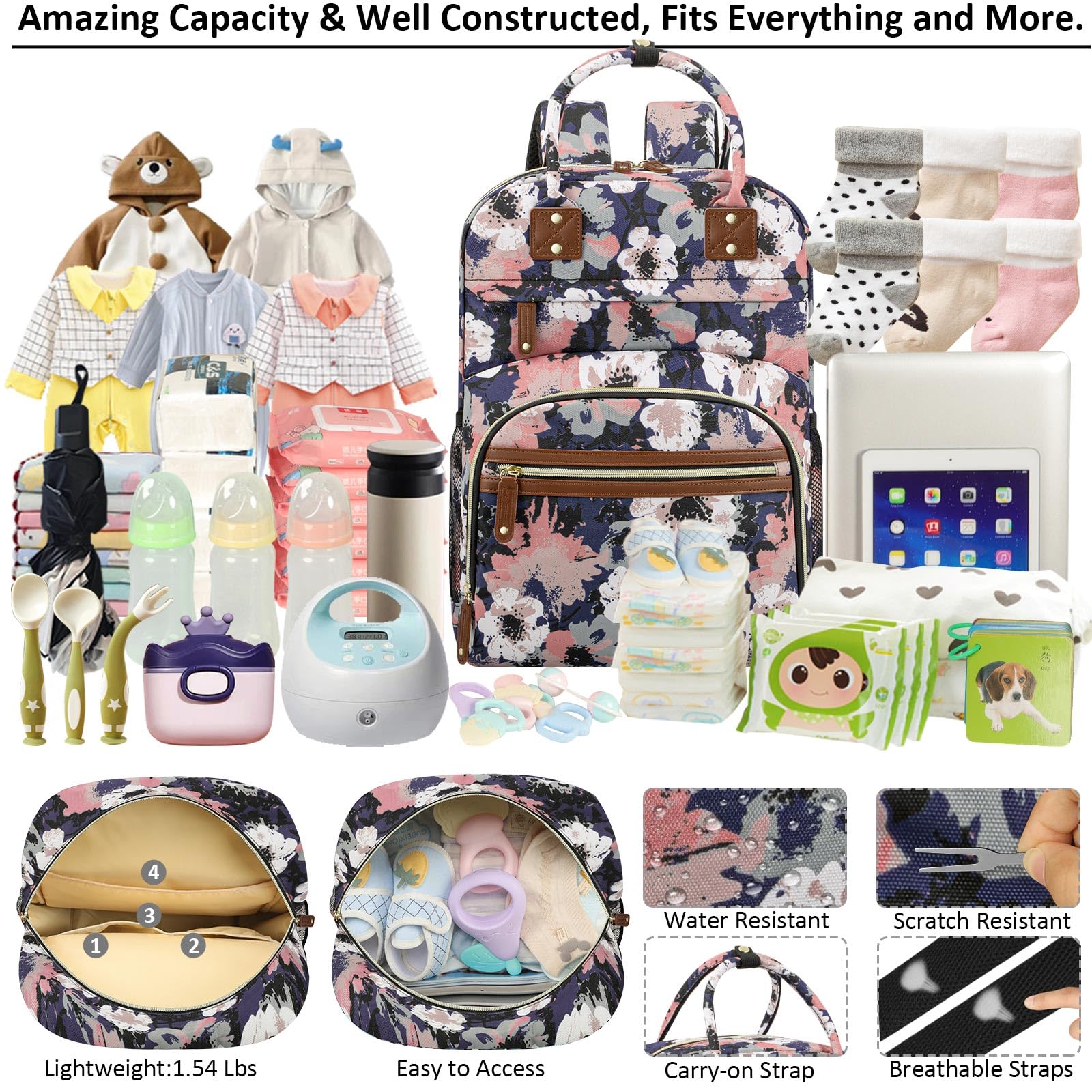 Impressed With Overall: Tenot baby backpack diaper bag only 1.54 lbs, but comes with 10 pockets and spacious to keep diapers, breast pump, wipes, formula, toys, cell phones, baby bottles, books, laptop, clothes well organized; The quality is top-notch, strong zipper, sturdy stitching, detachable stroller straps; Especially has 3 insulated bottle pockets to keep warm/cold 2-4 H; This makes diaper bag purse very durable and will not easily fall apart; A good bet baby boy baby girl diaper bag