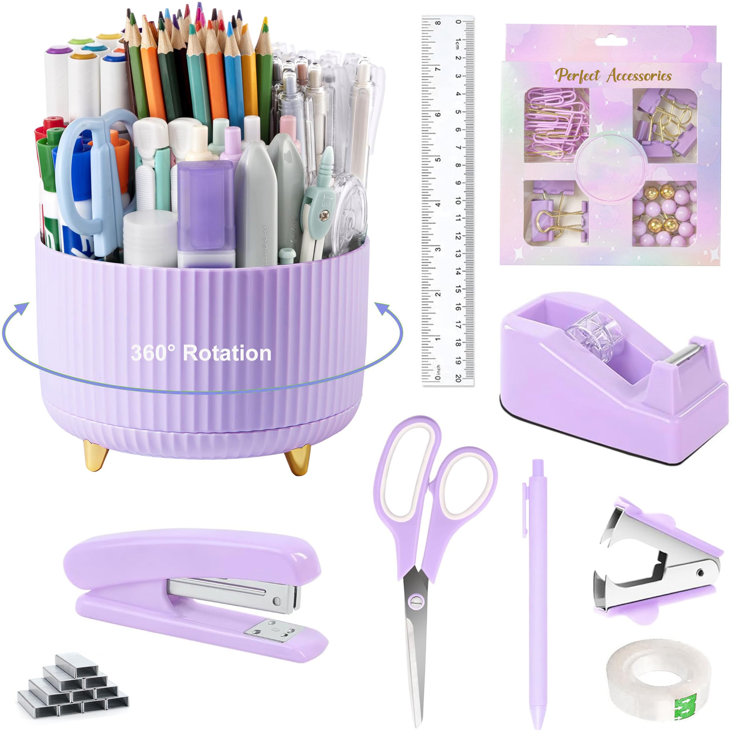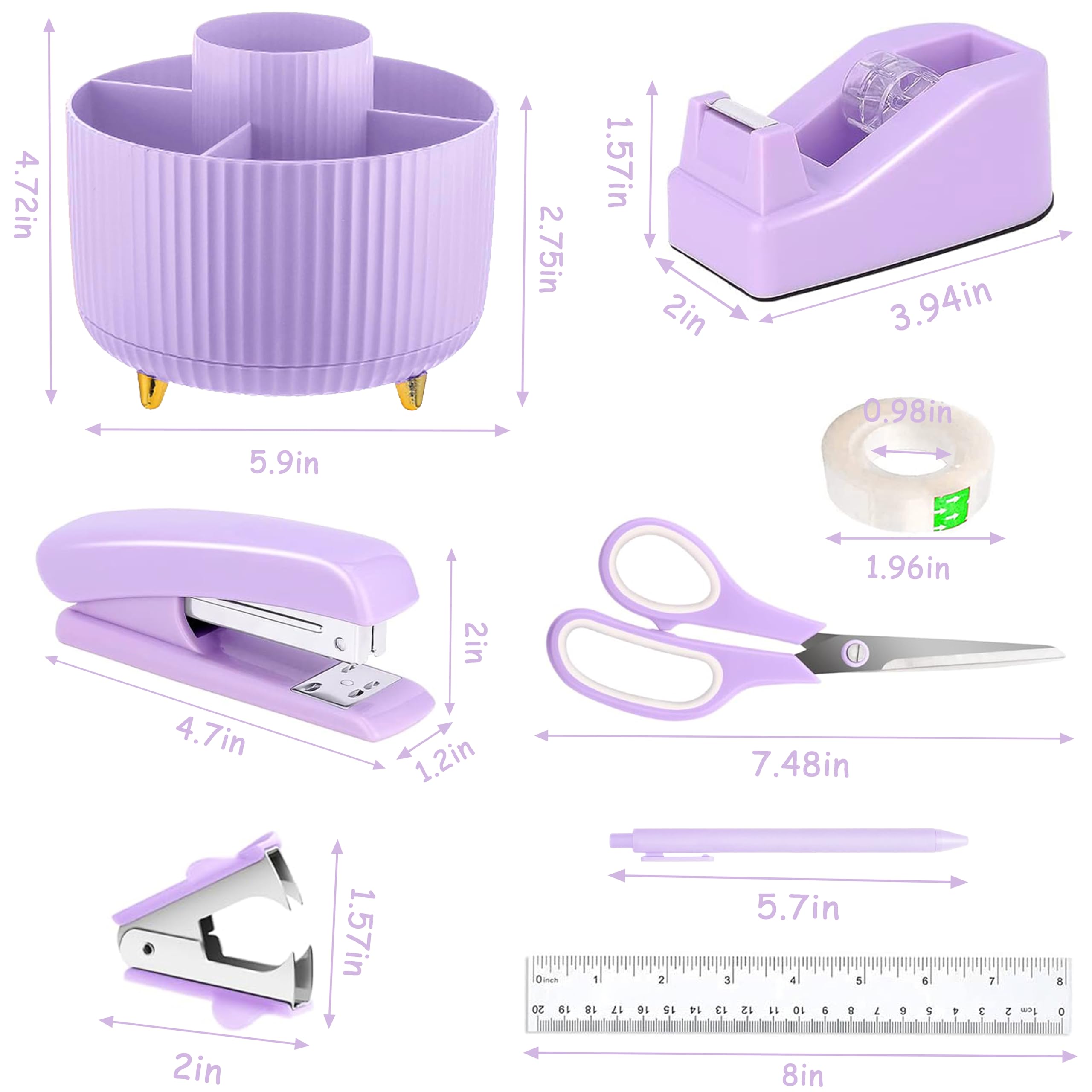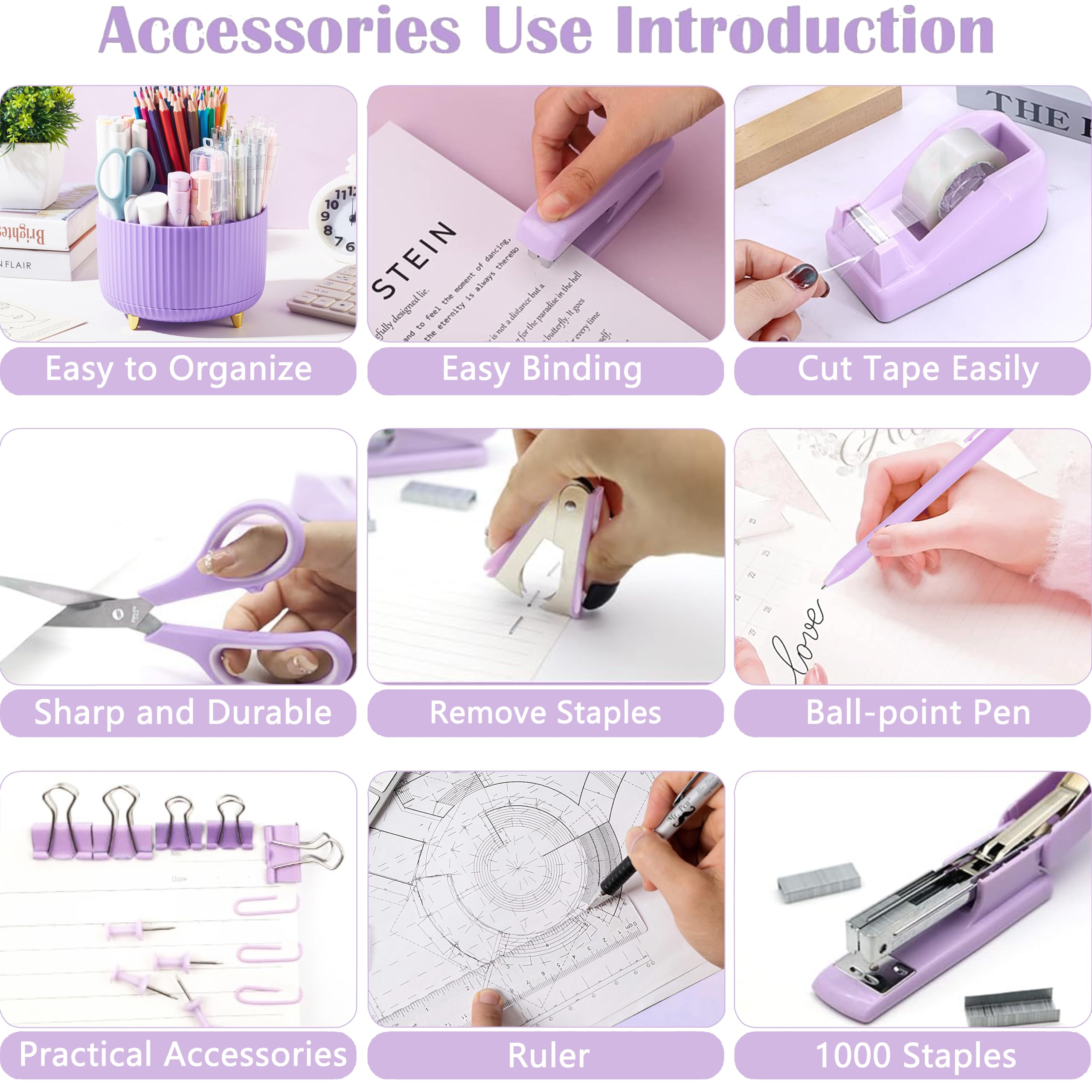 【Package Includes】10pc purple office supplies for desk includes 1 Pencil Holder For Desk, 1 Tape Dispenser, 1 Stapler, 1 Staple Remover, 1000 Staples, 1 Tape, 1 cute 4-grid Clips Set(including 40 paper clips, 3 large binder clips, 5 small binder binders, 25 thumbtacks), 1 Ruler, 1 Scissor, 1 Ballpoint Pen. Our office accessories can meet your daily office and study needs